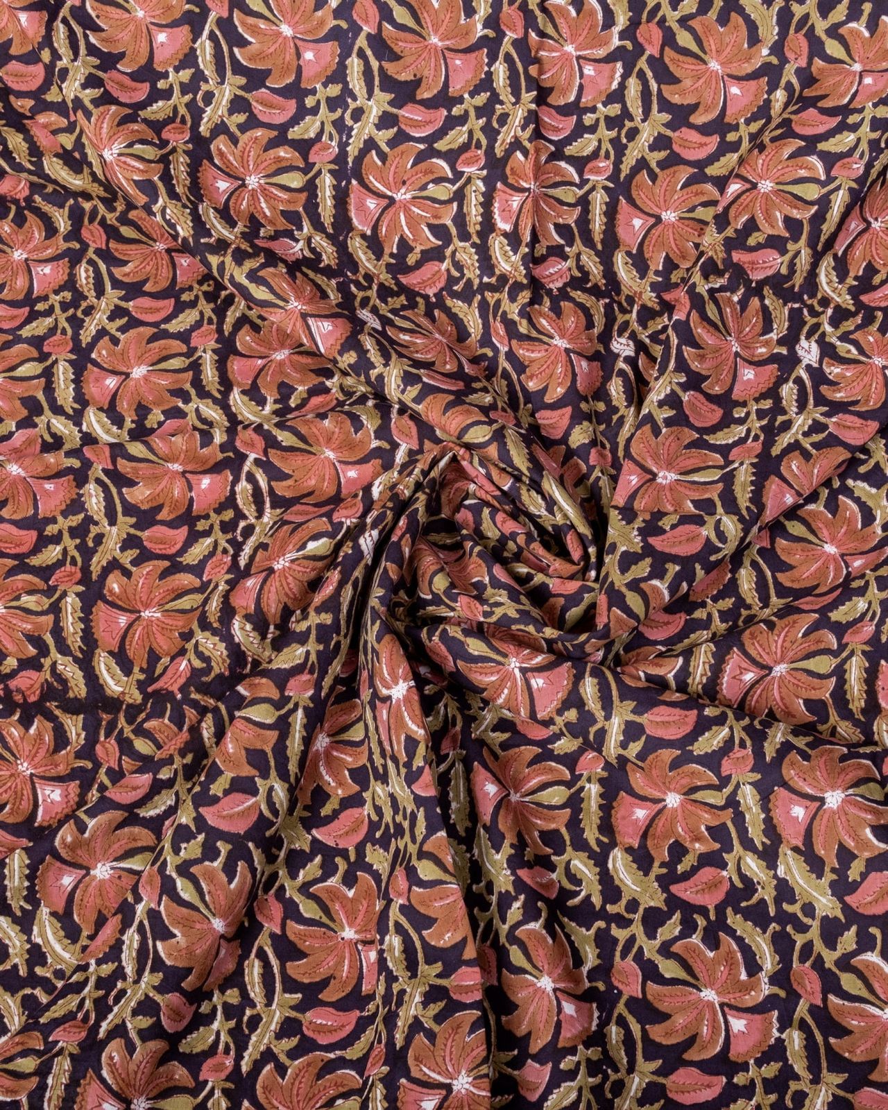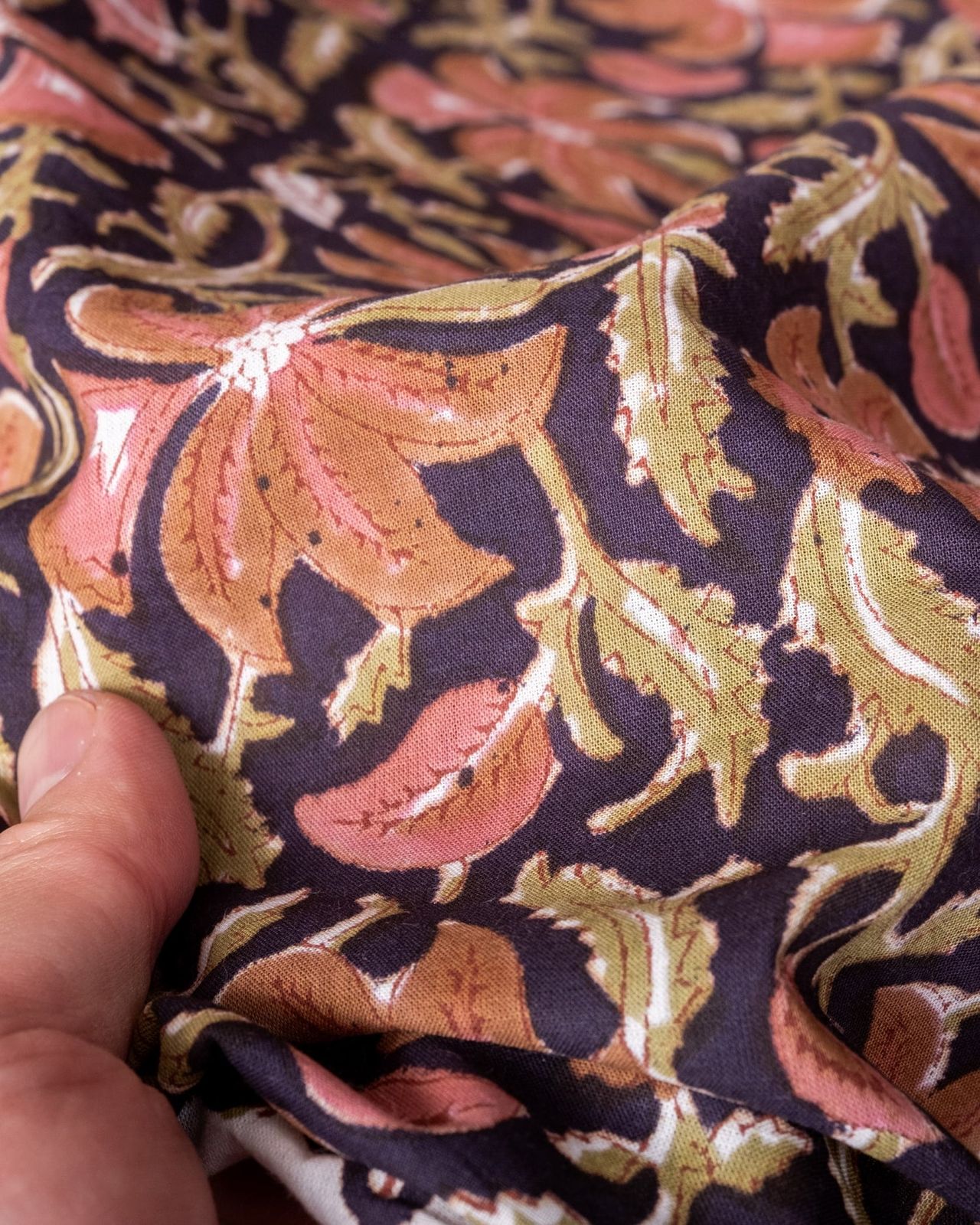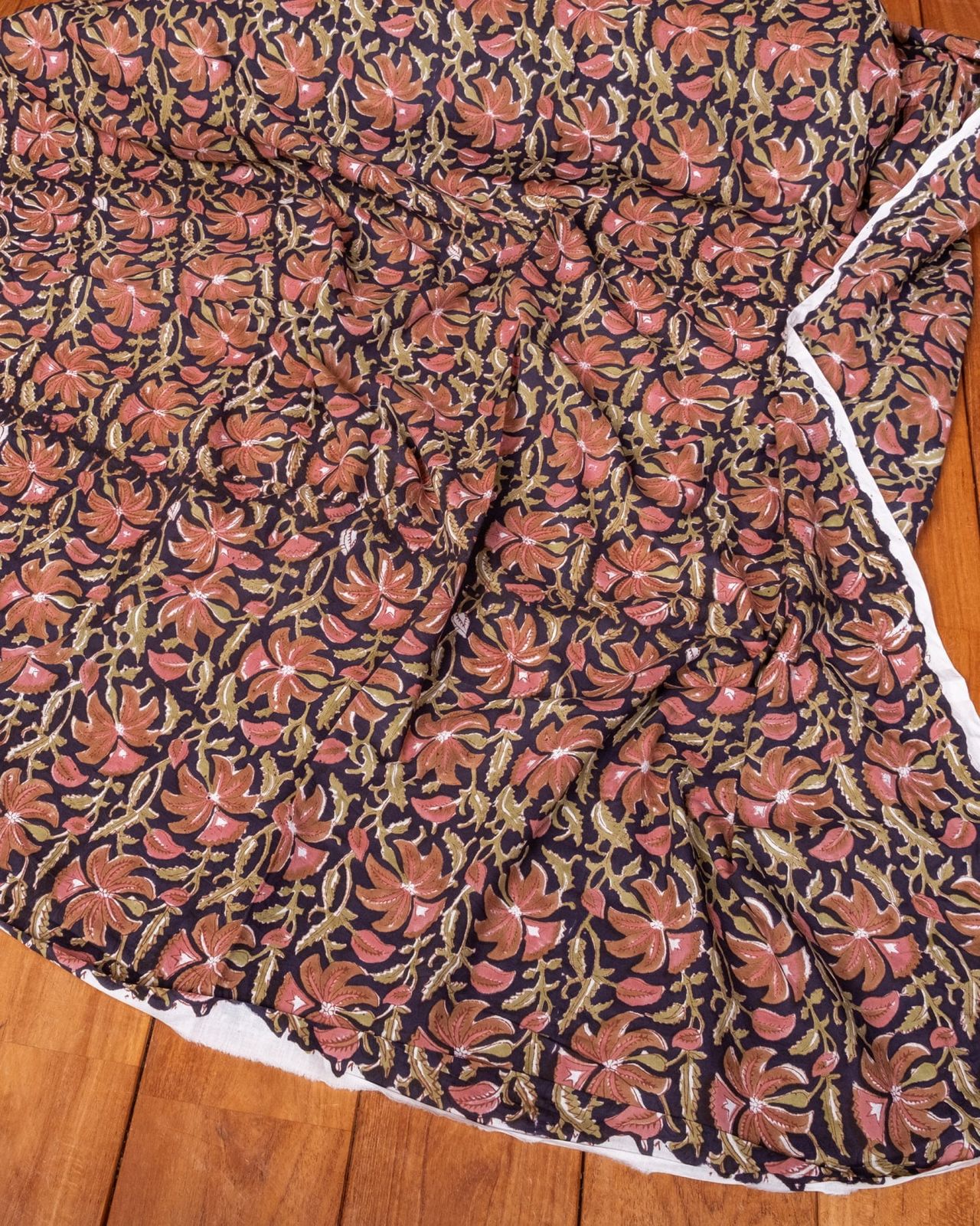 木版染めとは、ウッドブロック(木版)を用いて一つ一つ模様を染めこんだ優雅で贅沢な仕上がりの布です。大量生産には向かない、非常に時間のかかる丁寧な手仕事の賜物といえます。インドは美しい布の宝庫ですが、その中でも特に素敵な一枚に仕上がっています。