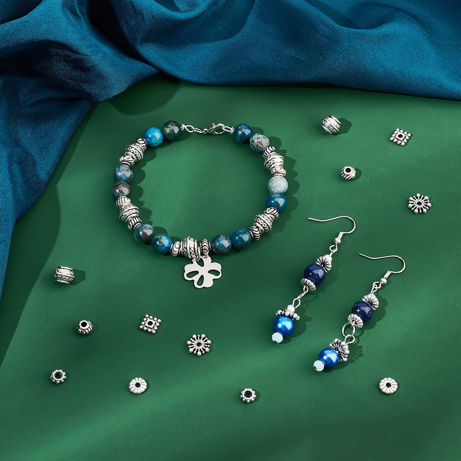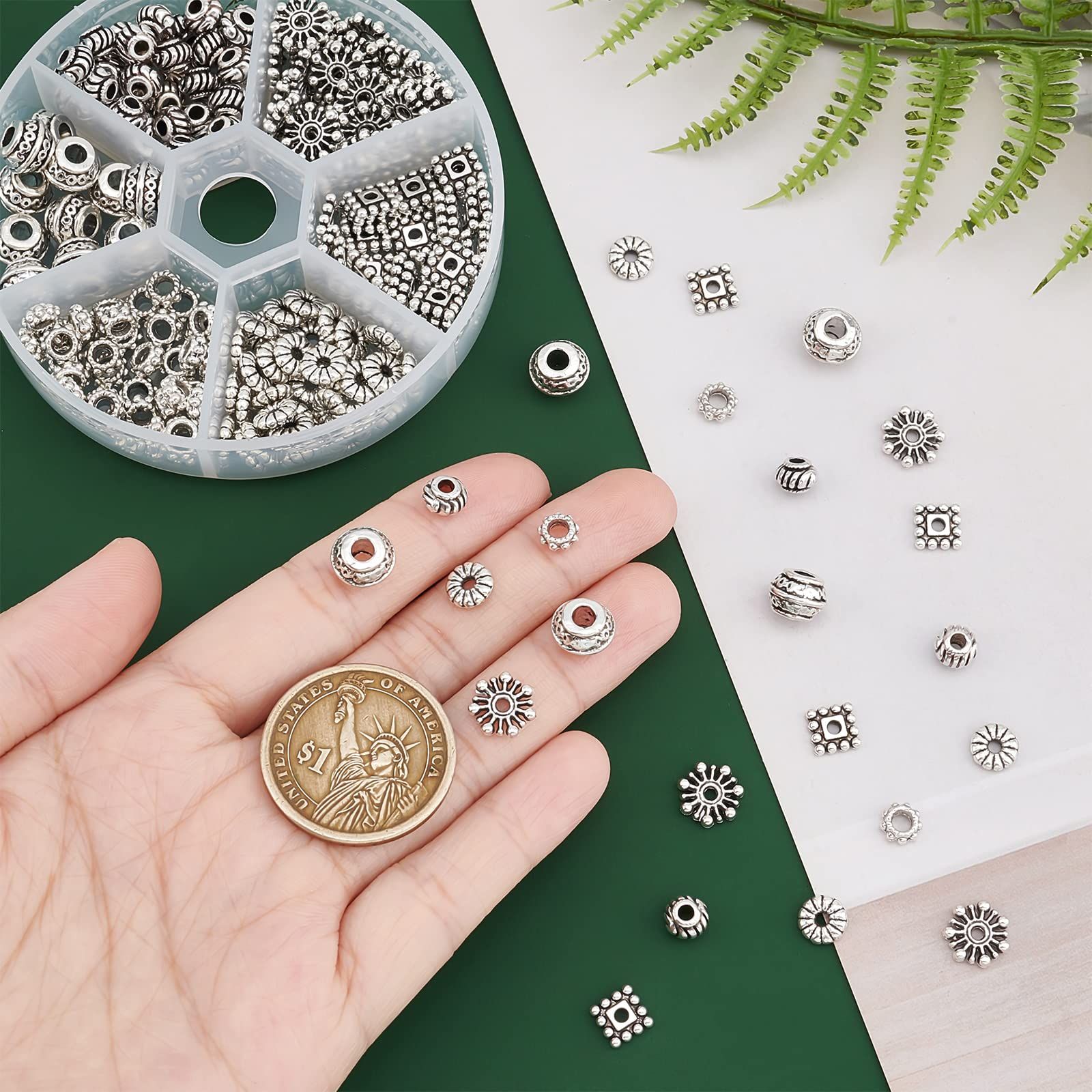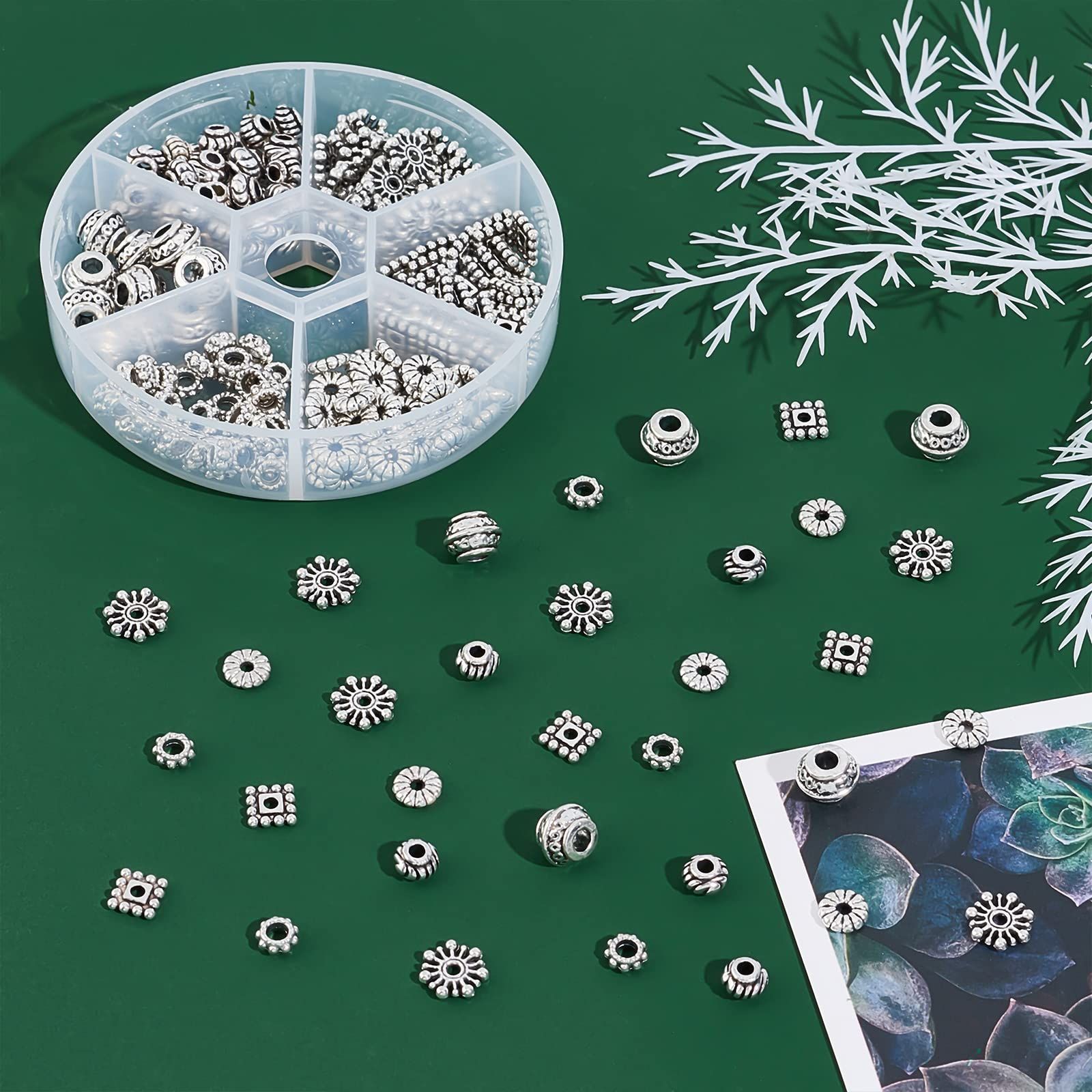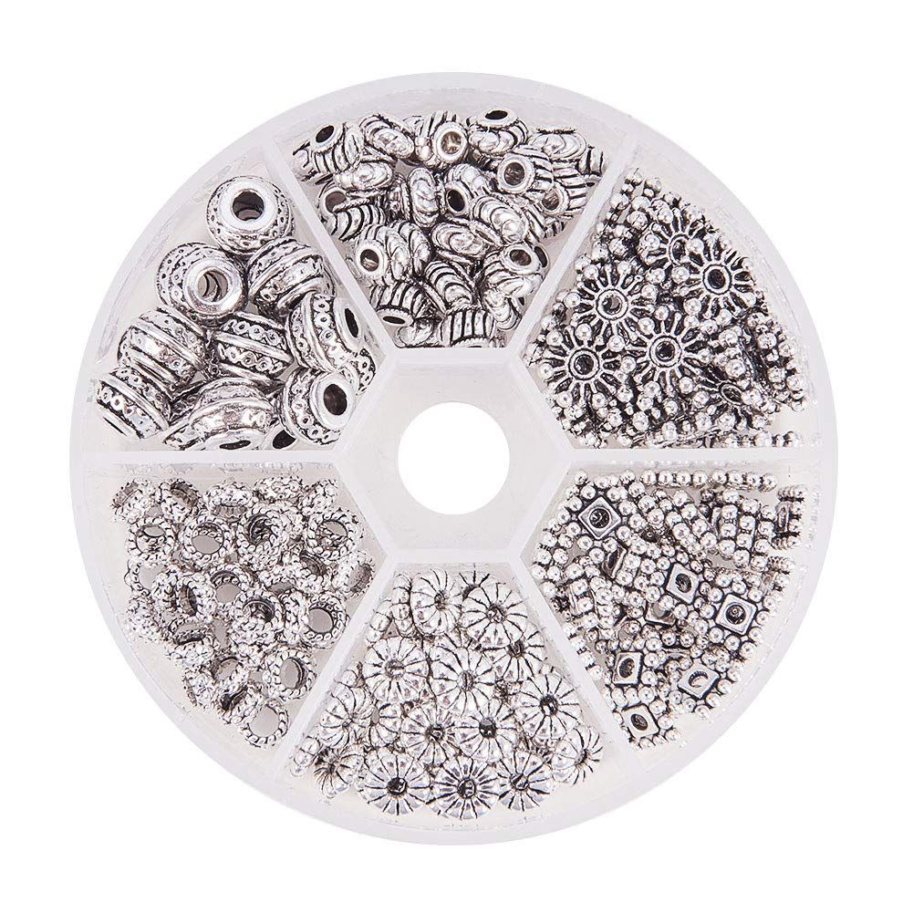 PH PandaHall 約216個入り 6種類 メタルビーズ 古銀色 合金 スペーサービーズ 菊座 花座 座金 チャーム チベット風 ジュエリー製作 アクセサリーパーツ DIY用 クラフト ブレスレット ネックレス 手作り素材 シルバー