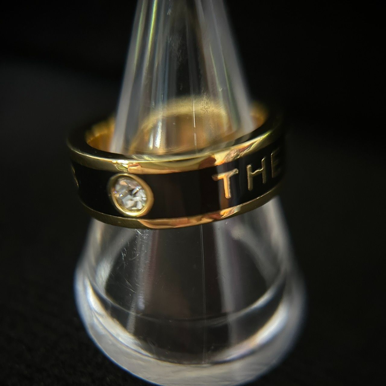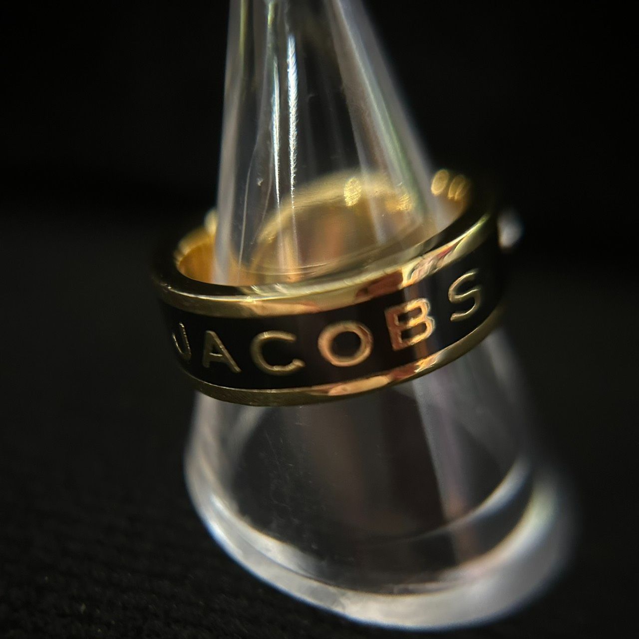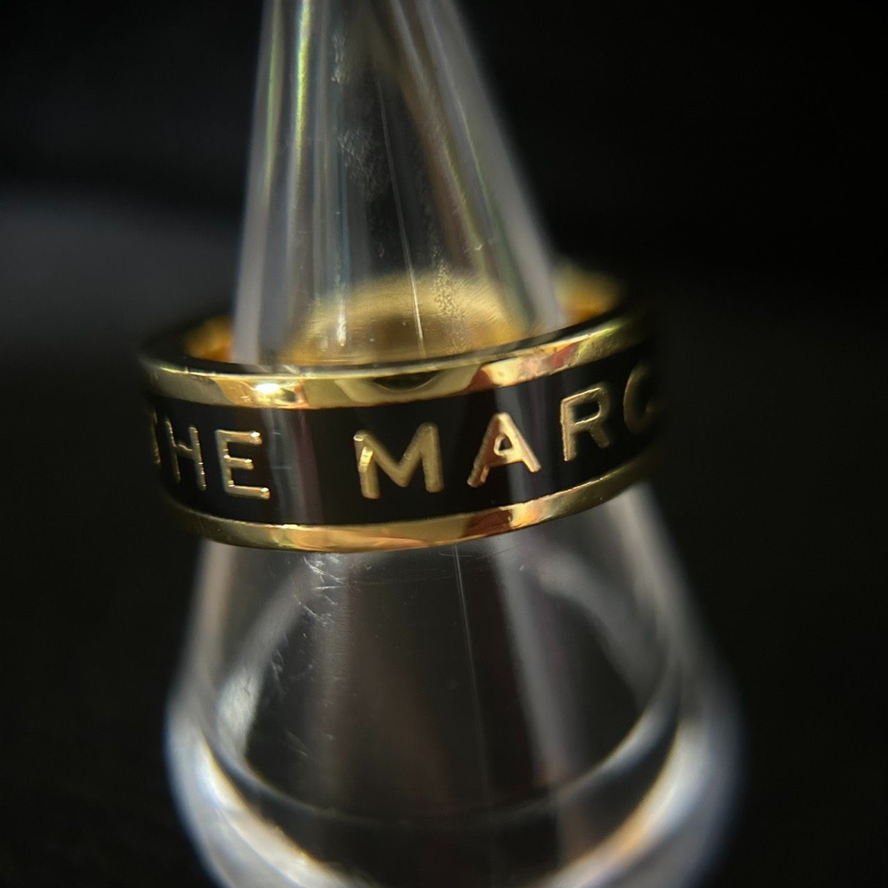 【良品】MARC JACOBS マークジェイコブス ロゴリング 指輪 ゴールド×ブラック ラインストーン 14号相当 アクセサリー レディース 袋つき 1205002