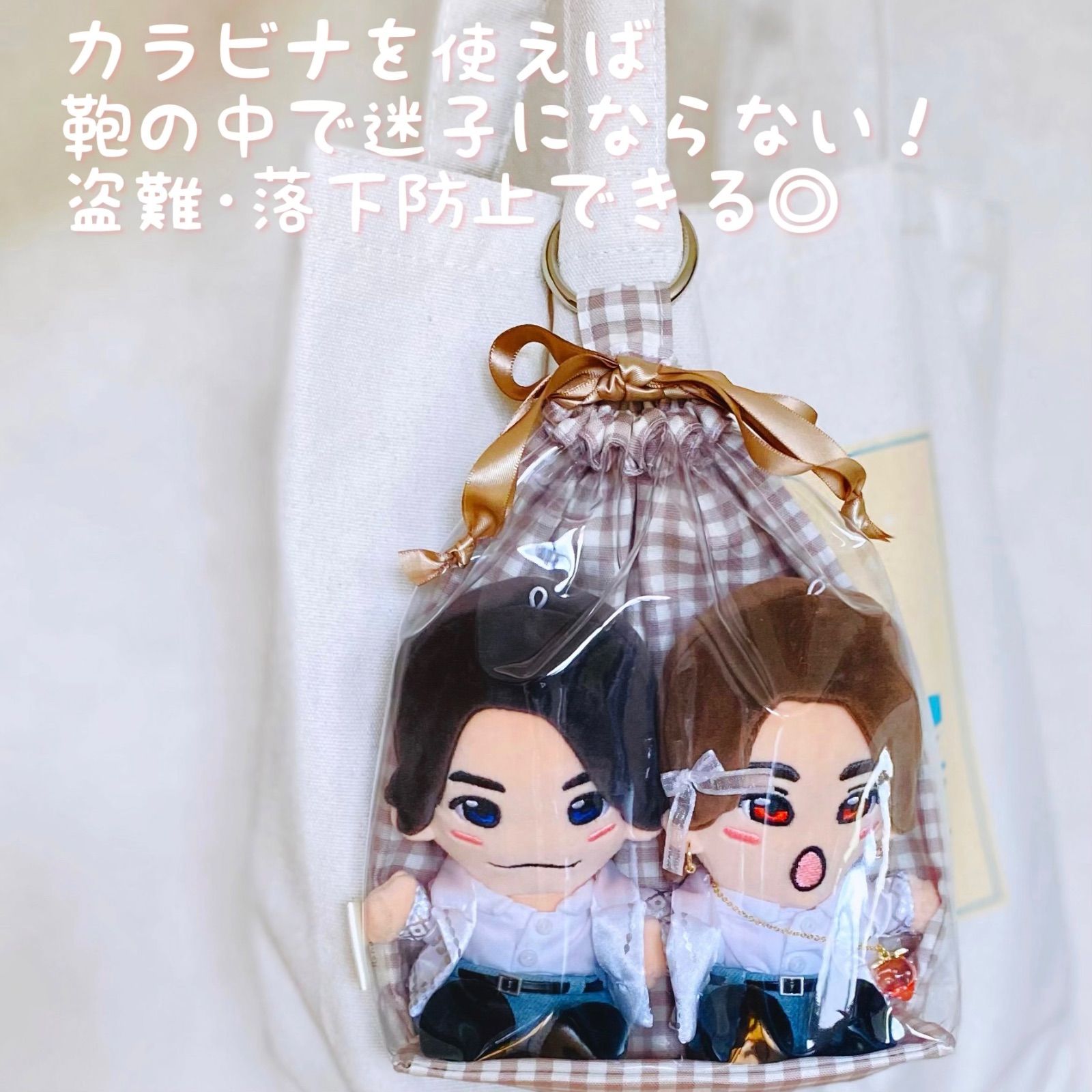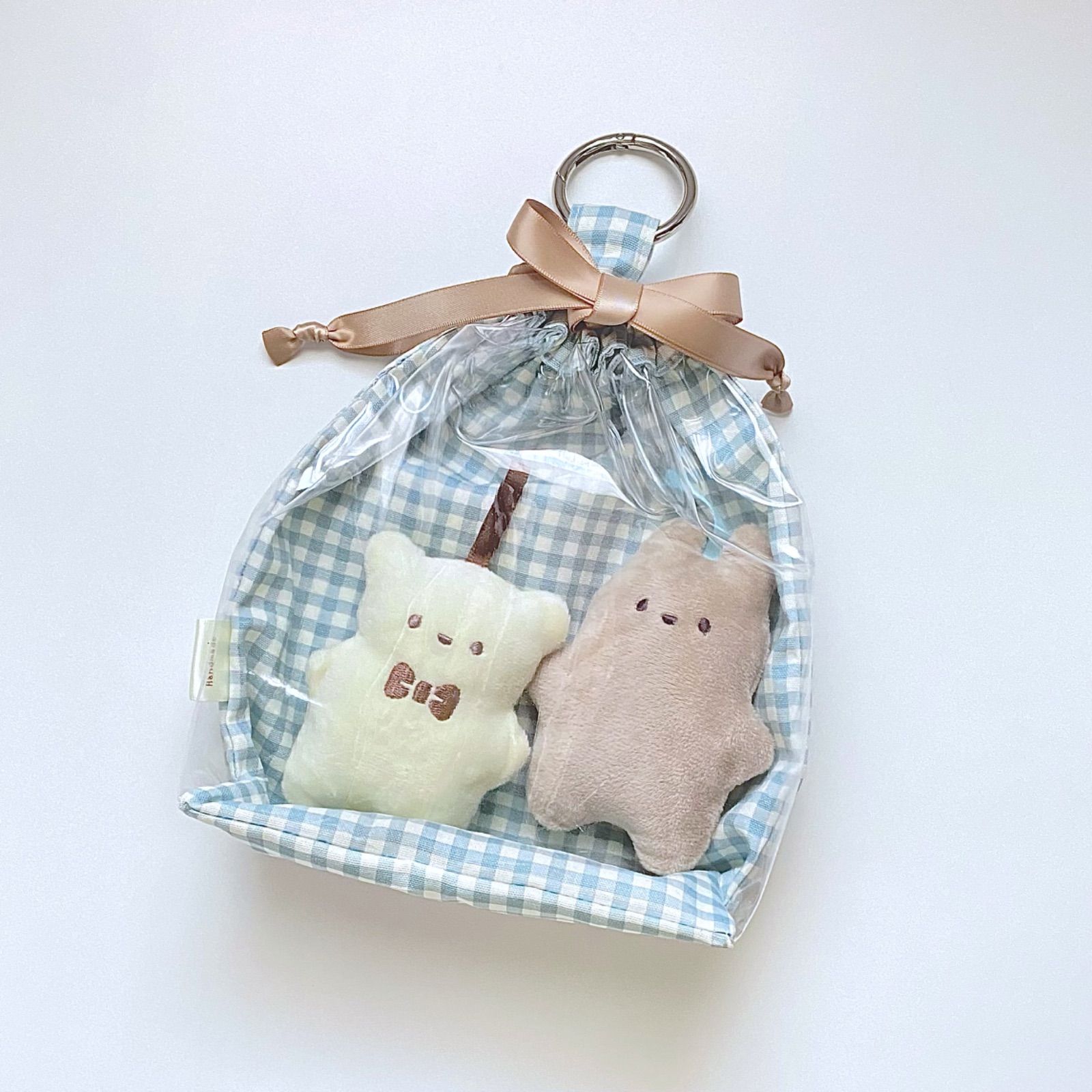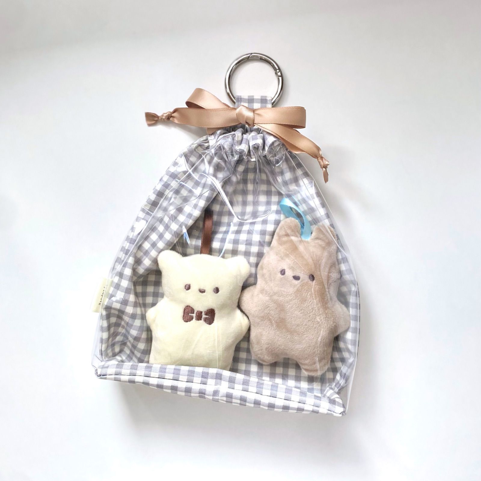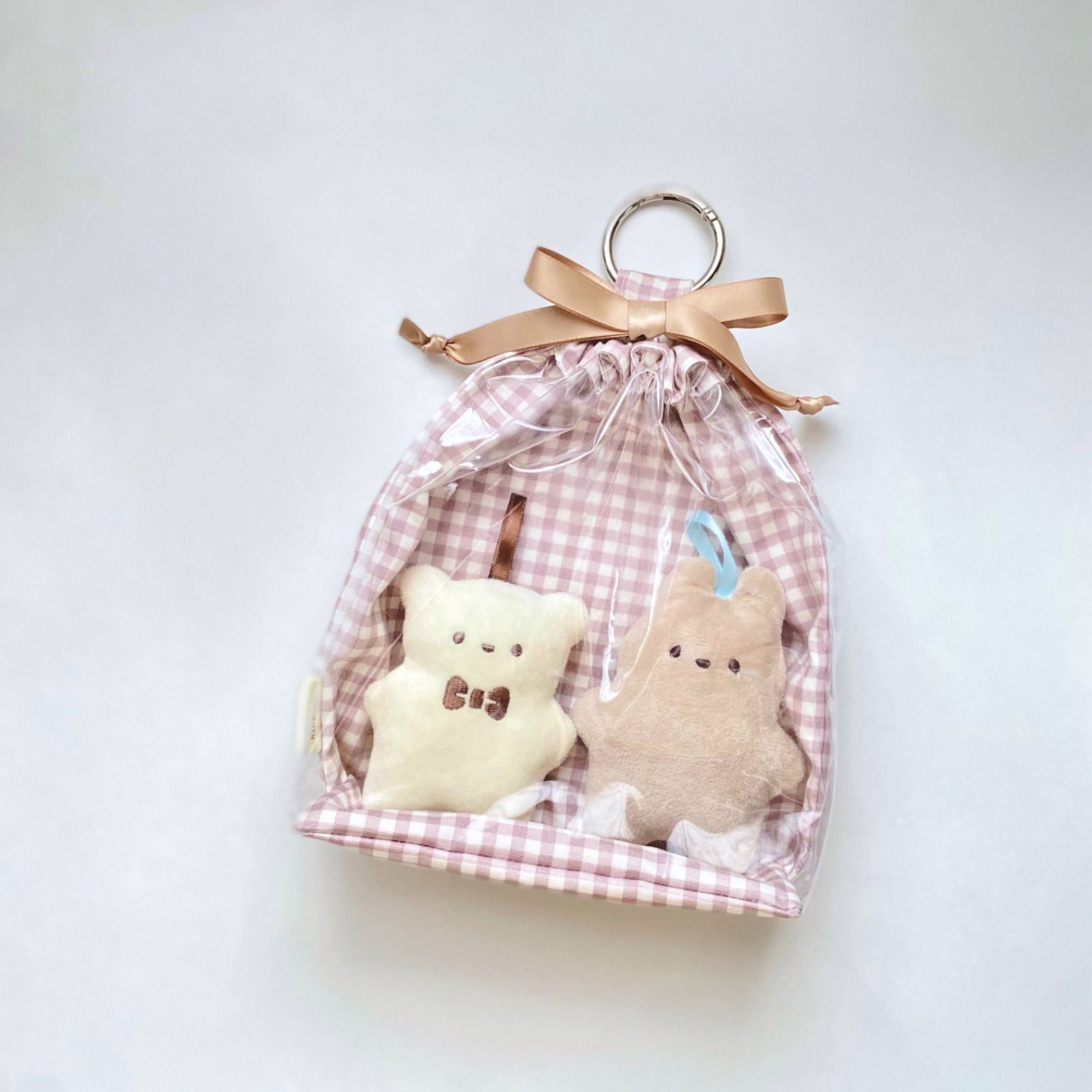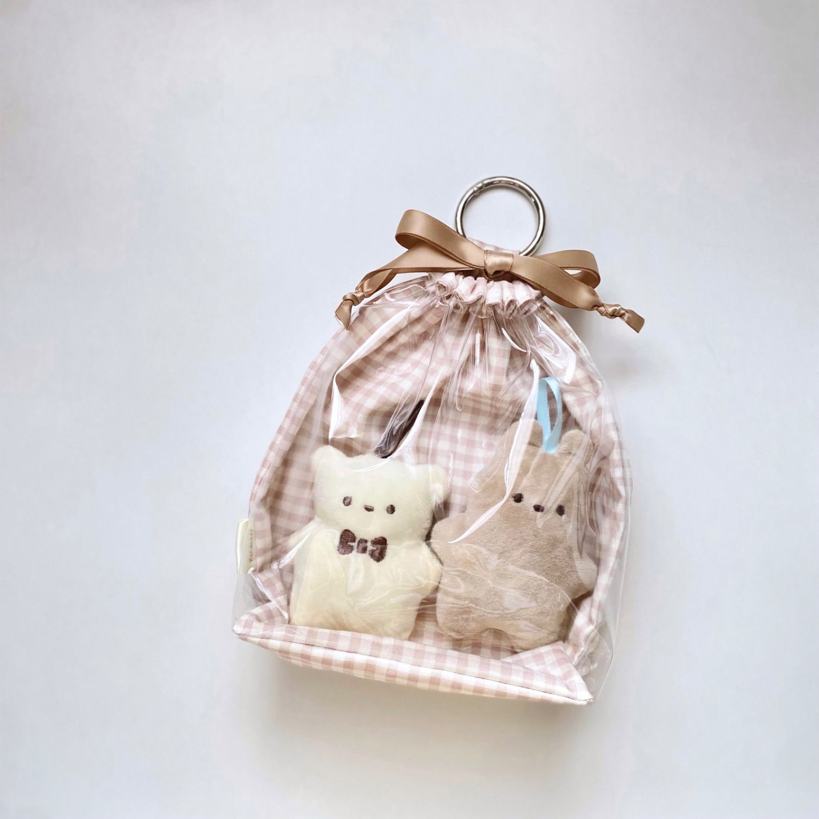 前面クリアぬい巾着|ポーチ ちびぬい はぴぬい 15cmぬい ぬいぐるみ ぬいポーチ 巾着袋 リボン コスメポーチ クリア くすみカラー 透明 PVC カラビナ 推し活