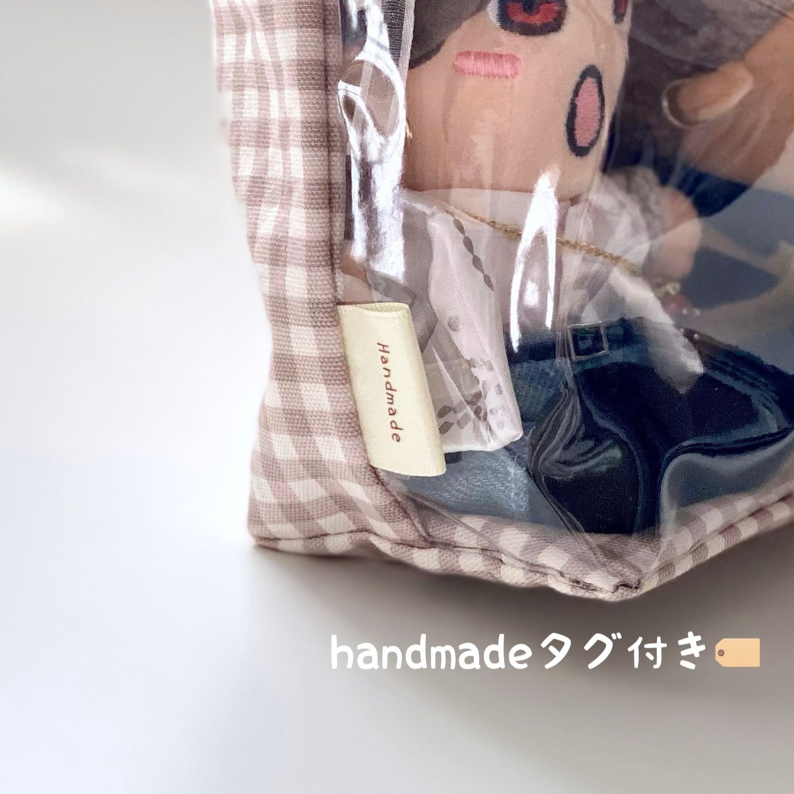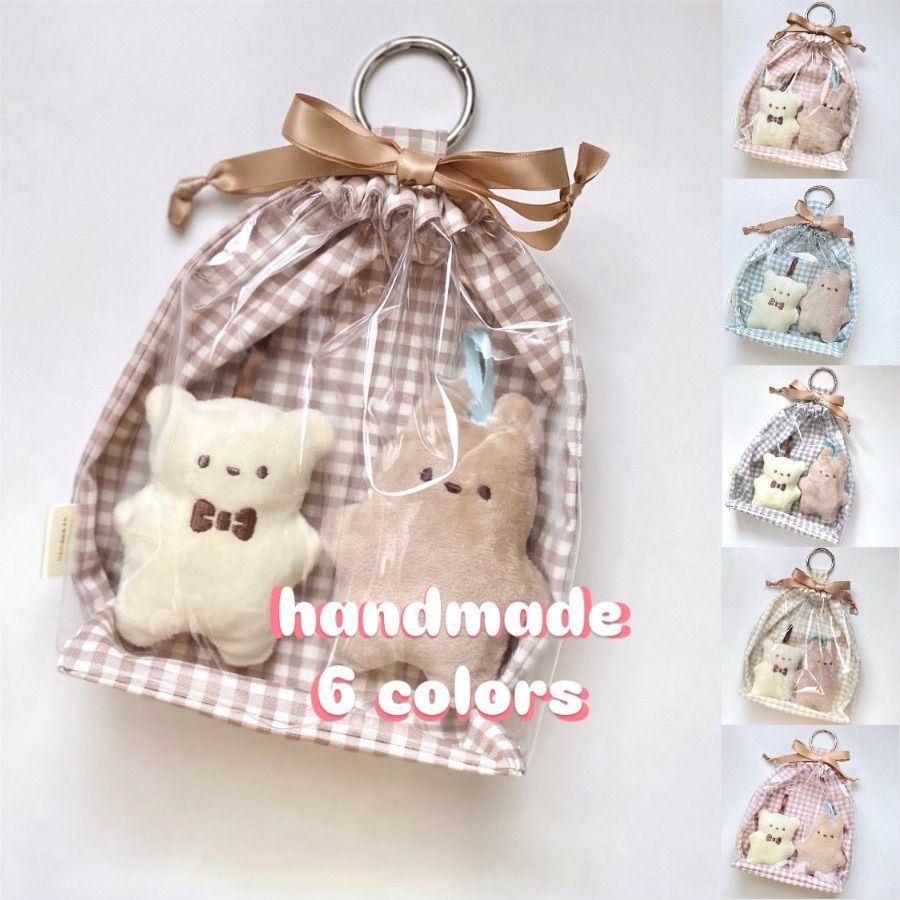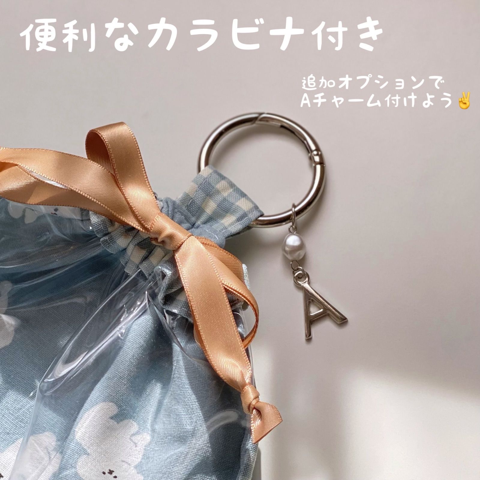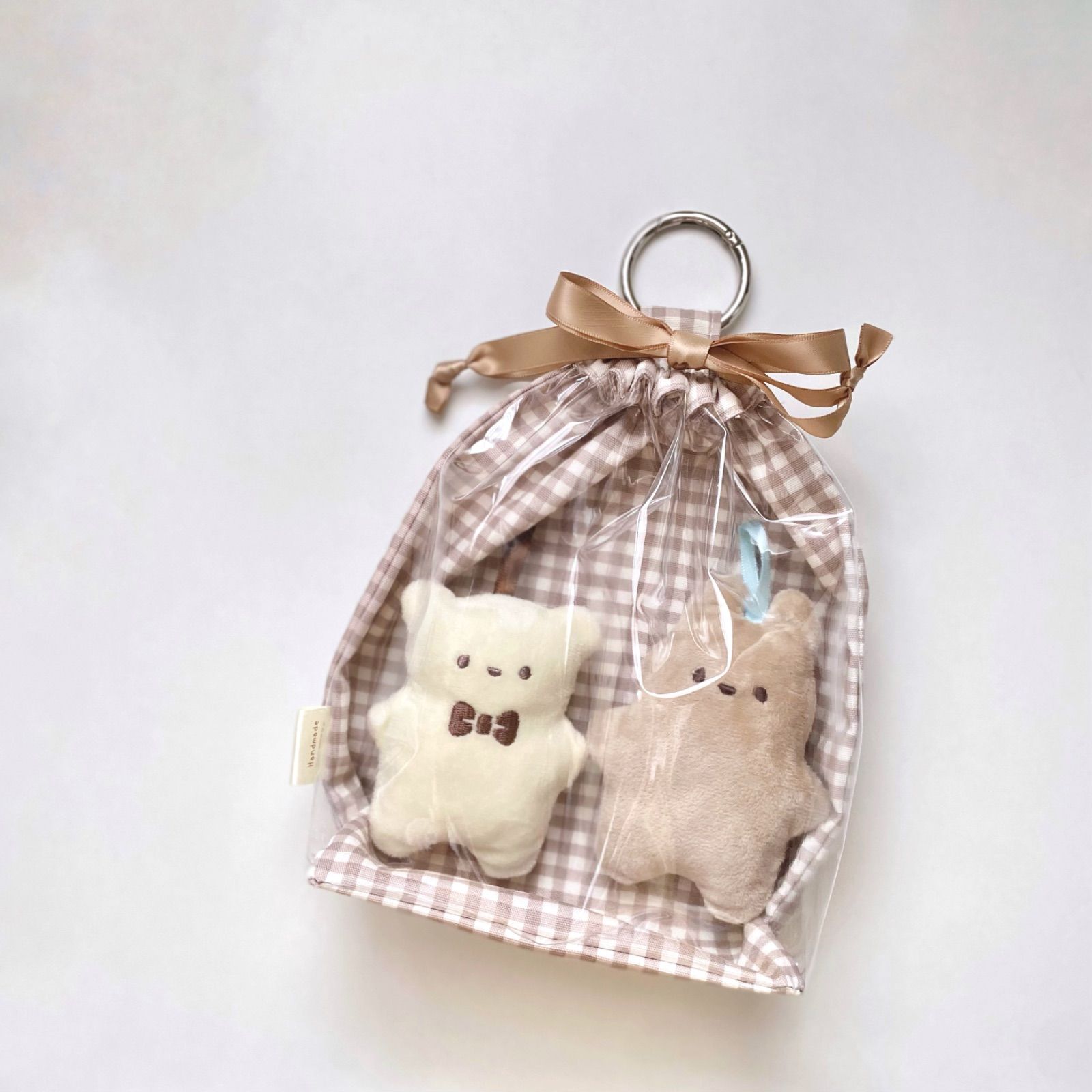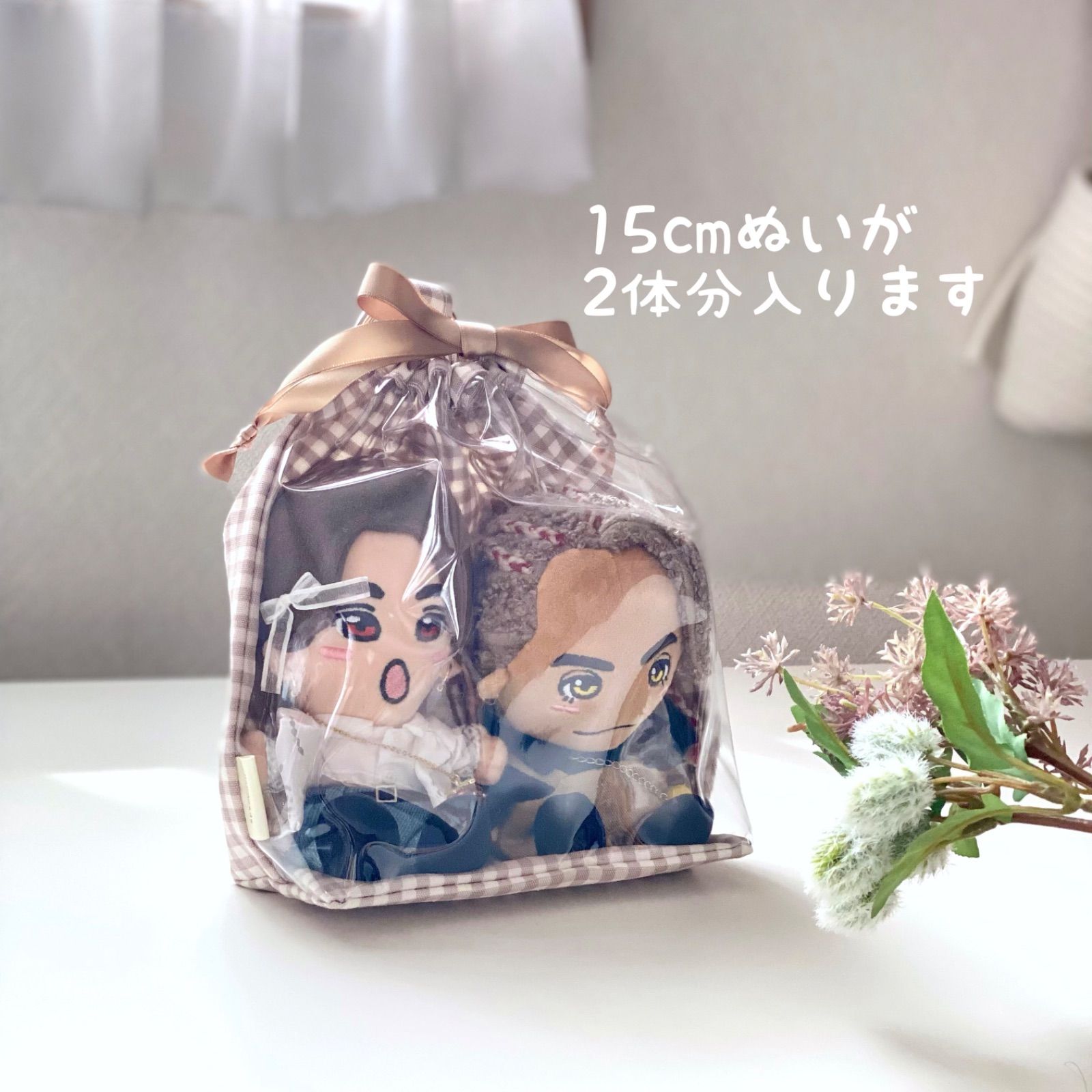 前面クリアぬい巾着|ポーチ ちびぬい はぴぬい 15cmぬい ぬいぐるみ ぬいポーチ 巾着袋 リボン コスメポーチ クリア くすみカラー 透明 PVC カラビナ 推し活