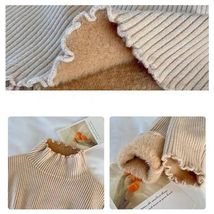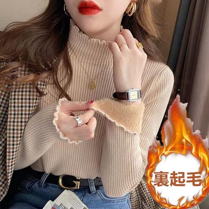 リブニット ニットトップス レディース インナー ニットソー ハイネック 長袖 裏起毛 フリルネック 無地 秋 冬 あったか 暖かmengba04