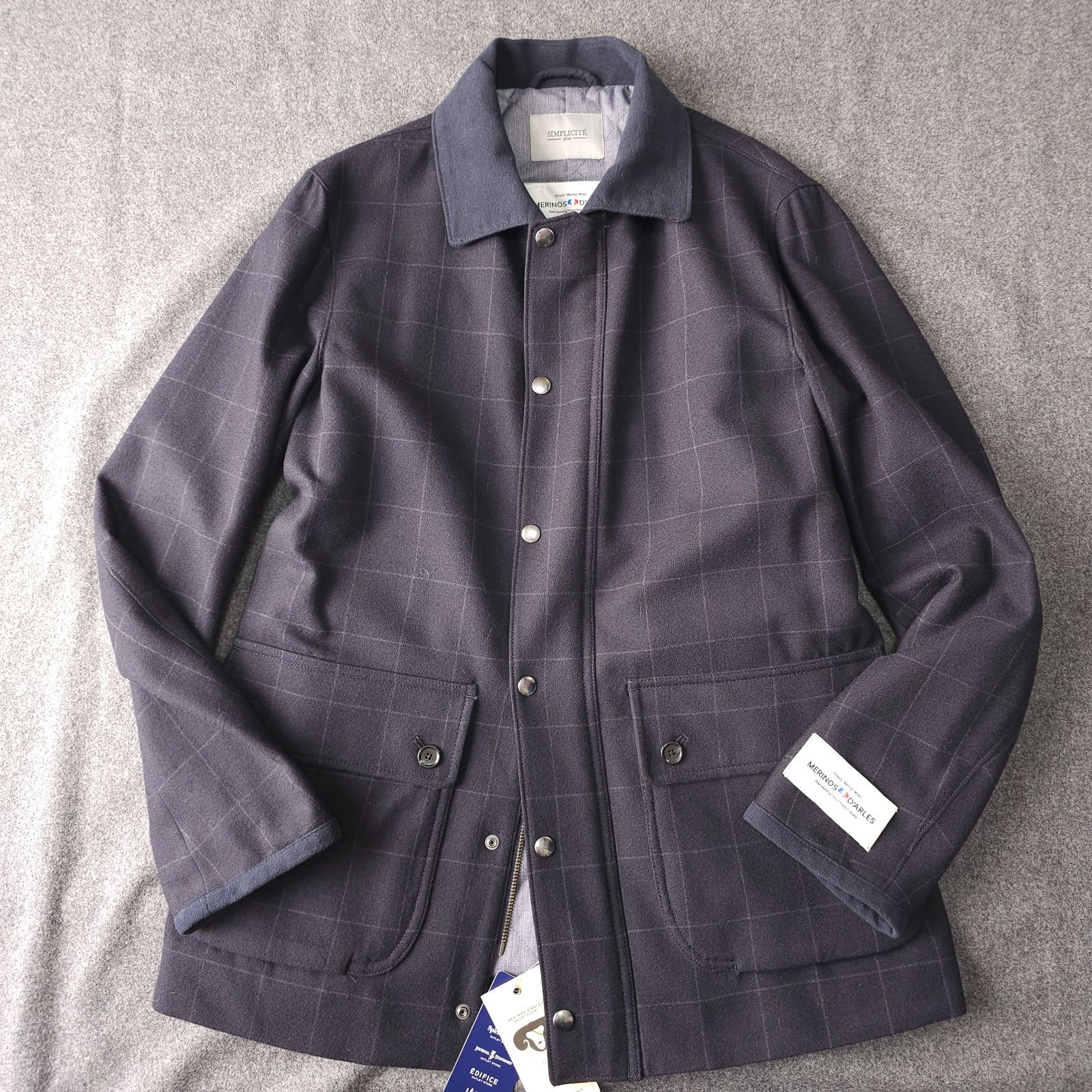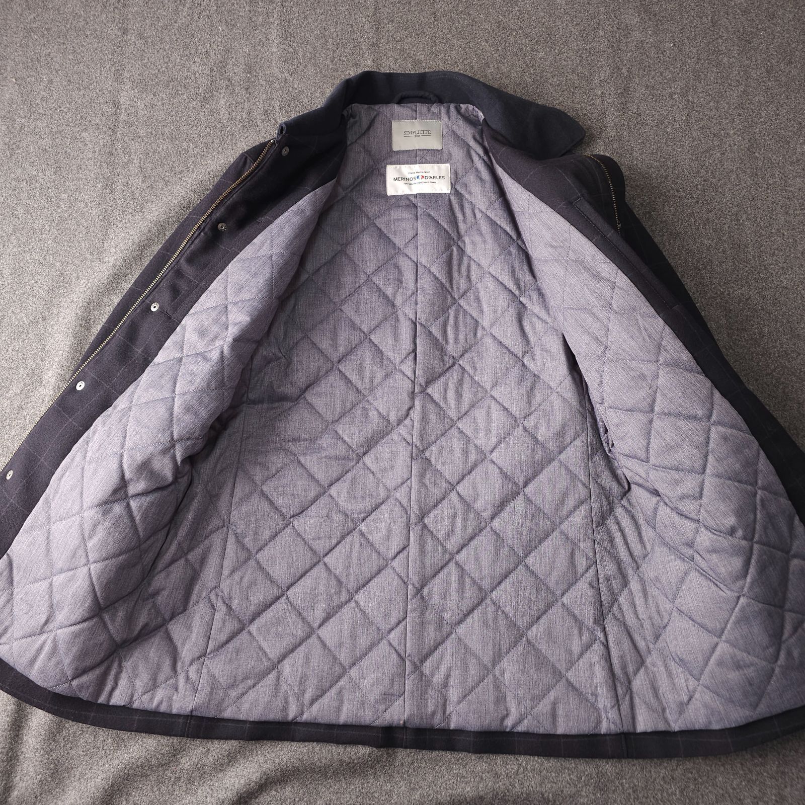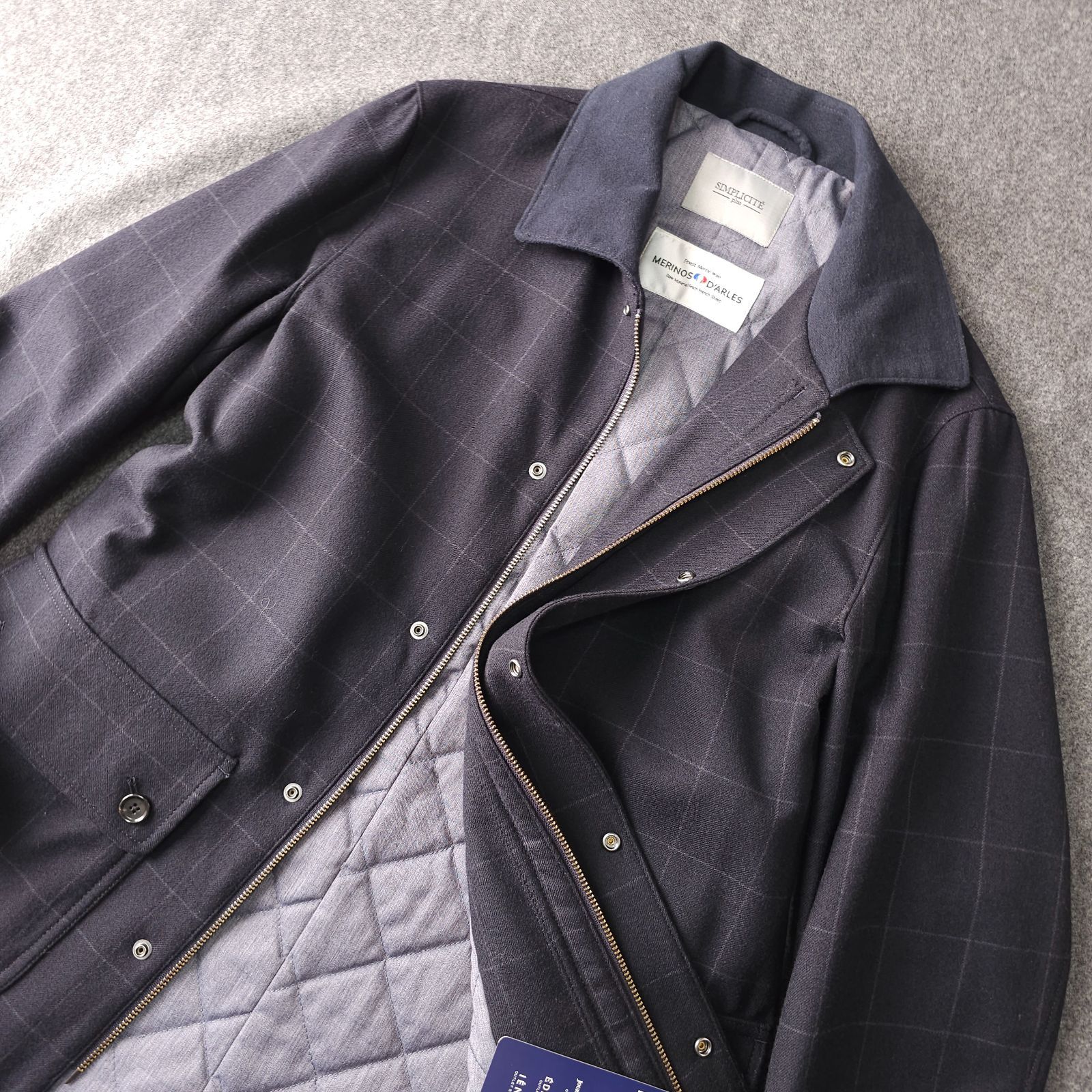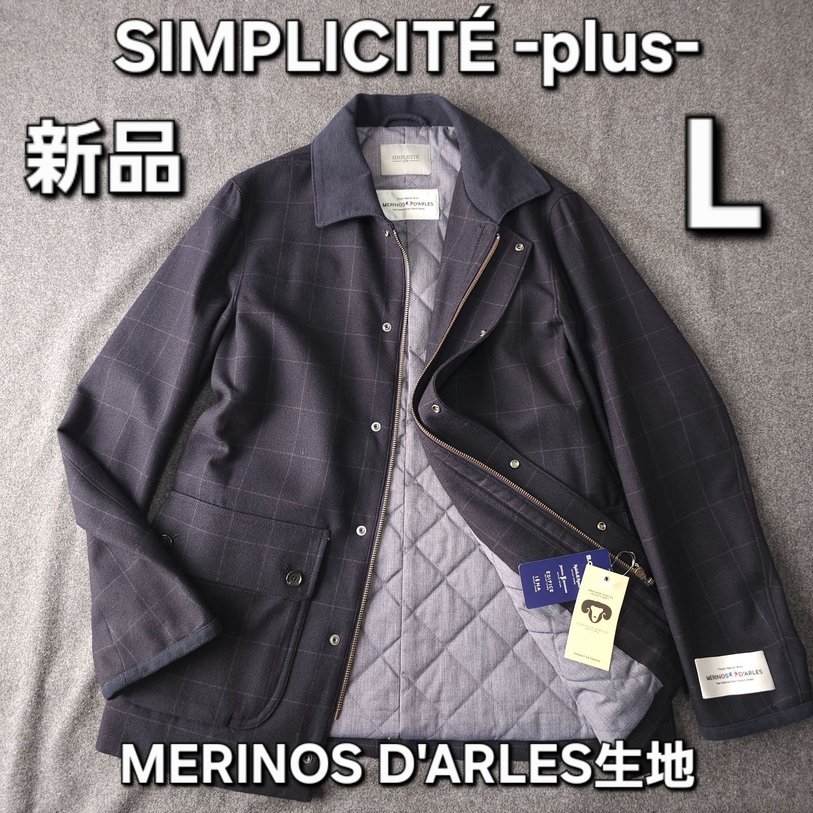 新品未使用【SIMPLICITE-plus-】シンプリシテプリュス 秋冬 ウィンドペンチェック柄 中綿 キルティング ブルゾンジャケット L MERINOS D'ARLES メリノウール生地 アルルスメリノ メンズ ネイビー