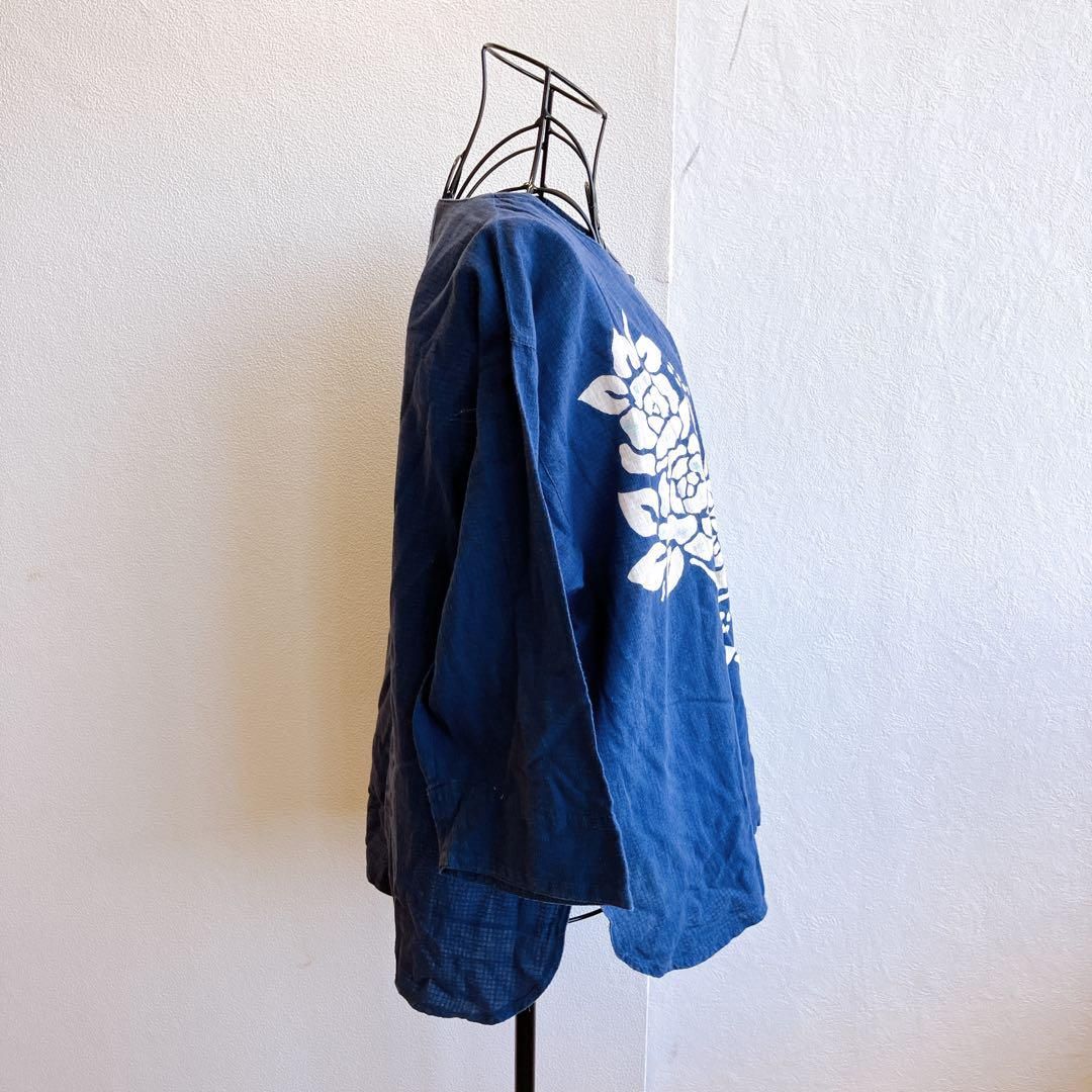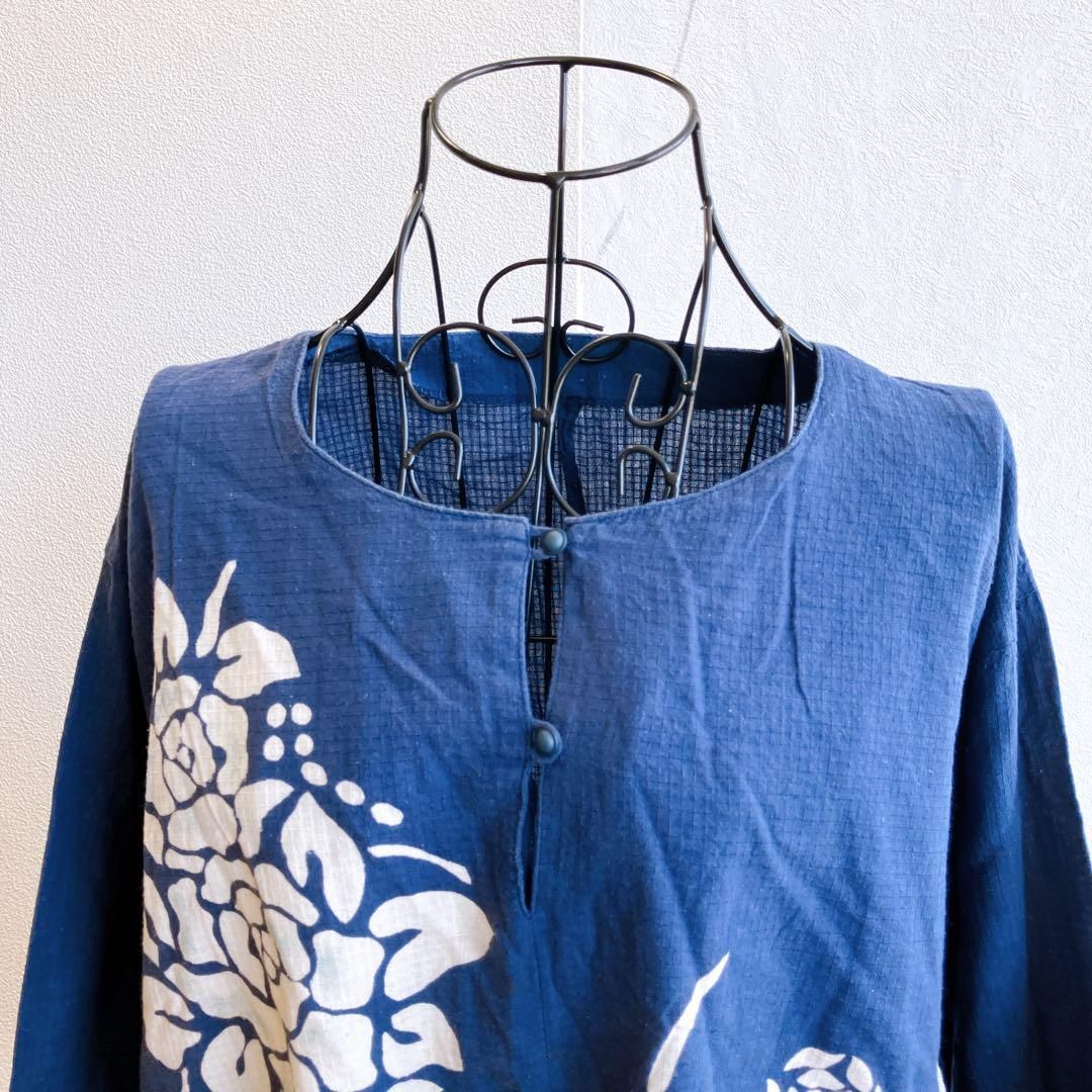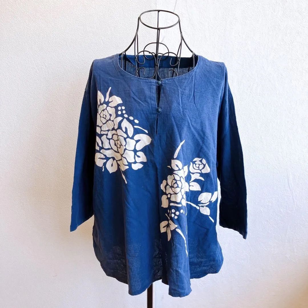 良品✨ トップス チュニック サイドスリット ラウンドネック フロントプリント 和柄 花柄 コットン 綿 7分袖 チュニック丈 ゆったり 大きめ オーバーサイズ 体型カバー 大人カジュアル 日本製 Made in Japan 昭和 レトロ 90s