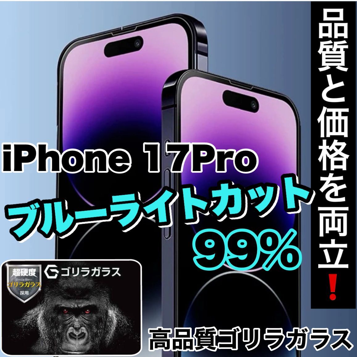 大人気フィルム☆目の疲れを低減!☆目に優しい!【iPhoneiPhone 17.17Pro.17ProMax.17Air】ブルーライト99%カットフィルム《世界のゴリラガラス》飛散防止 高硬度9H 簡単貼り付け