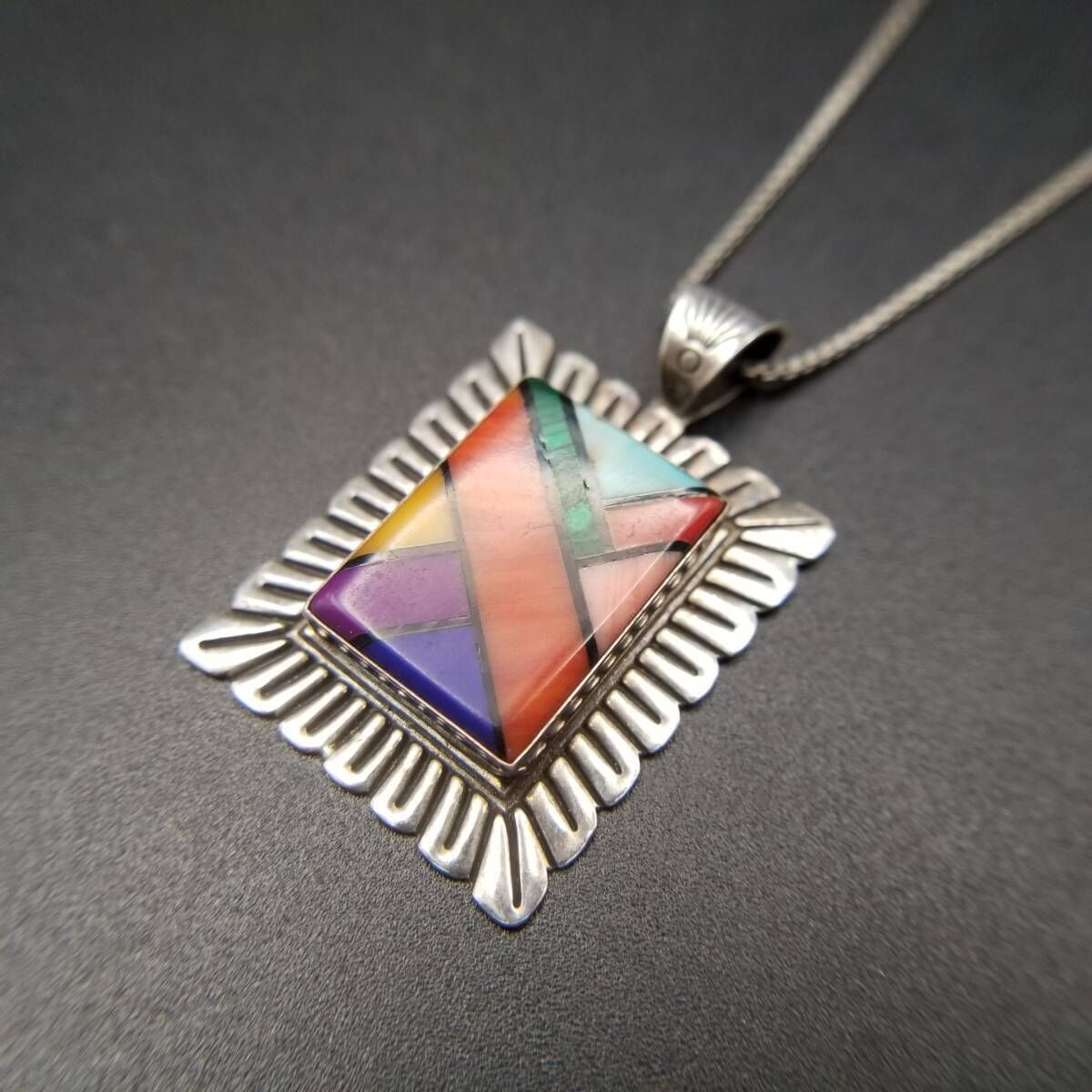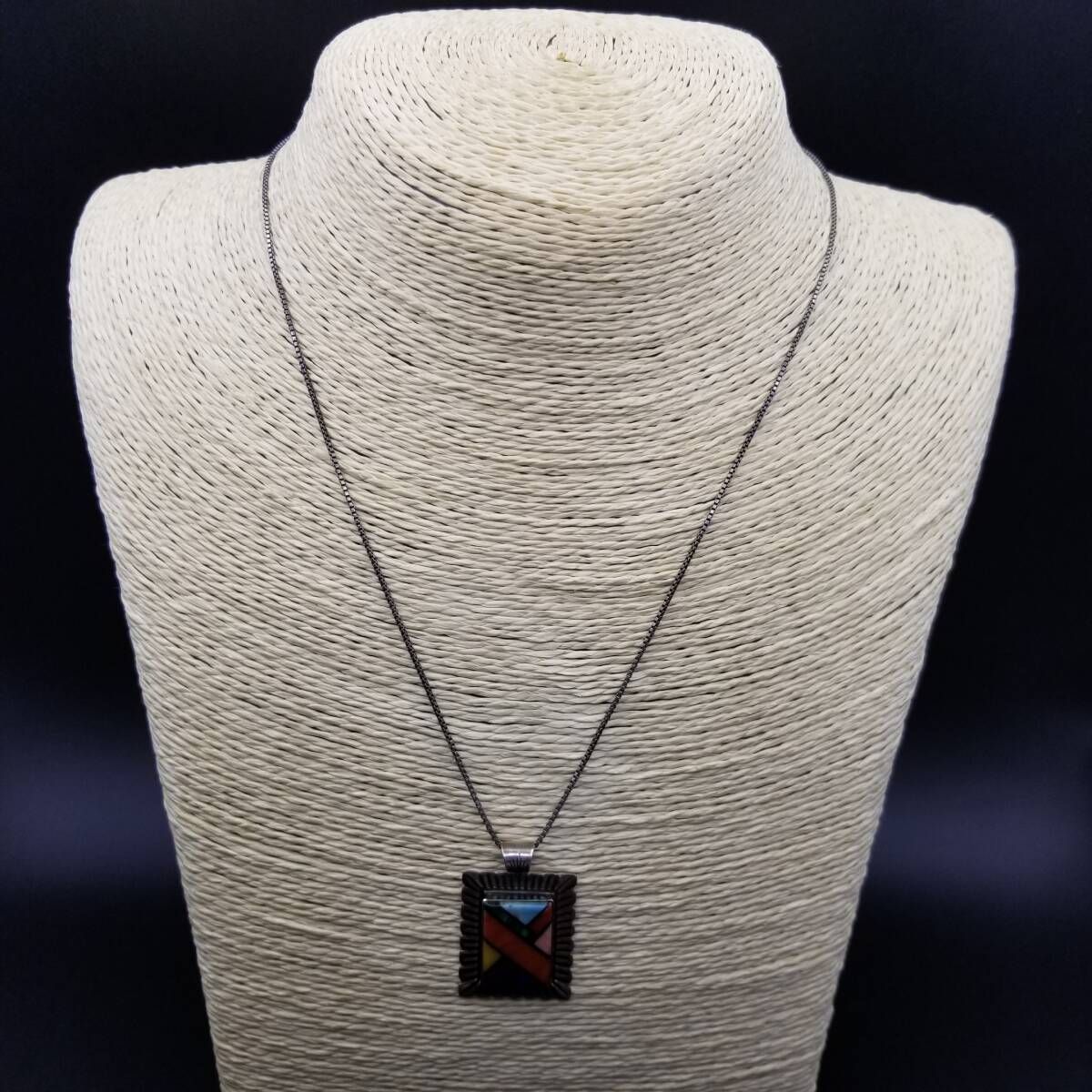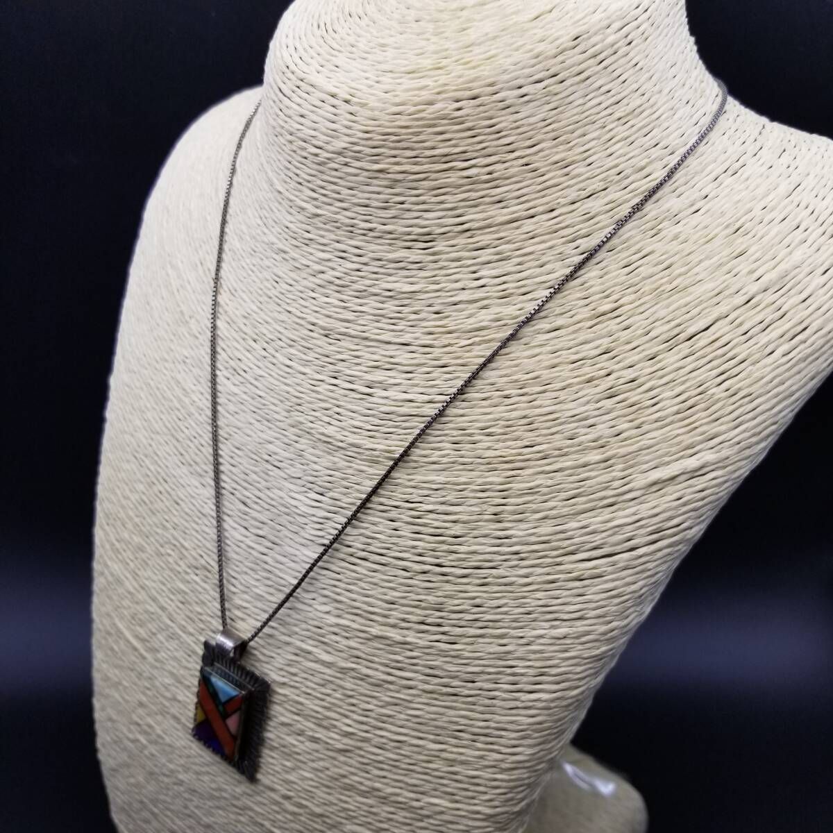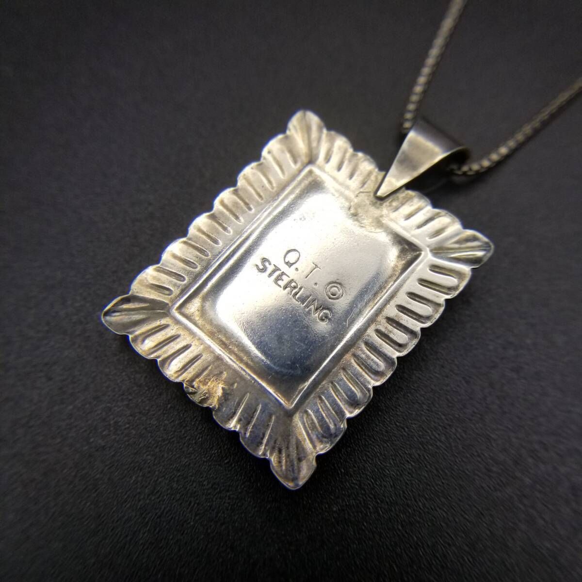 Quoc Turquoise Inc. Q.T モザイク柄 長方形フレーム 925 シルバー ヴィンテージ ペンダント ネックレス マルチストーン Y18-V