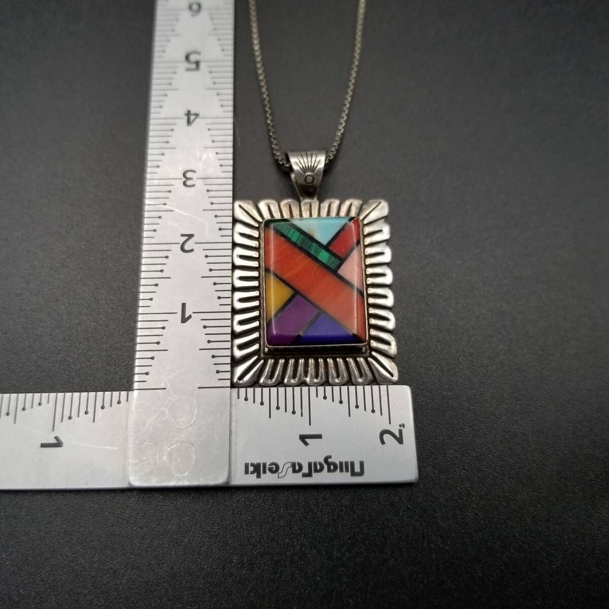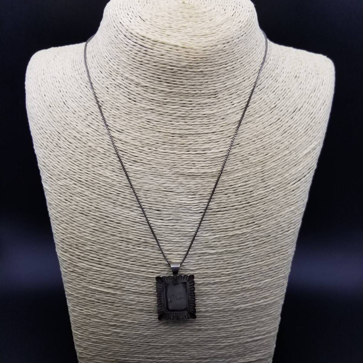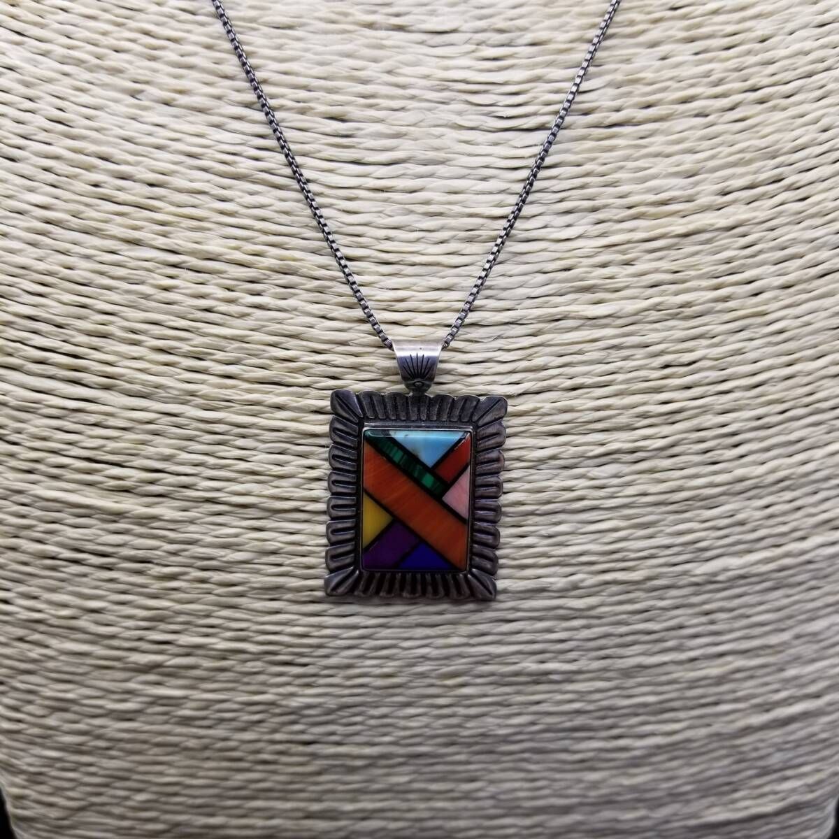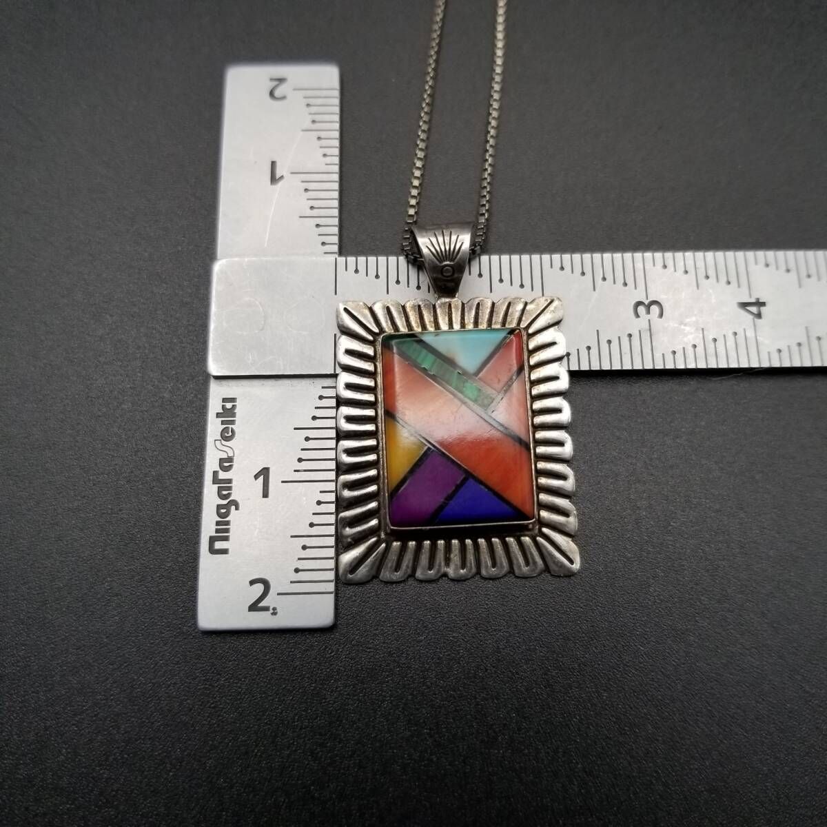 Quoc Turquoise Inc. Q.T モザイク柄 長方形フレーム 925 シルバー ヴィンテージ ペンダント ネックレス マルチストーン Y18-V