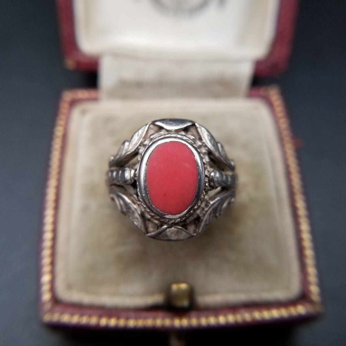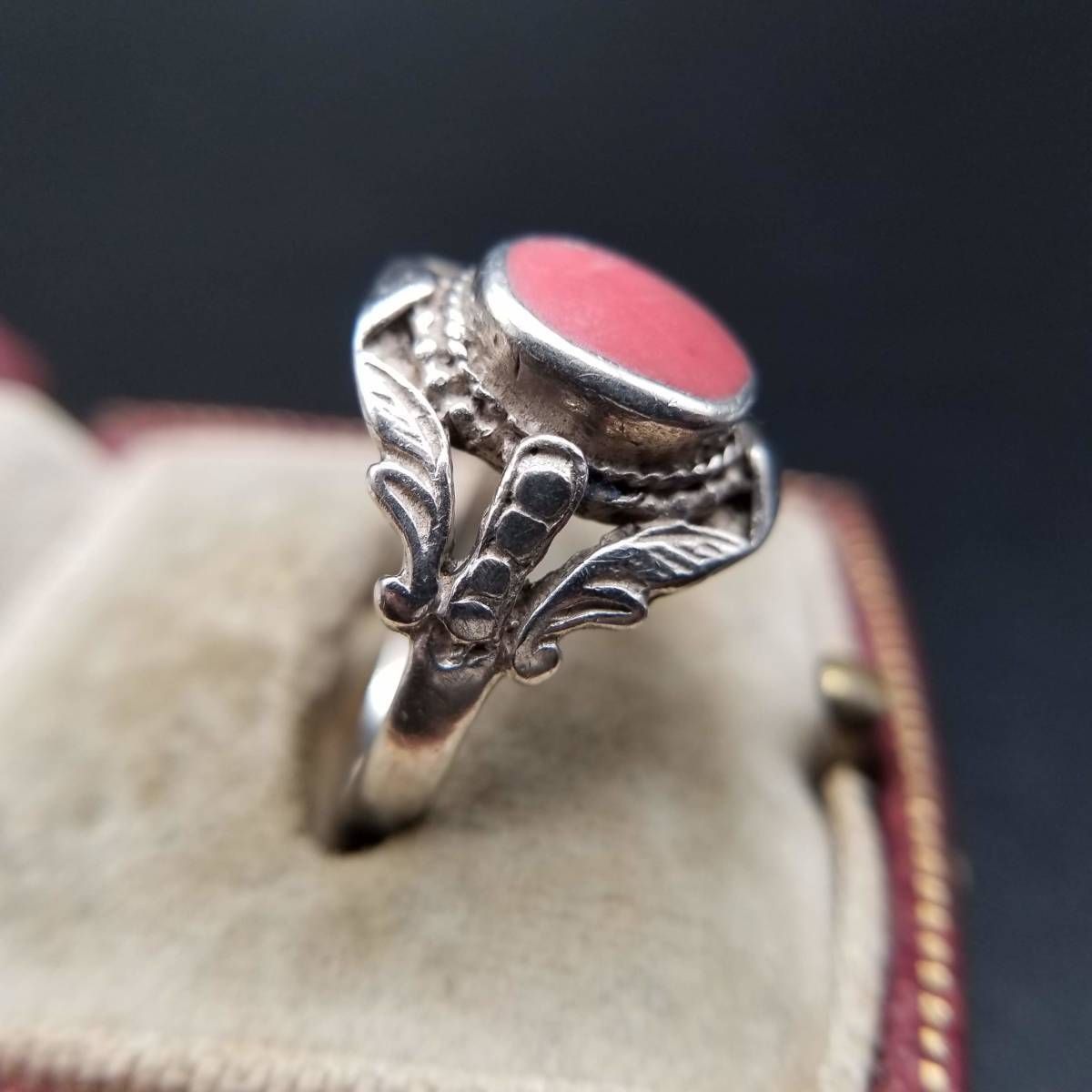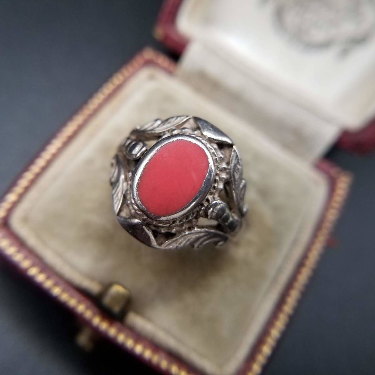 コーラルピンク インレイ フローラル 925 シルバー ヴィンテージ リング 銀 レトロ 指輪 植物モチーフ サウスウェスタンスタイル Y18-S