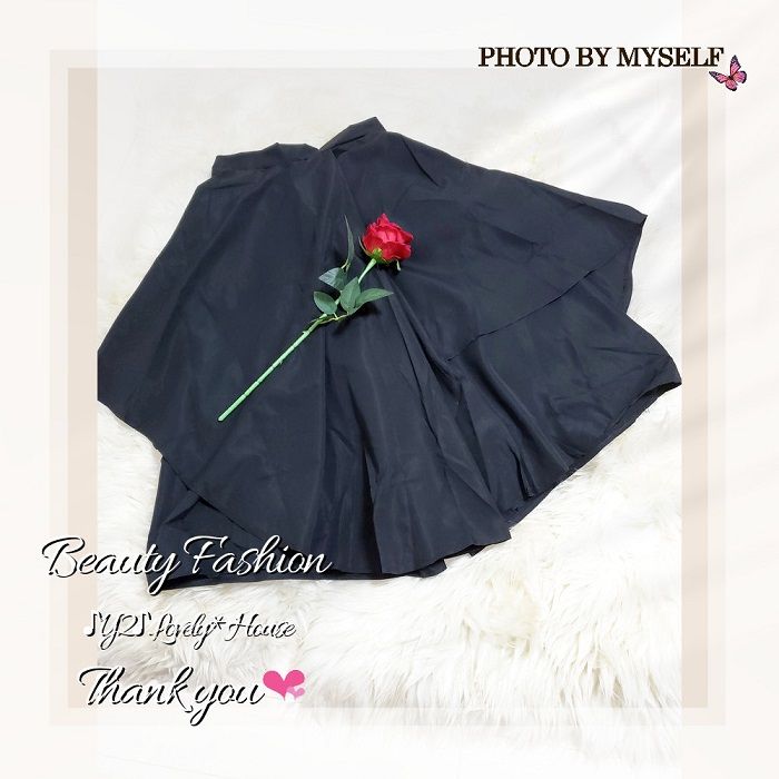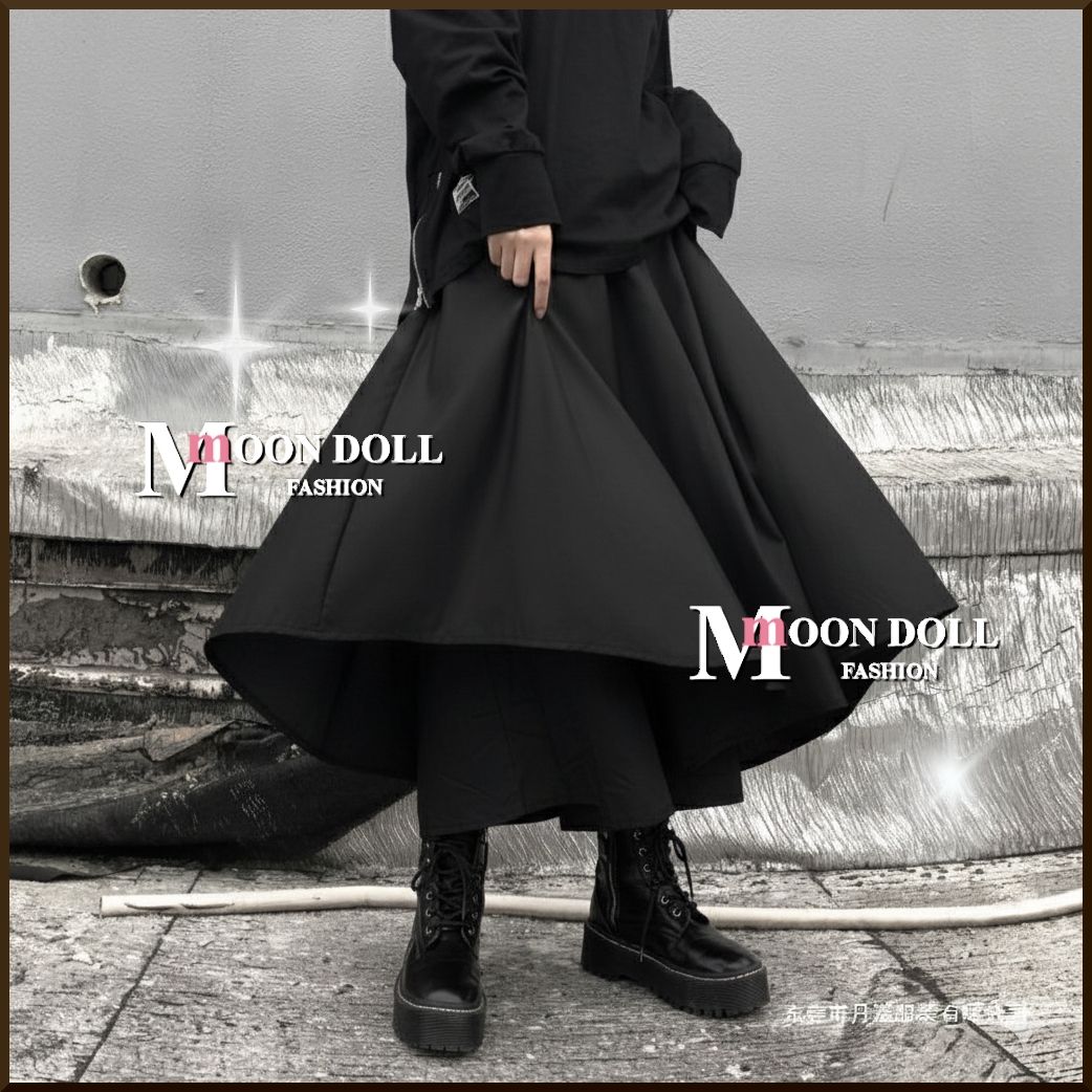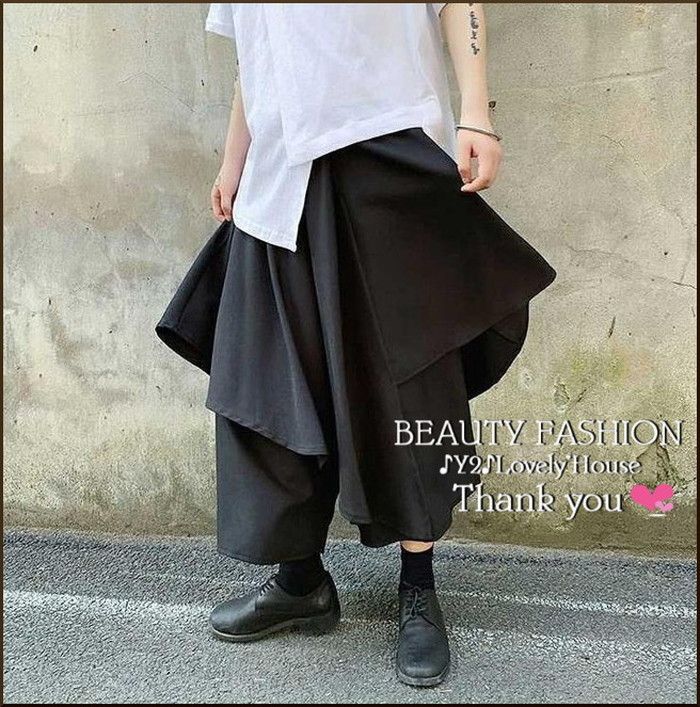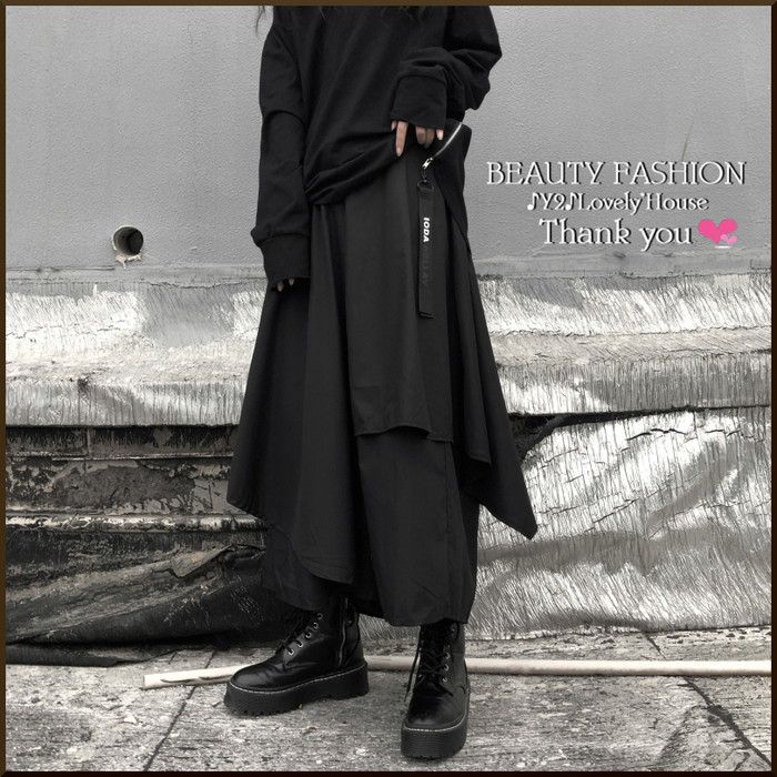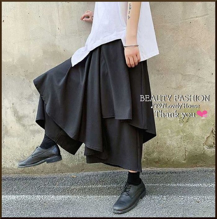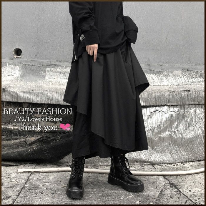 ■【~3L4L相当】重ね着風アシンメトリースカート+袴パンツ//ドッキング*黒