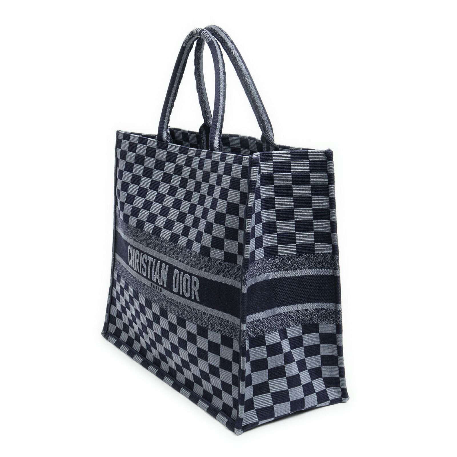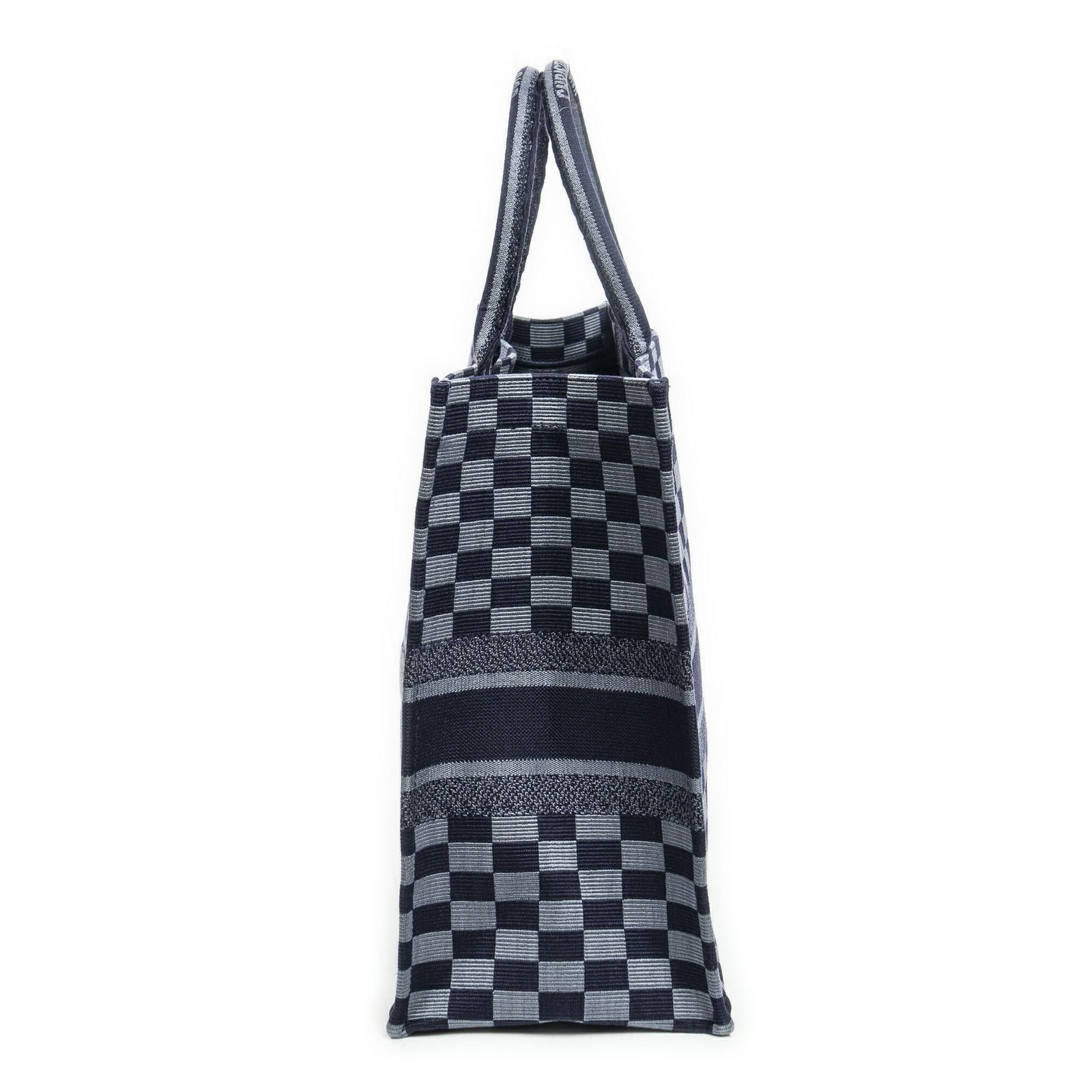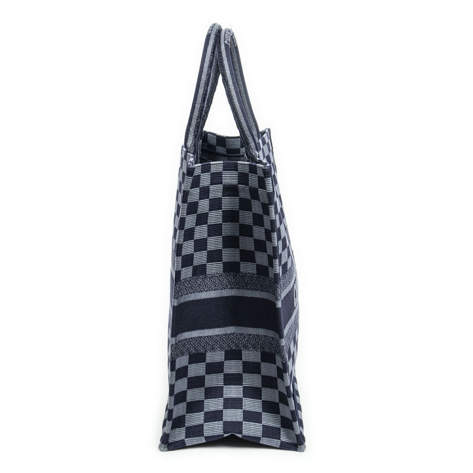 [中古] DIOR ディオールブックトートネイビーブルー、水色刺繍チェックキャンバスA