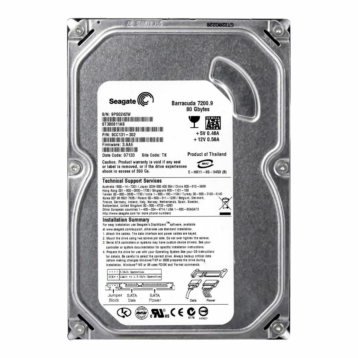 【3年保証】Hard Seagate barracuda 7200.9 ST380811AS 80GB SATA 7200U/Min 8MB 3.5