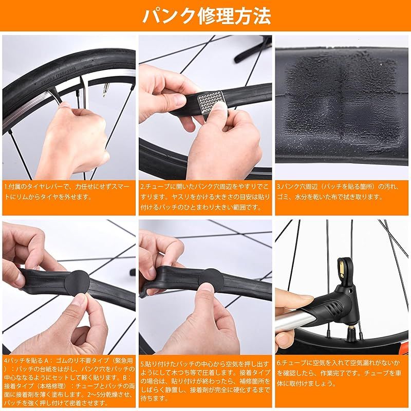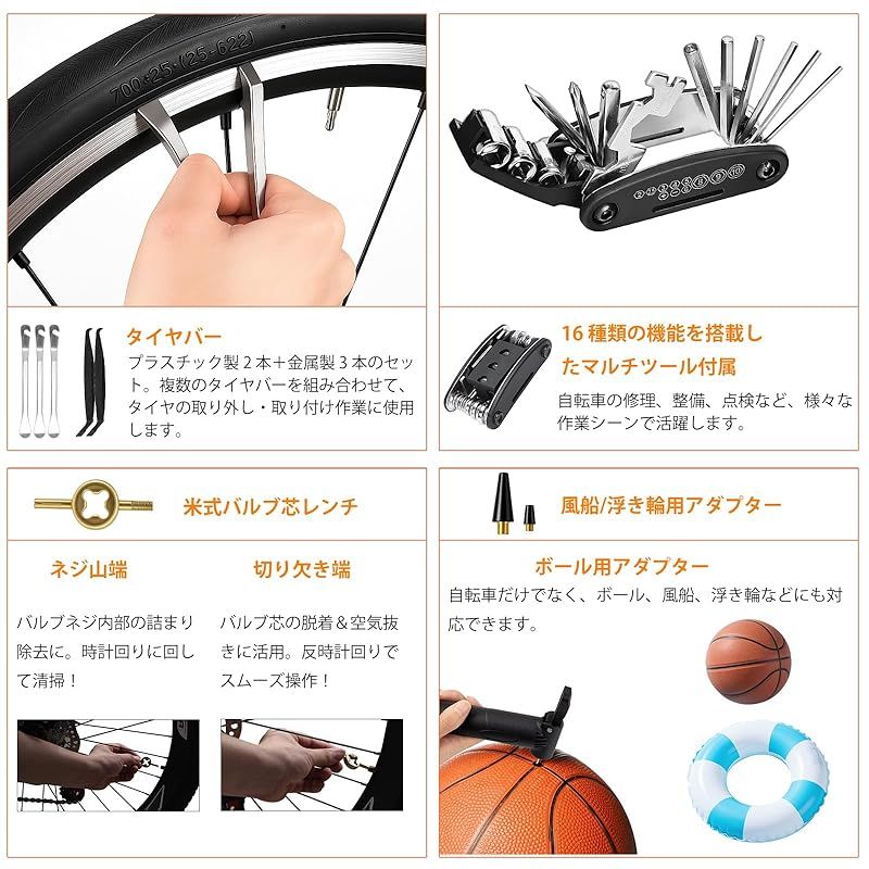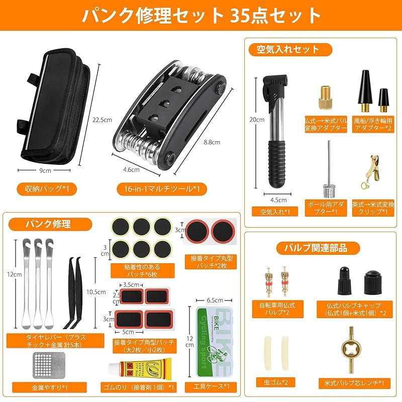 パッケージ内容: ・収納バッグ(1個) ・16-in-1マルチツール(1個) ・空気入れセット*6:空気入れ*1、仏式-→米式バルブ変換アダプター*1、英式→米式変換クリップ*1、風船/浮き輪用アダプター*2、ボール用アダプター*1 パンク修理*20:金属やすり*1、ゴムのり不要タイプ丸型パッチ*6枚、タイヤレバー(プラスチック+金属 計5本)、接着タイプ角型パッチ(大2枚/小2枚)、接着タイプ丸型パッチ*2枚、ゴムのり(接着剤 1個)*1、工具ケース*1。 バルブ関連部品*7:虫ゴム*2、仏式バルブキャップ(仏式1個+米式1個)*2、自転車用仏式バルブ*2、米式バルブ芯レンチ*1。