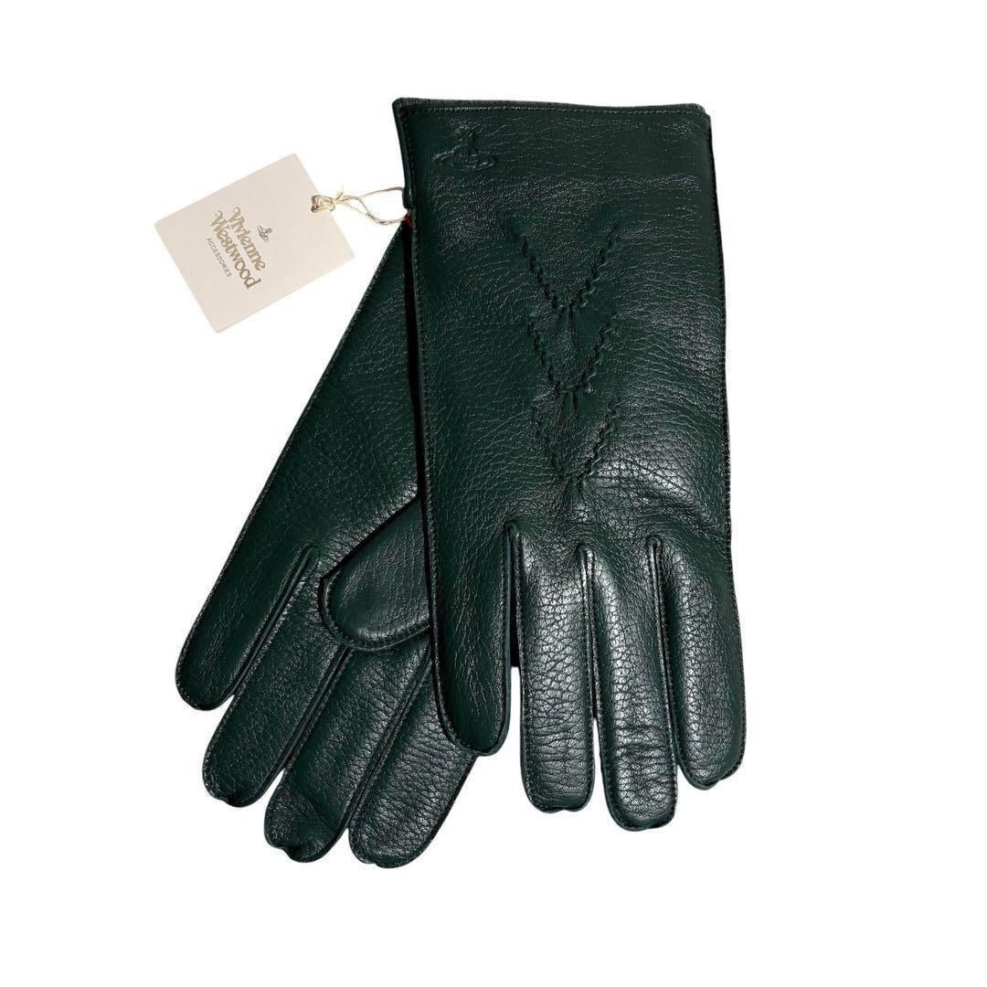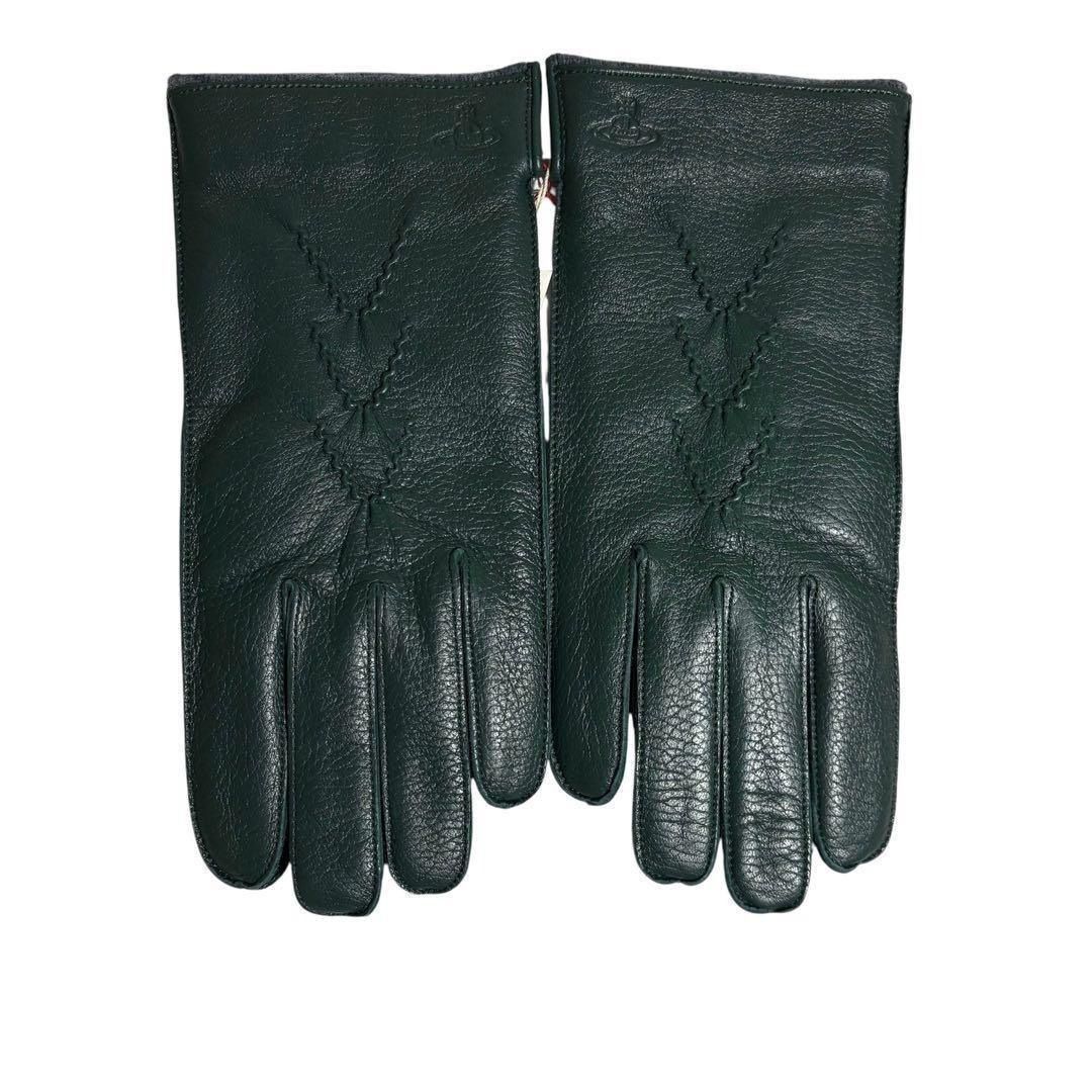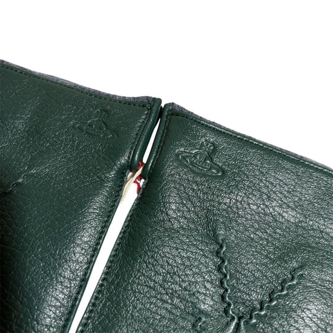 【タグ付き・未使用品】 ヴィヴィアン ウエストウッド 手袋 レザー ニット グローブ メンズ 緑 グリーン オーブ ロゴ 型押し ボーダー 本革