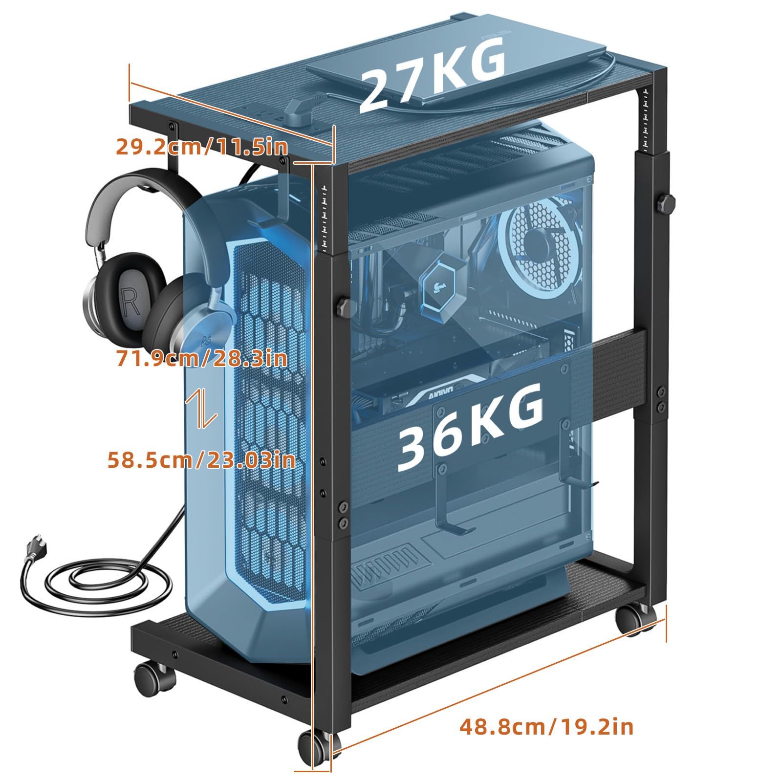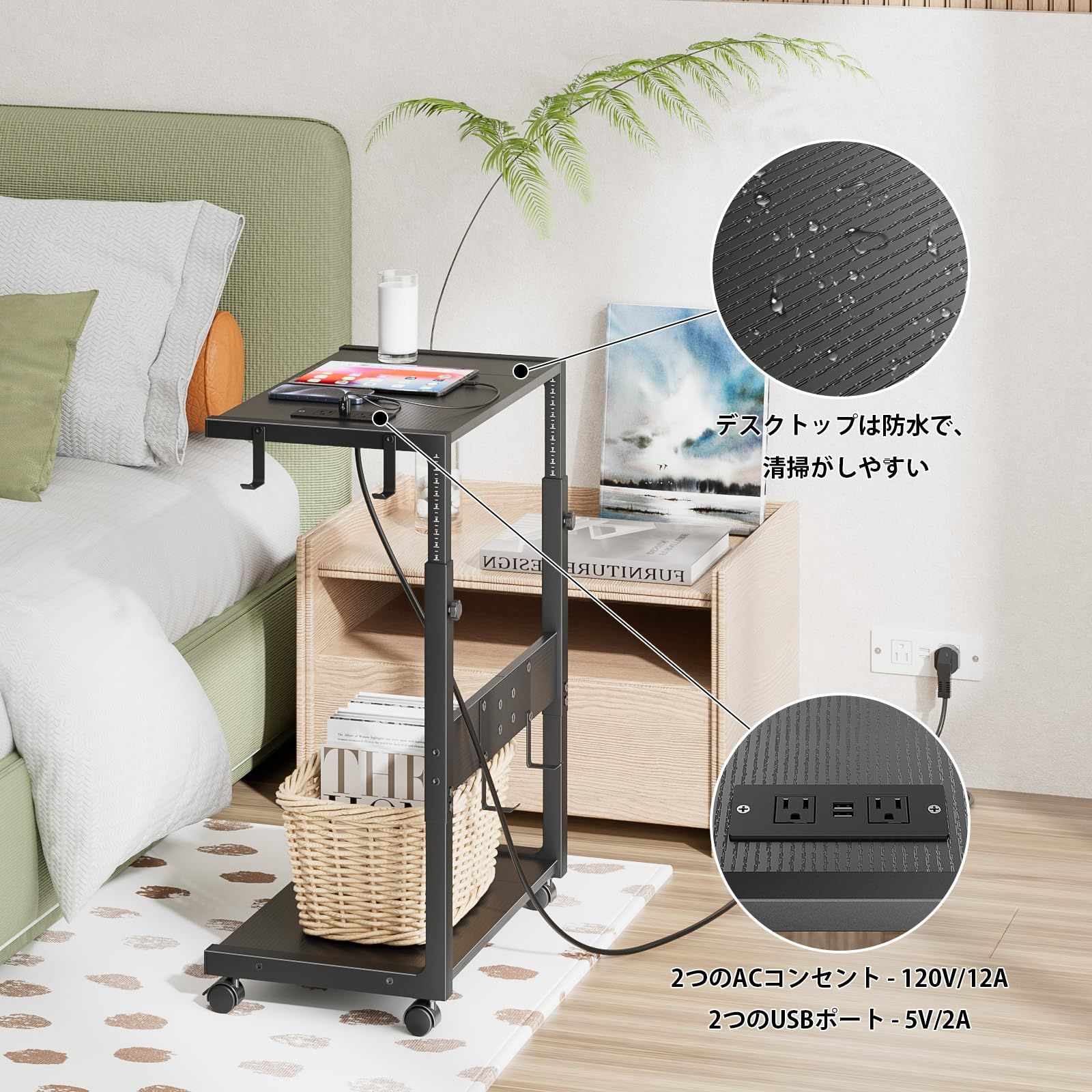 新品 EKNITEY サイドテーブル cpuスタンドキャスター付き コンセント付き高さ調整pcワゴン 多機能パソコンラック 幅49cm×奥行30cm×高さ59-72cm 木製 ブラック