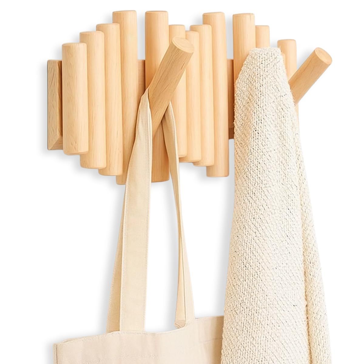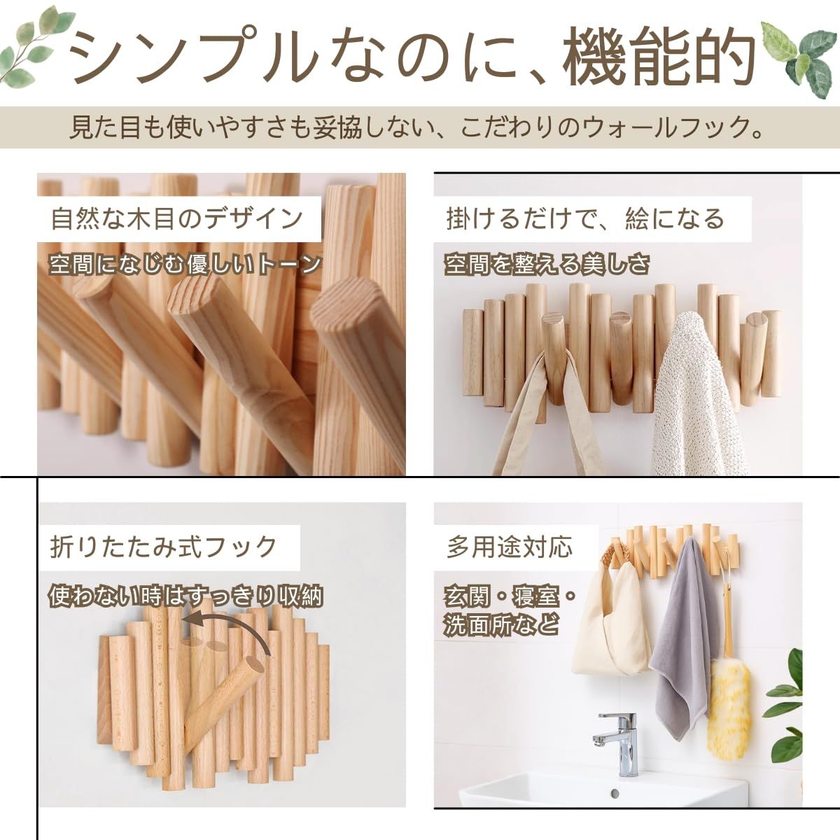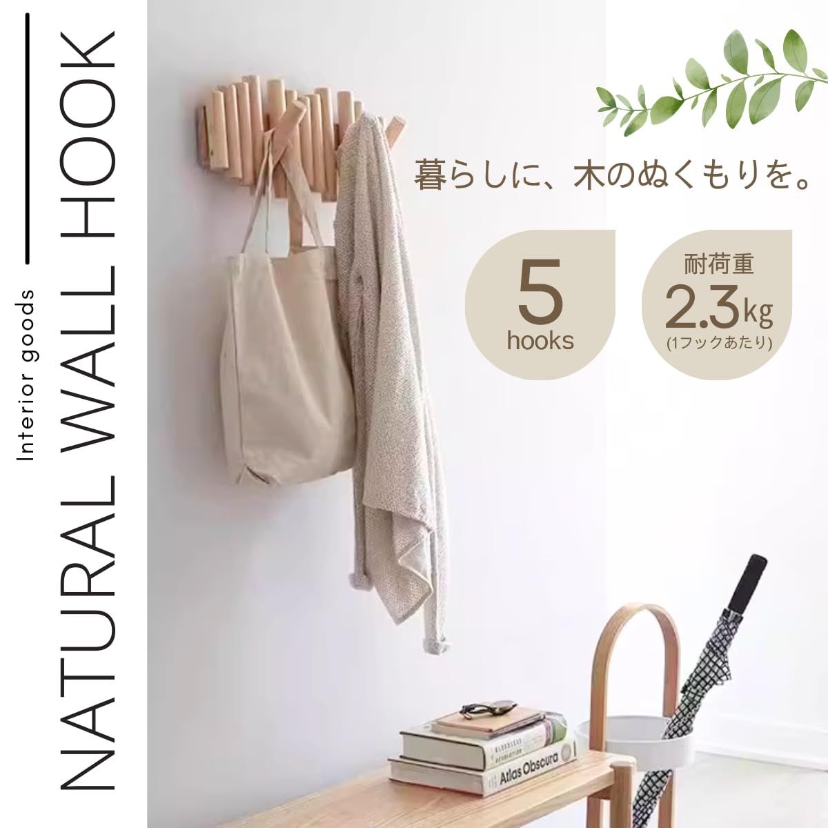 天然木のような優しい風合いと繊細な木目が美しい、上質な木目調デザインの壁掛けフック。温もりを感じるナチュラルな質感が、北欧風・モダン・ナチュラルインテリアなど、どんな空間にも自然に溶け込みます。無駄のないミニマルなフォルムは圧迫感を与えず、玄関やリビングを洗練された雰囲気に。掛けるだけで空間を整え、おしゃれなアクセントになる、見せる収納アイテムです。【5つの折りたたみ式フックで整理上手に】