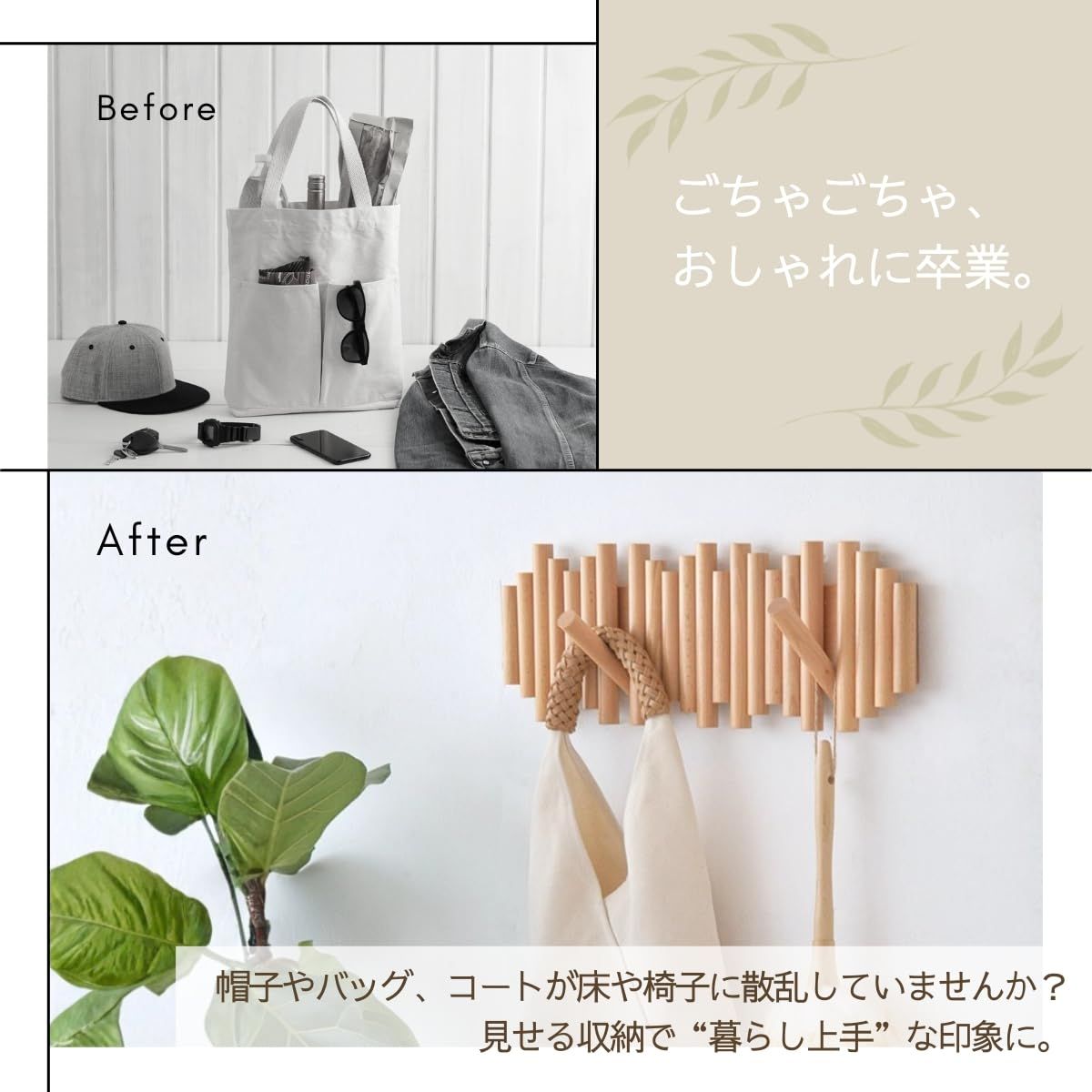 玄関ではコートや帽子、寝室ではバッグやアクセサリー、洗面所ではタオルや小物、キッチンでは調理器具の収納にも活躍。子ども部屋ではランドセルや通学グッズの整理にも便利です。壁面を有効活用できるため、省スペースでもスッキリとした印象に。木目調の上品なデザインがどんなインテリアにも自然になじみ、見せる収納として空間を美しく演出する多機能ウォールフックです。【木目のぬくもりとシンプルな美しさ】