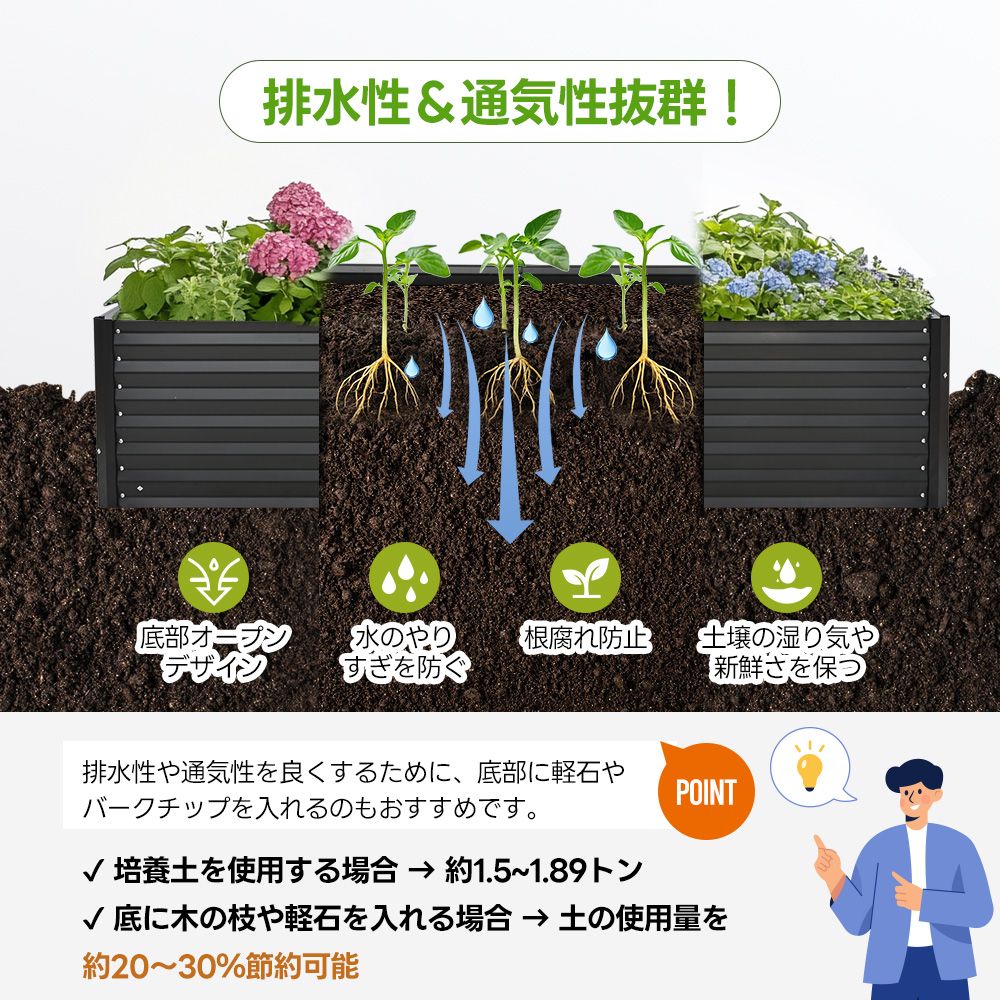 ◎04排水性&通気性抜群! 底部オープンデザイン 水のやりすぎを防ぐ 根腐れ防止 土壌を新鮮で適度に湿った状態に保つPoint:排水性や通気性を良くするために、底部に軽石やバークチップを入れるのもおすすめです。? 培養土を使用する場合 → 約1.5~1.89トン? 底に木の枝や軽石を入れる場合 → 土の使用量を約20~30%節約可能