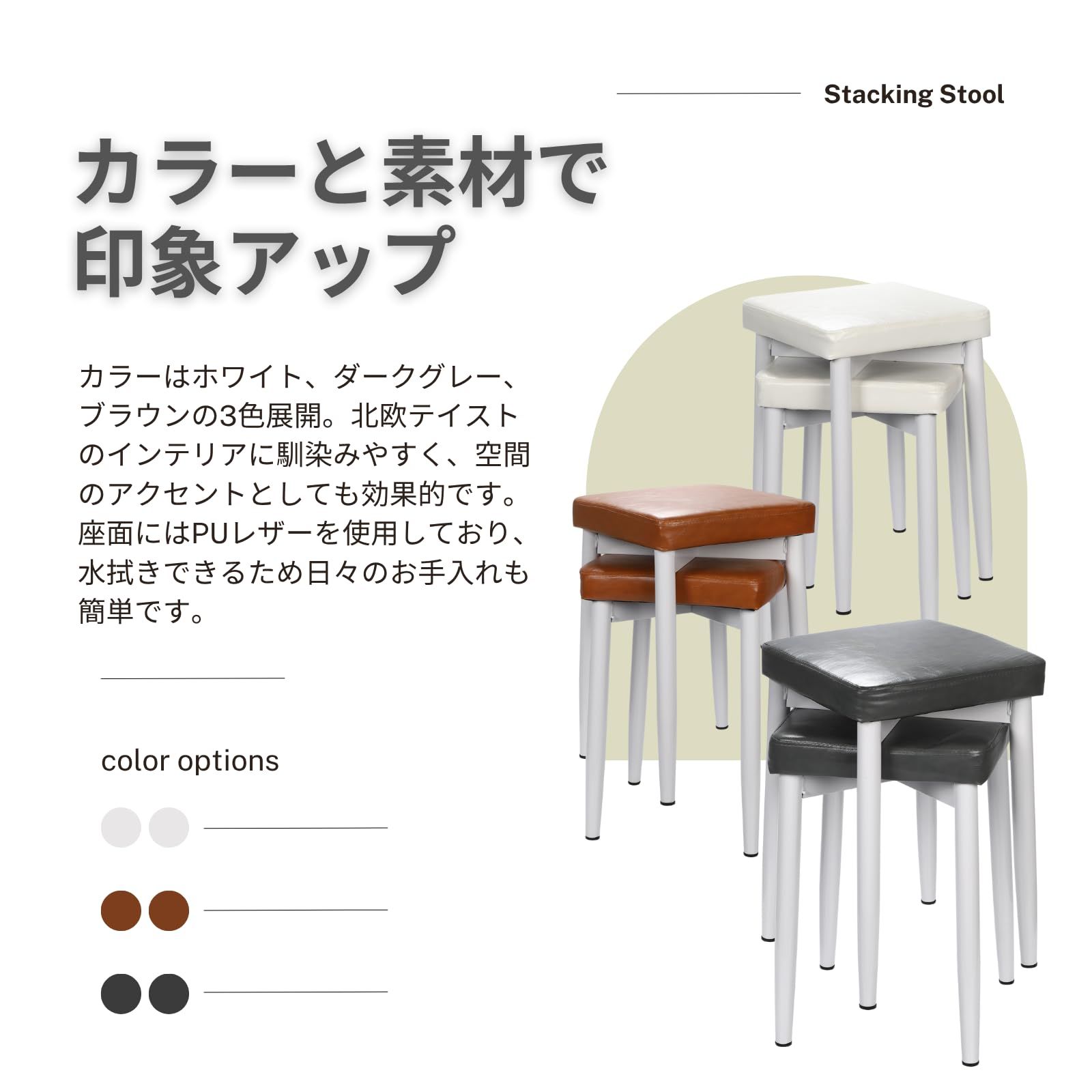 カラーはホワイト、グレー、オレンジの3色展開。北欧テイストのインテリアに馴染みやすく、空間のアクセントとしても効果的です。座面にはPUレザーを使用しており、水拭きできるため日々のお手入れも簡単です。