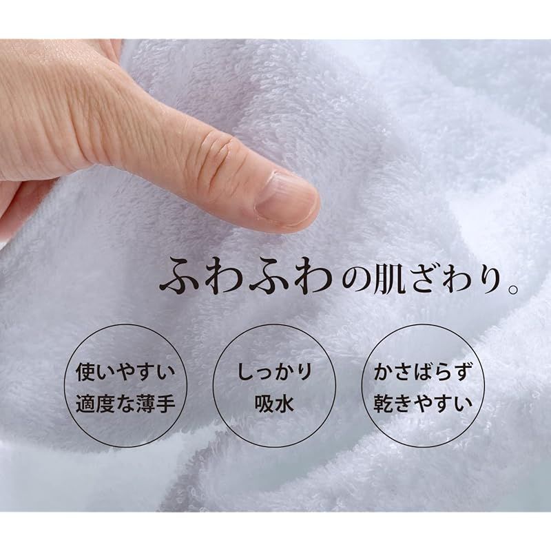 原材料にはホテル仕様にも使用される良質なコットンで出来た30番単糸を使用し、丈夫で吸水性と速乾性に優れ,心地よい肌触りと柔らかさのタオルです。