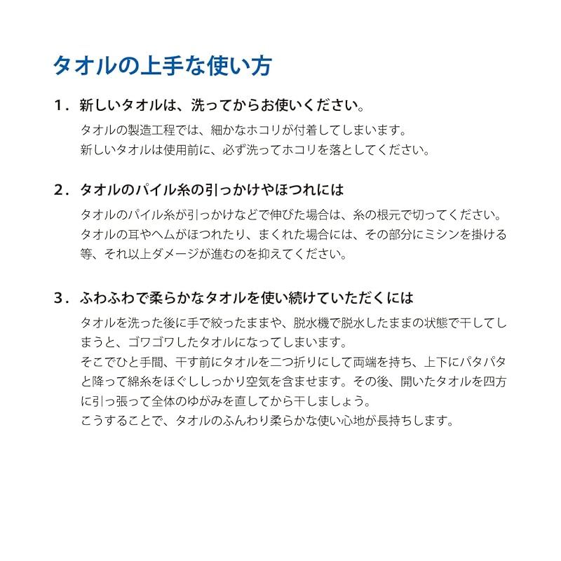 ◆ご購入後は、最初に洗濯ネットに入れての洗濯をお願いします。出来立てで洗濯前のタオルは縮んでおり、細かな埃が付着しております。◆柔軟剤の多用は毛羽落ちやパイル抜け、吸水力の低下が起こりやすくなりますので適度にご使用ください。「少しゴワゴワしてきたかな?」と、感じたタイミングでの使用をおすすめします。◆洗濯して干す際は、風通しの良い日陰をおすすめします。直射日光の場合ですと、ゴワつきやすくなるのでご注意ください。◆ドラム式洗濯機での乾燥およびタンブラー乾燥はタオルをふんわりさせやすい反面、毛羽落ちが起こりやすくなりますので、ご利用の際はご注意ください。