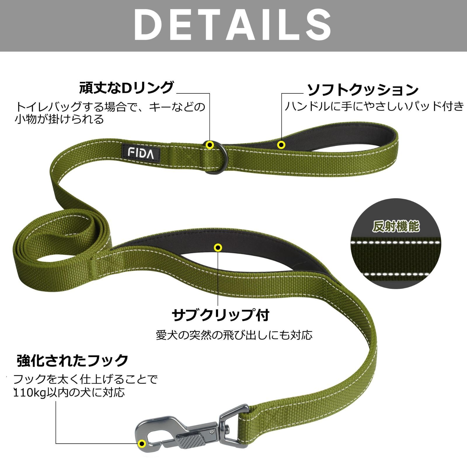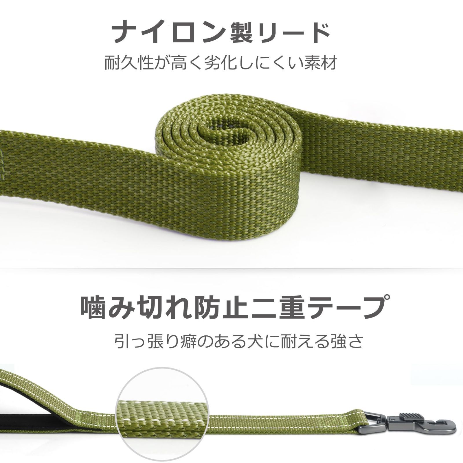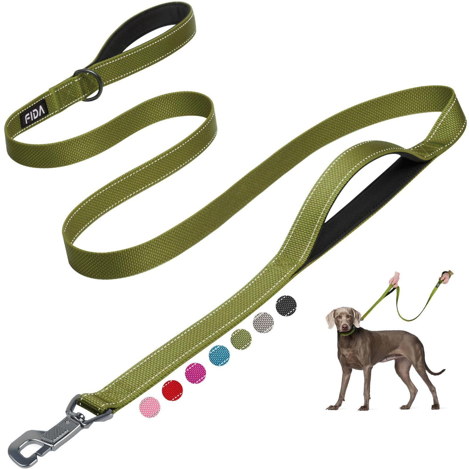 【在庫セール】犬用 ロングリード 持ち手2個 柔らかいパッド付き リード 小型犬 中型犬 大型犬 ペット用 Fida 訓練リード 夜間反射 (1.8m グリーン)