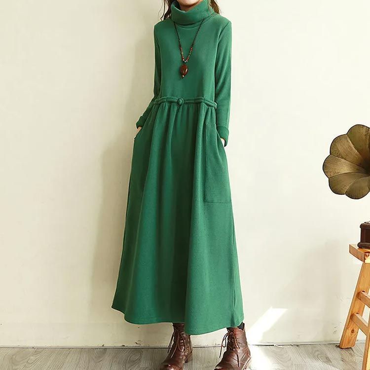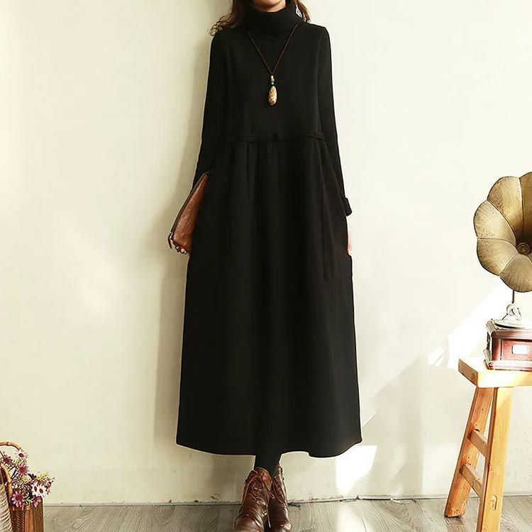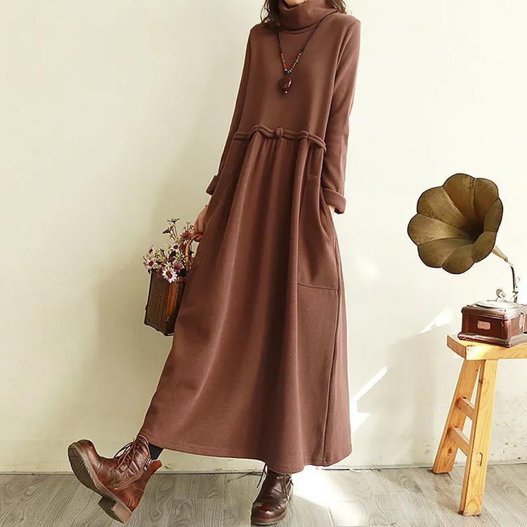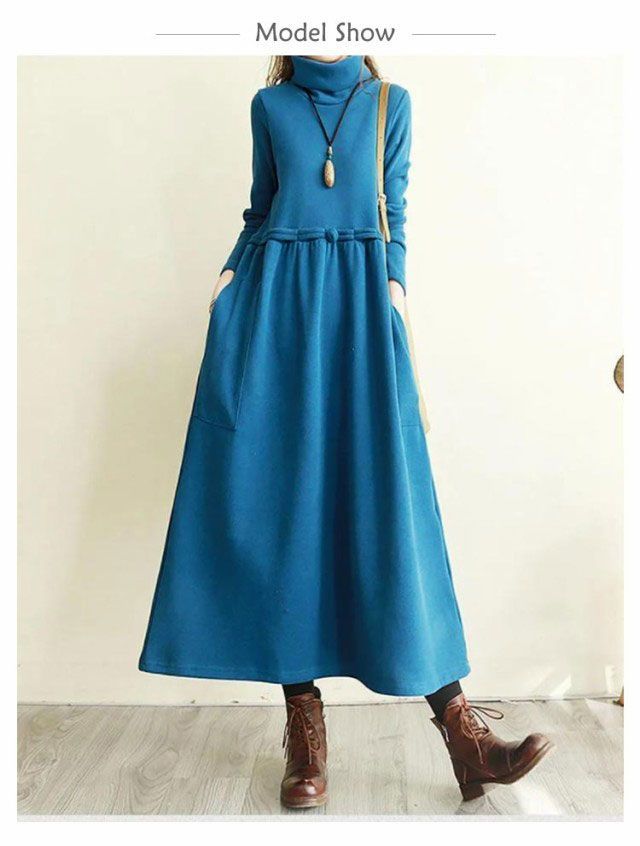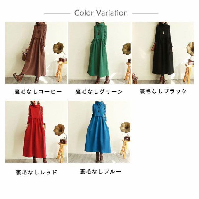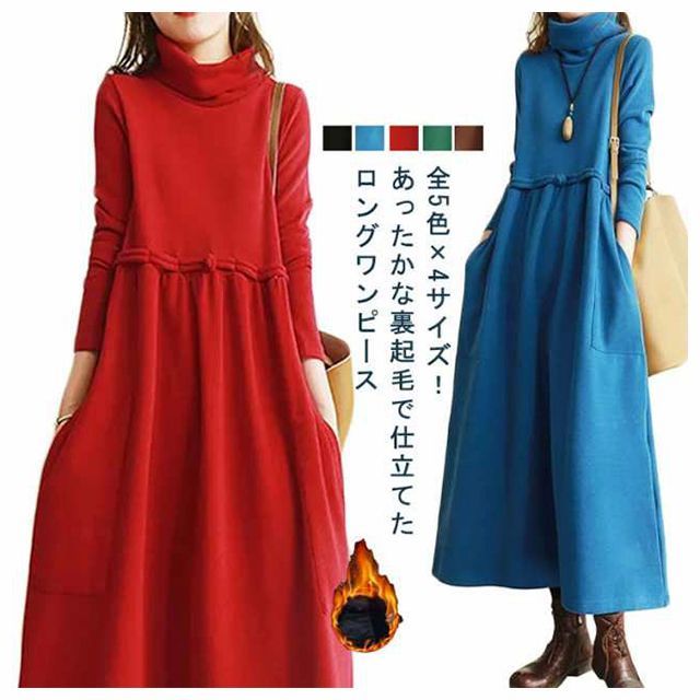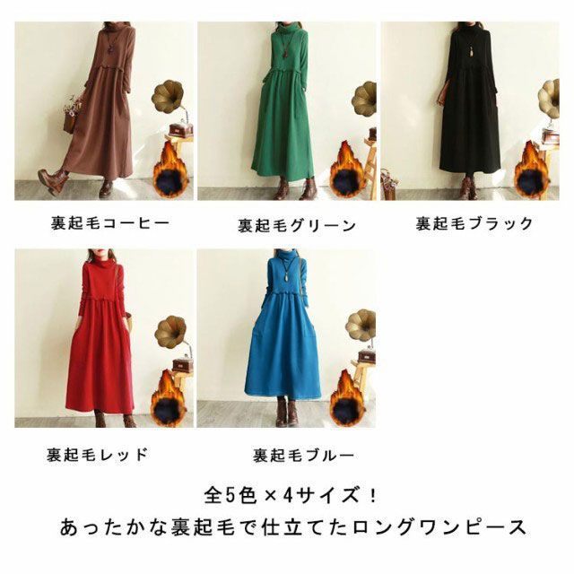 ロングワンピース 秋冬 ハイネックワンピース 長袖 ゆったり マキシワンピース マキシ丈 冬服 裏起毛 あったか 重ね着 ワンピース ポケット付き 冬物 カジュアル ゆったり 体型カバー 無地 シンプ#kym2205