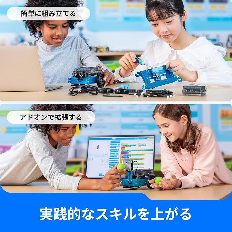 【簡単に使える】ステップバイステップのガイドに従って、mBot2プログラミングロボティクスキットを最初から組み立てます。mBot2には8つ以上のモード(ドライブ、描いて走る、ミュージシャン、音声制御、コード、ビルド、WiFiなど)があり、アプリを通じて遊べます。シンタックスを気にせずにブロックを使ってコーディングできます。1回の充電で最大5時間のプレイタイムを楽しみ、Bluetooth、USB、WiFiの切り替えが可能です。mBot2ロボットキットをいつでもどこでも使用できます。