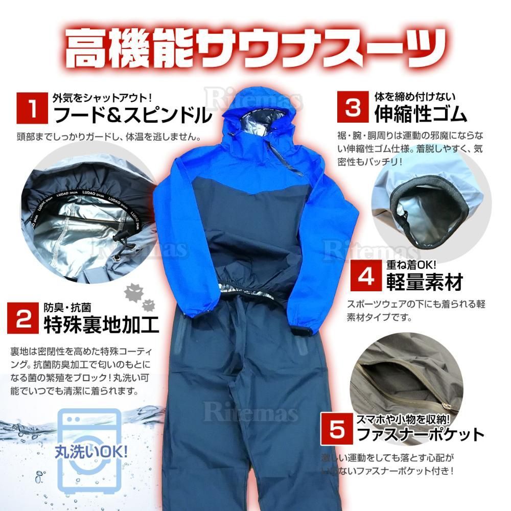 着るだけで発汗効果! トレーニングやウォーキングにスポーツウェアの下にも着られる軽素材タイプです。 ・防寒着にも最適! 特殊コーティング加工による保温効果で外気を遮断、体温を逃しません! 【充実の機能】 再帰反射機能・軽量素材使用・消臭機能(銀で消臭)・発汗機能! 安心の反射素材を使用した本格的サウナスーツです。 抗菌防臭加工で匂いのもとになる菌の繁殖をしっかりブロック! 洗濯機で丸洗いも可能なのでいつでも清潔にご使用いただけます。 軽量素材で動きやすく、・体重コントロールをされている方はもちろん、 シェイプアップしたい人、むくみ解消や体質改善をしたい人にも大変オススメです! ■軽量素材で動きやすく、ランニングや流行りのスロージョグなどの有酸素運動に大活躍。 ■内側に特殊なシルバーコーティング使用し、裾・腕・胴周りのゴムの密閉度を従来のものより200%上げているため、保温性に優れ、少しの運動で汗ビッショリになります。 ■汗をかきやすい体質を作ることが基礎代謝を上げ、や美容体型への近道となります。 ■抗菌防臭加工で匂いの元になる菌の繁殖をしっかりブロック!洗濯機で丸洗いも可能なのでいつでも清潔にご使用いただけます。 ★サウナスーツを使えば・・・ ・通常の運動よりも更に発汗が促され、脂肪燃焼・に効果的です。 ・運動時以外にそのまま着る場合も、普段の家事などでも運動しているような状態に。 ・日常的な、トレーニング、フィットネスなどに役立ちます。 ・高い保温性により効果的な発汗を促し、減量効果が期待できます。 ★こんな方におすすめ ・汗をかきにくい方 ・有酸素運動で効率よく汗をかきたい方 ・、体重コントロールをされている方 ・スポーツの効率的なウォームアップを考えている方 ・防風、防寒用アウターとして考えている方 ★洗濯について ・必ず中性洗剤をご使用ください。 ・洗浄後は、涼しく乾燥した場所で干してください。 ・変色の原因となる塩素系漂白剤の使用は避けてください。 【商品仕様】 材質:100%ポリエステル カラー:ブラック サイズ:3XL 【注意事項】 以下の内容を必ずご確認ください。 ※ ご使用前に内容物に問題が無いことを確認してください。 ※ ご使用後の返品返金・交換には応じられません。必ずご使用前に不良箇所が無いか確認してください。 ※ 商品到着後のサイズ交換や他のカラーへの交換などは受け付けておりません。 ※ 分解、改造、その他想定外の使用による事故及び損害に関しては保証いたしません。 ※ 本製品のご使用は自己責任でお願い致します。 ※ 本製品を使用して事故や損害が発生しましても当社では責任を負いません。 ※ 輸入品の為、スレや傷が有る場合が有ります。 ※ 輸入品の為、外観に仕様変更などが施される場合がございます。