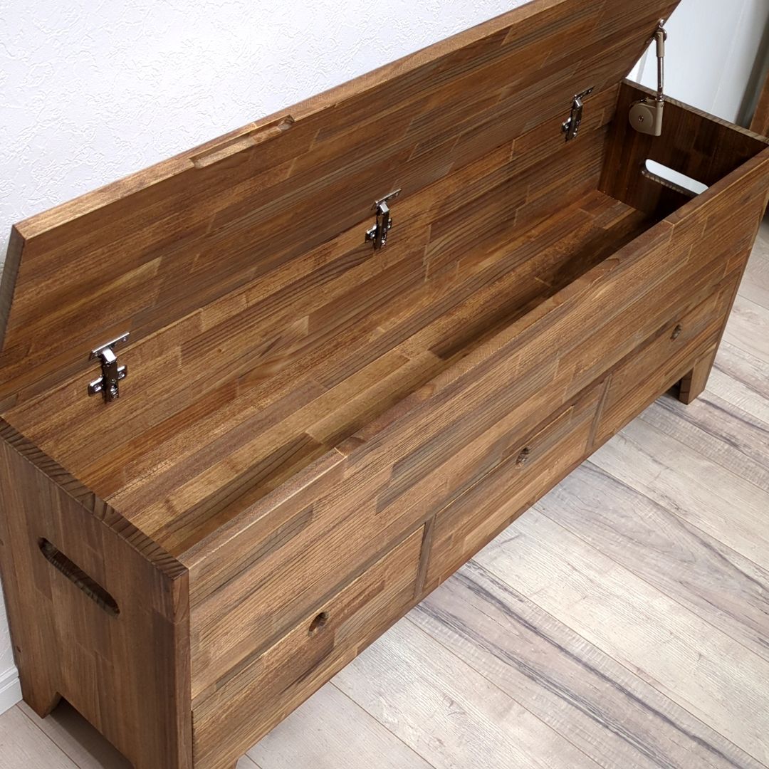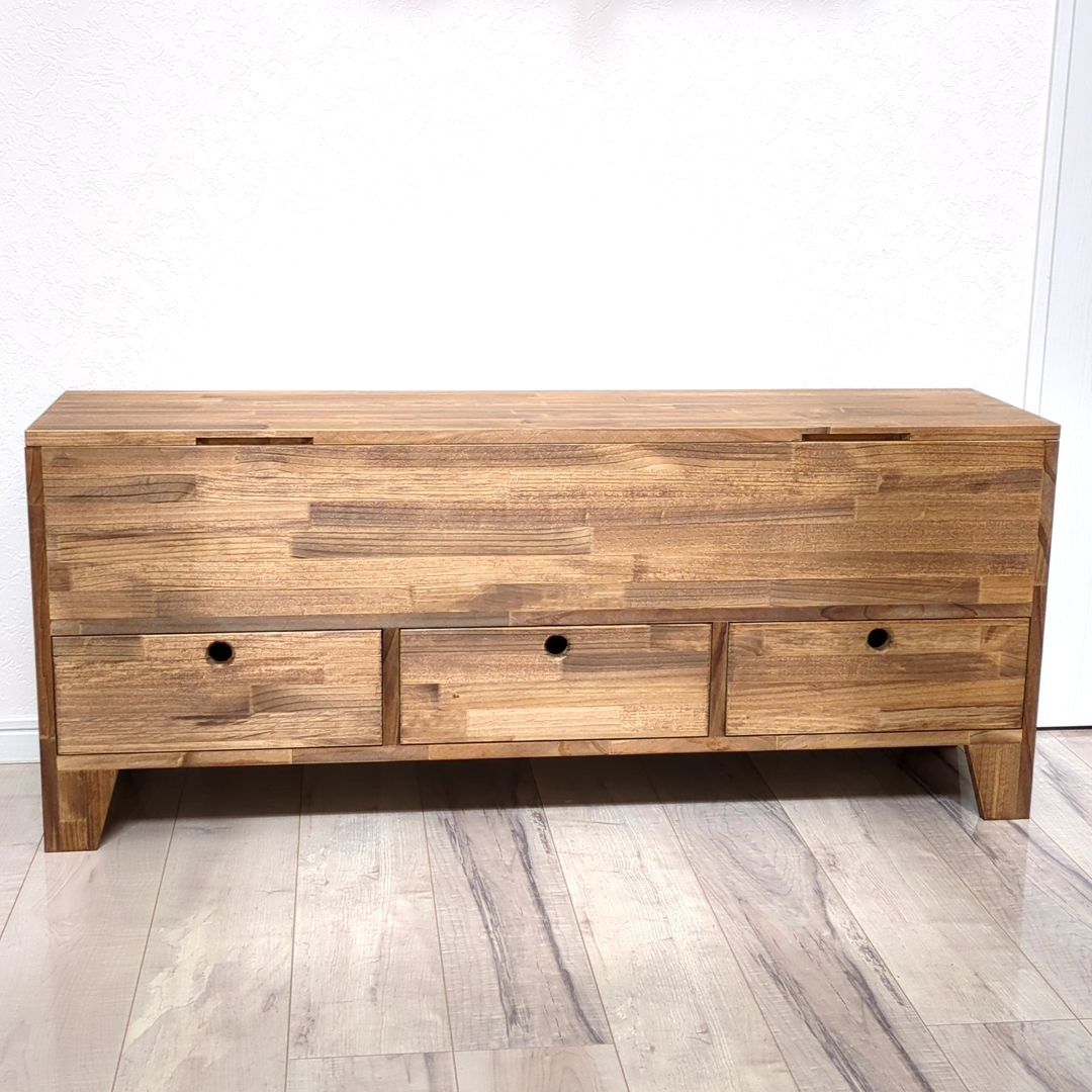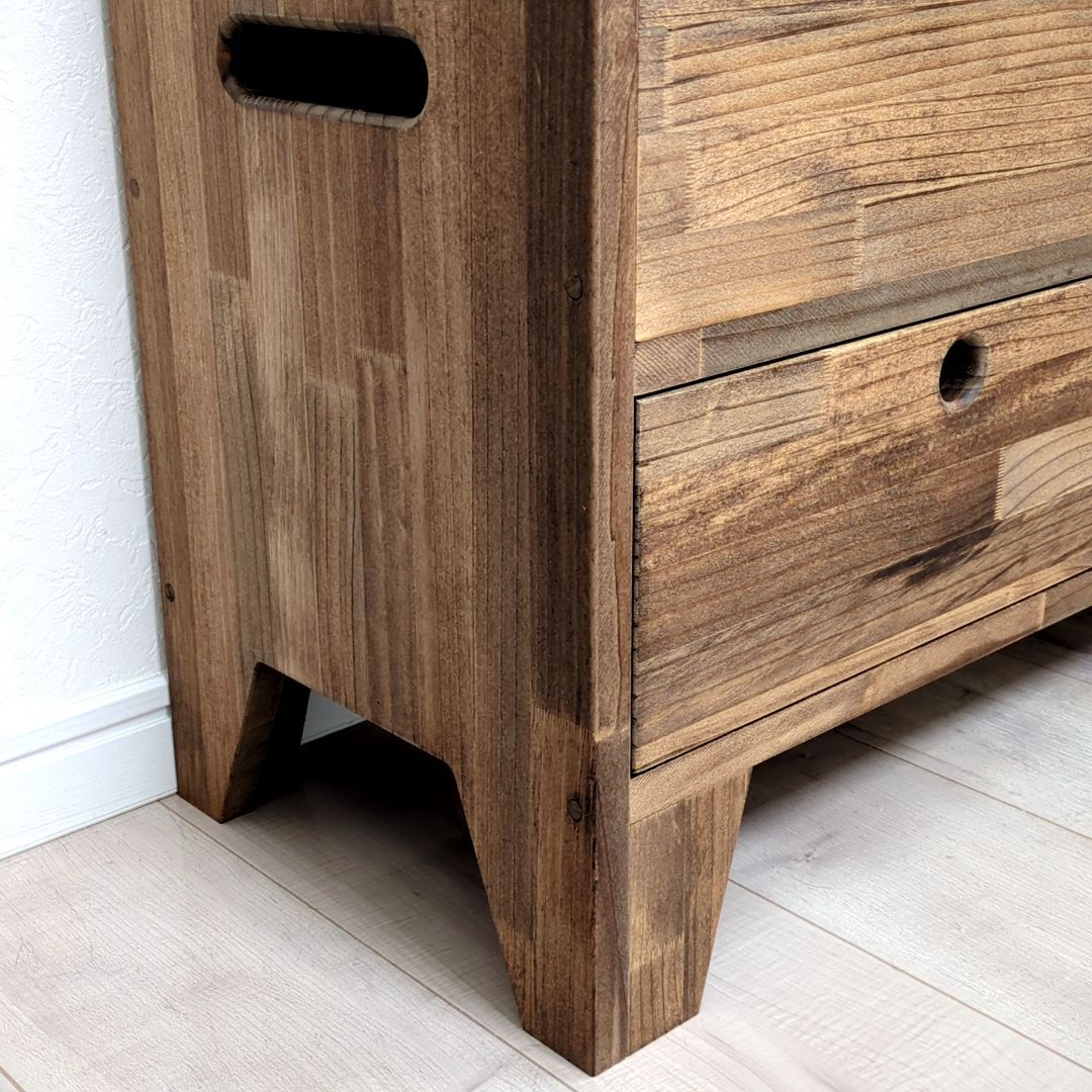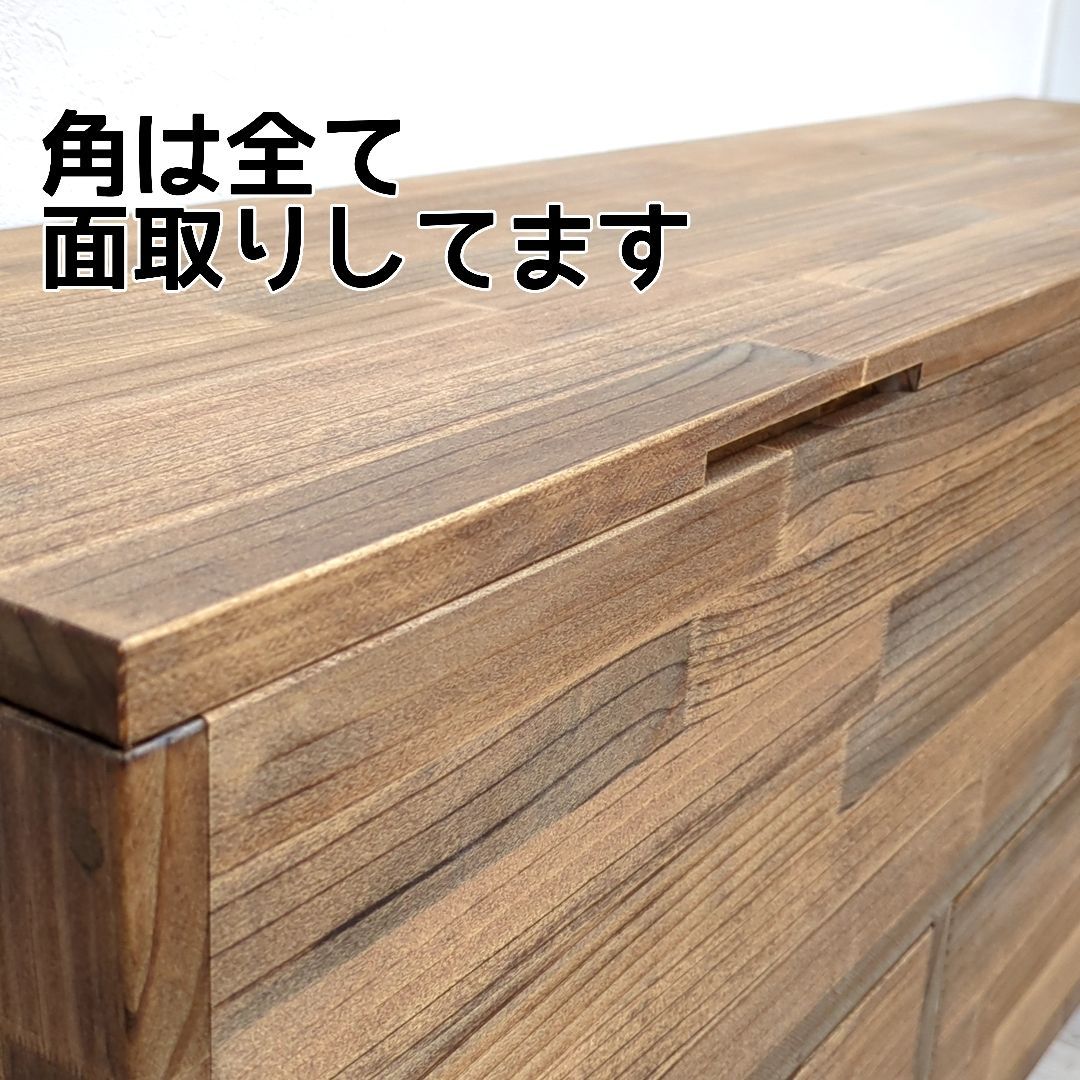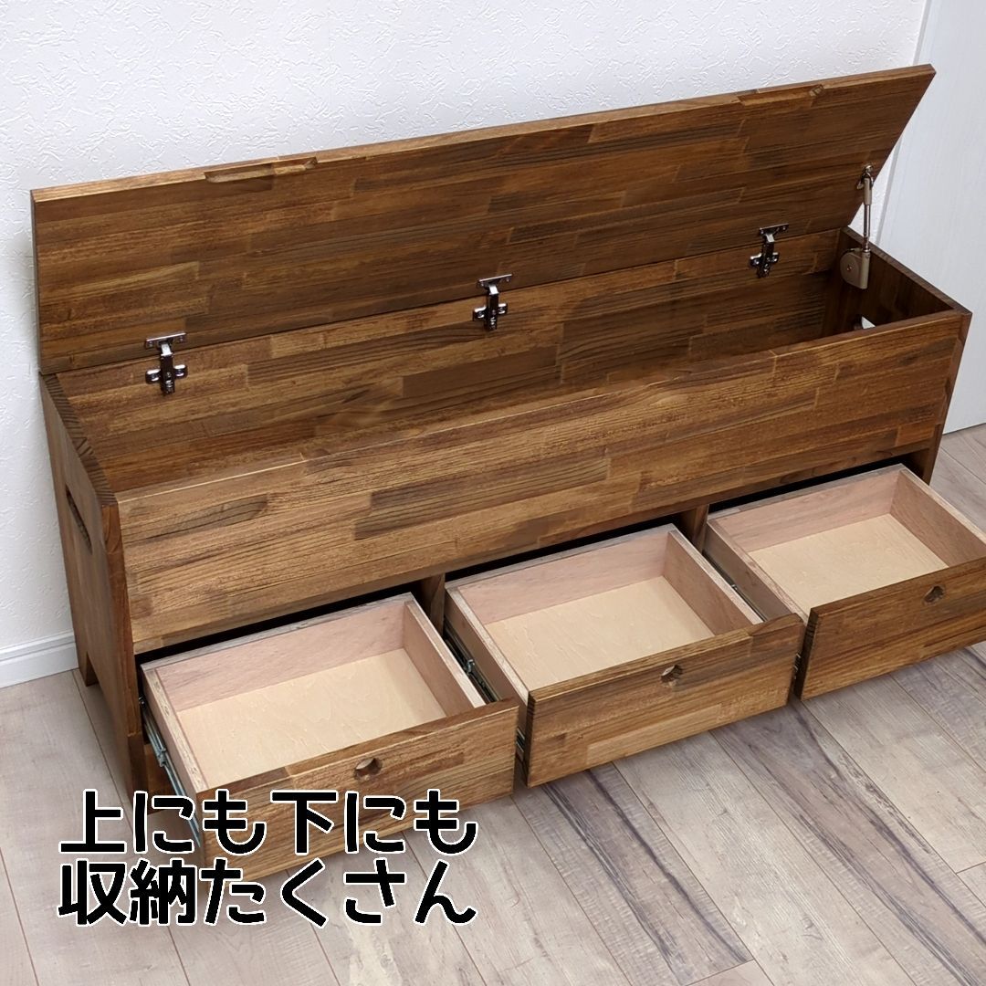ご覧いただきありがとうございます。 こちらは受注生産となっております。 製作期間は2-3週間程度となります。 【商品説明】 収納ボックスって椅子代わりにもなるし、収納力もあるけど、中がごちゃついていませんか? せっかくの収納スペースが無駄になっていませんか? ●ポイント1 大きなボックス部分の下に3つの引出しを設けました。 細かいものから大きなものまで分別出来て、整理整頓にも役立ちます。 また、引出し部分は取手を使用していないので、腰掛けた際も邪魔になりません。 ●ポイント2 収納ボックスは形がシンプルな分、持ち運びに不便の為、左右に持ち手を設けました。 ※重いものを収納している場合は、引出しを取り出すなど重量を軽くしてから移動させてください。 ●ポイント3 ソフトダウンステーを使用しており、手を離してもゆっくりと閉まりますので、小さなお子様がいても安心です。 開口時の角度は約70°となります。 他にはないオリジナルのデザインで、見た目のインパクト、職人のこだわりが垣間見える商品となっております。 また、取っ手を無くすことで座った時に取っ手が足元で邪魔にならないように仕上げました。 【カラー】 ダークウォルナット(クリア、ミディアムウォルナット。ご指定ない場合はダークウォルナットとなります) 【サイズ】 全体のサイズ:横幅120cm奥行30cm×高さ50cm 上段内寸:横幅116.5cm奥行26.5cm×高さ20cm(天板補助材部分マイナス2cm) 各引き出し内寸 : 横幅32cm奥行23.5cm×高さ13cm(引き出し横板の高さは8cmとなります) ※ご希望のサイズで作成も可能ですので、ご購入前にお気軽にお問合せください。 【素材】 パイン材、ラワン合板、ベニヤ 【加工について】 ●植物油ベースのワトコオイル(ダークウォルナット)で塗装しております。 【注意事項】 ※北海道、沖縄を含む、離島の方は配送不可の地域がございますので、事前にお問い合わせください。 ※ハンドメイド品であることをご理解の上ご購入お願い致します。 ※観葉植物や小物は商品に含まれませんのでご注意ください。 ※天然木を使用している為、商品により若干反りや傷がある場合がございますので予めご了承ください。 ※光の加減により若干色味が異なる場合がございますので予めご了承ください