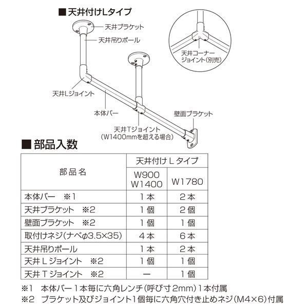【付属品】本体バー1本、天井ブラケット1コ、壁面ブラケット1コ、天井吊りポール1本、天井Lジョイント1コ、六角レンチ1本、取付ネジ(ナベ3.5x35mm)