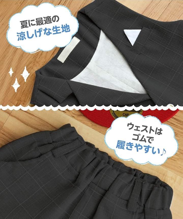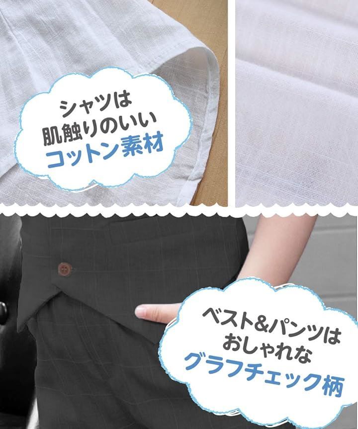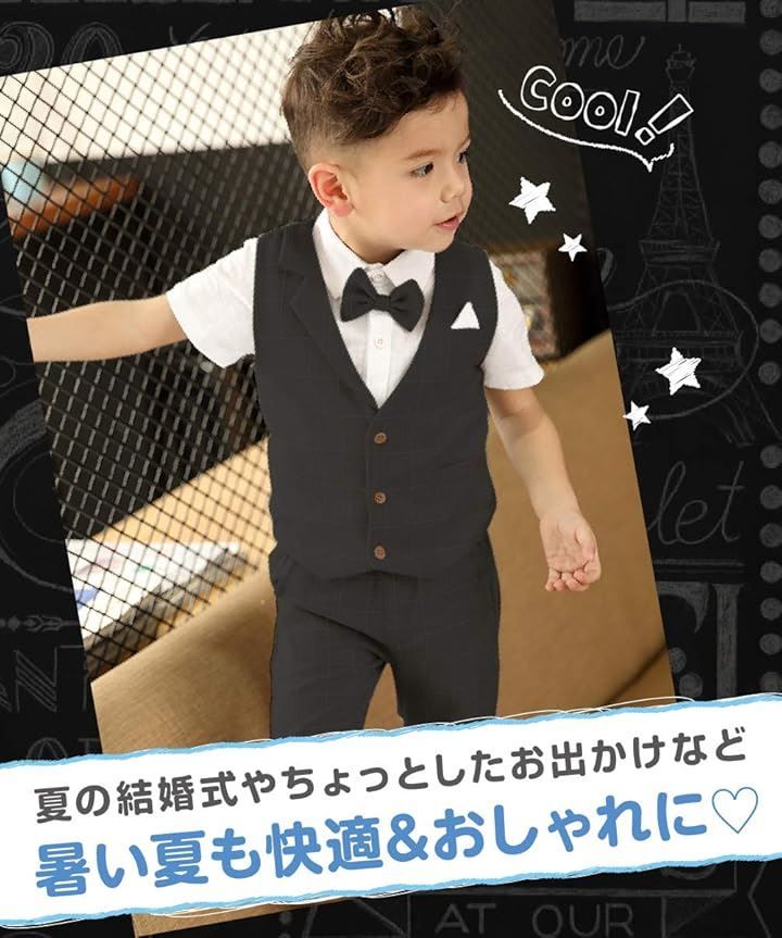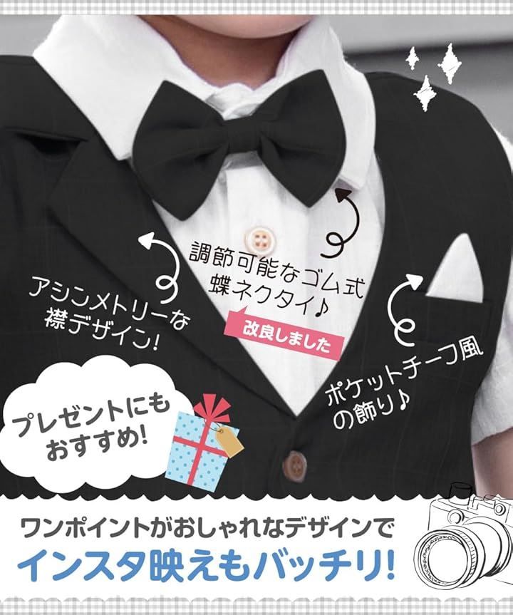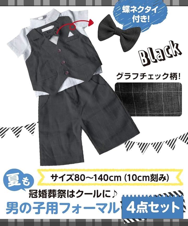 しあわせ倉庫 子供 スーツ 男の子 フォーマル 半袖 4点セット ワイシャツ ベスト 半ズボン 蝶ネクタイ チェック柄 夏 結婚式 発表会 七五三 誕生日 お呼ばれ 記念撮影(ブラック, 80)