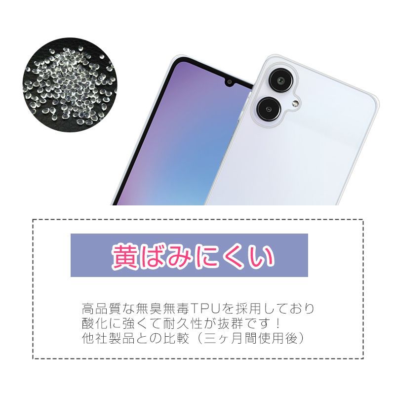 黄変しにくい素材を採用. 一般的なTPU製のケースの多くは、使用につれて黄色く変色してしまいます。 本製品は特殊な素材を採用し、一般的なものに比べて変色しにくくなっています。