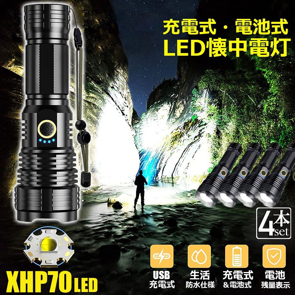 懐中電灯 XHP70 強力 防水 4個セット USB充電式 電池式 LCD残量表示 ズーム機能 5モード調光 TYPE-C入力 ledライト フラッシュライト かいちゅうでんとう led 明るい ハンディライト 登山用品 防災 停電対策 夜釣り SOS ライト
