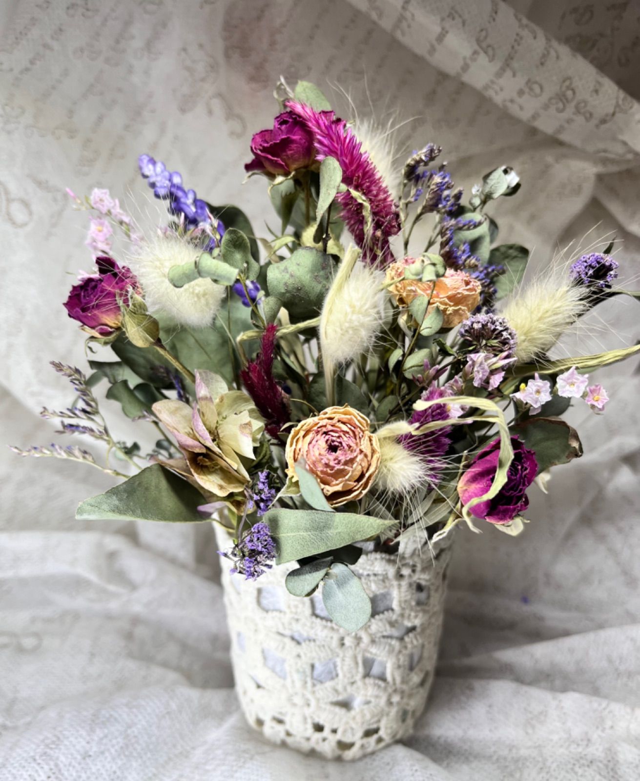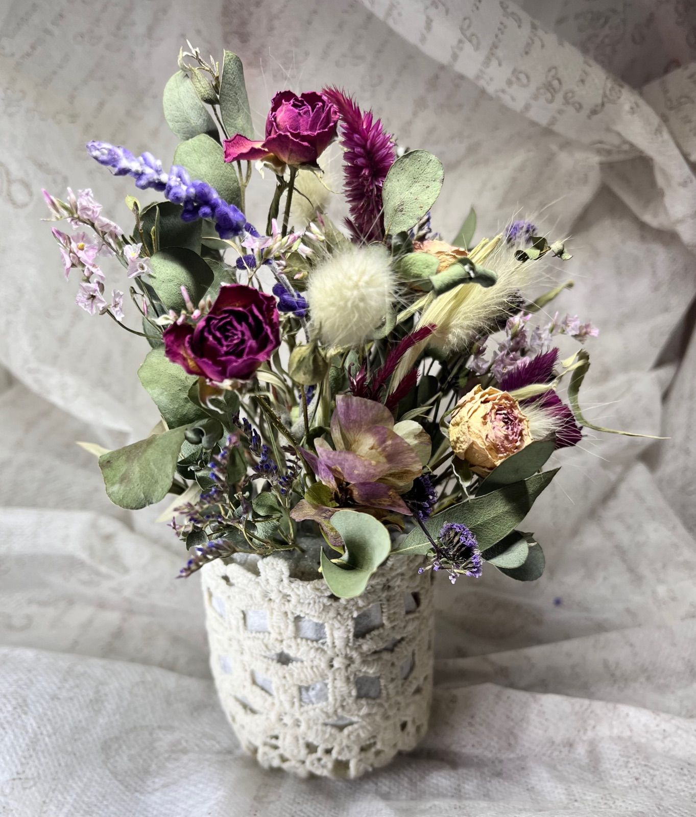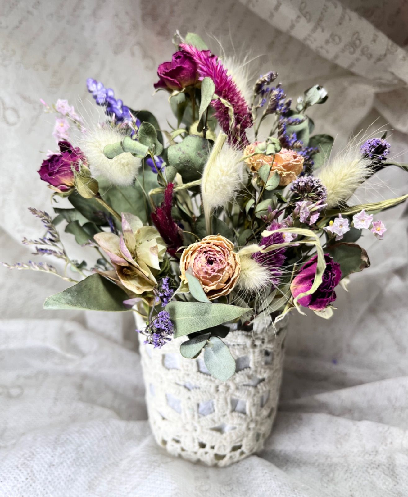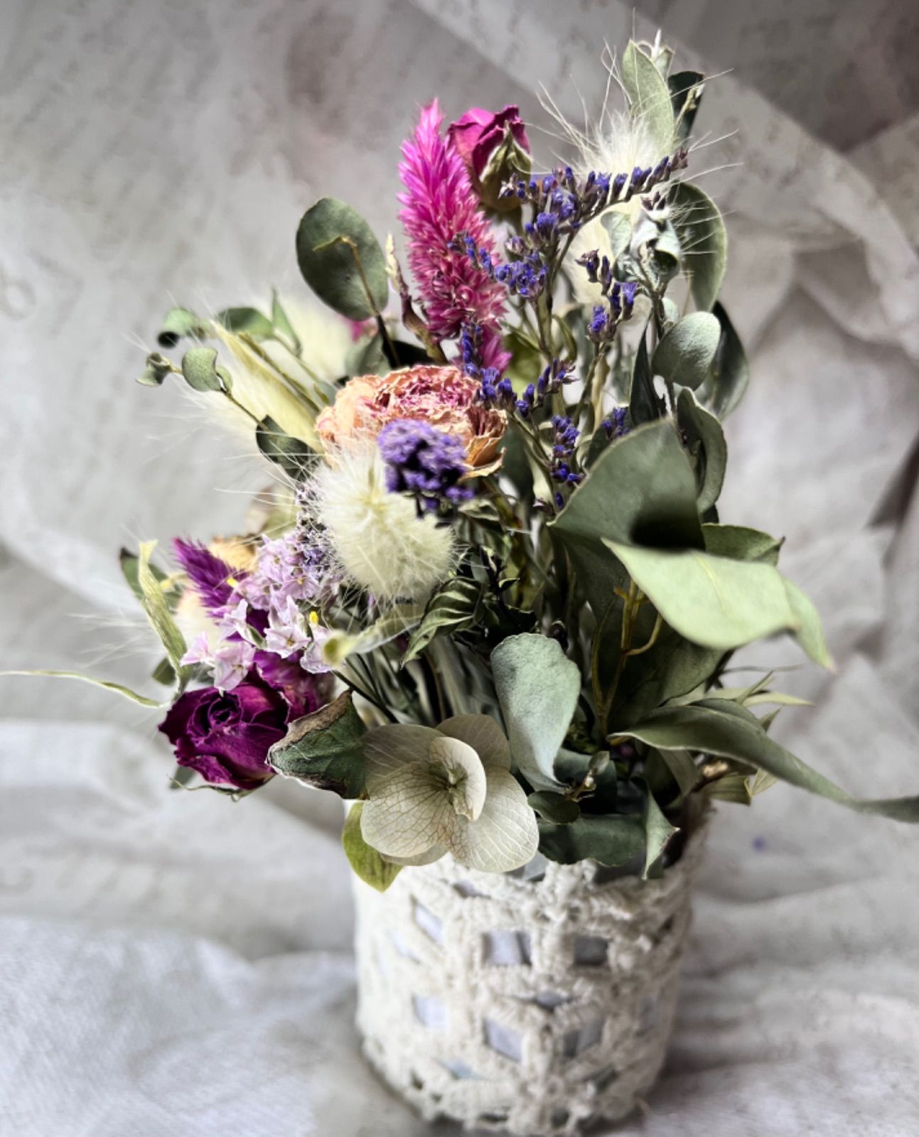 大人かわいいレースカゴのドライフラワーアレンジ