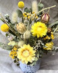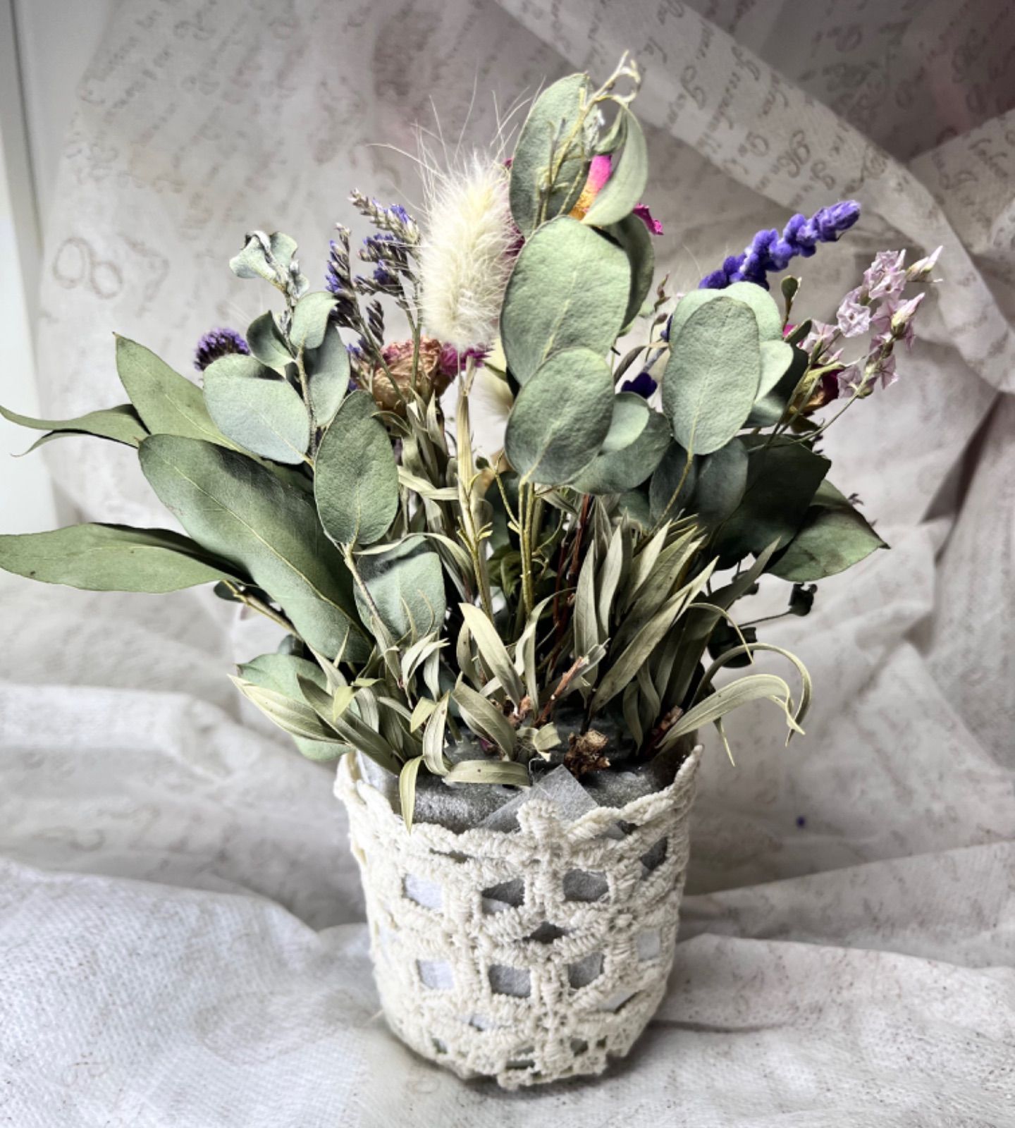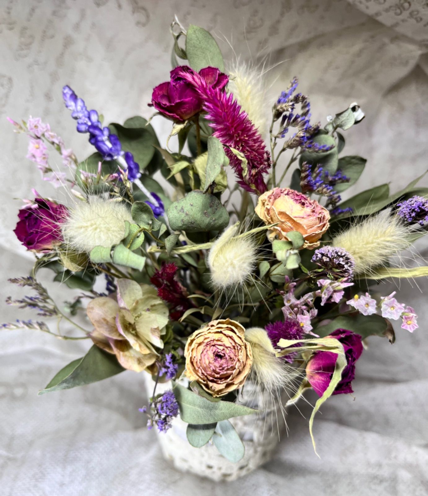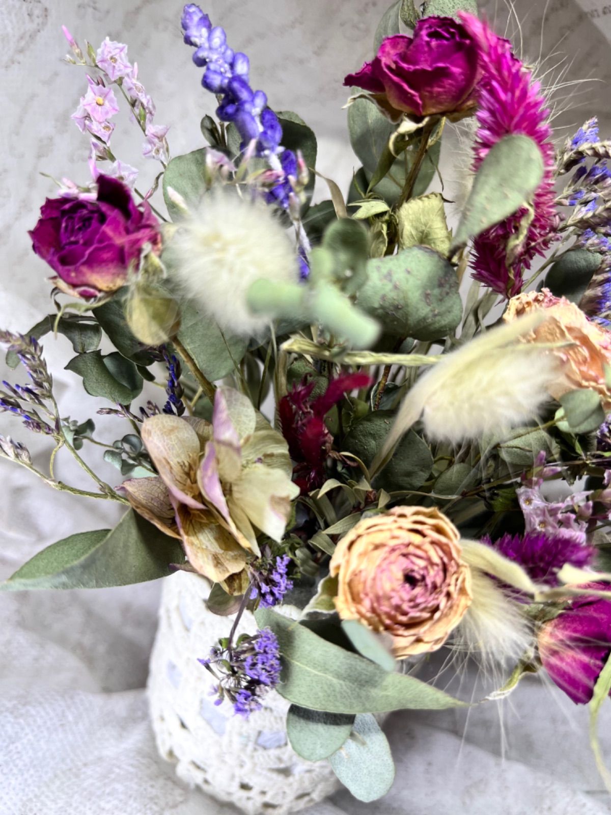 大人かわいいレースカゴのドライフラワーアレンジ