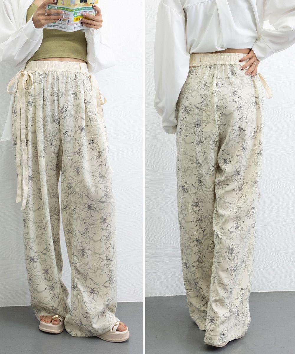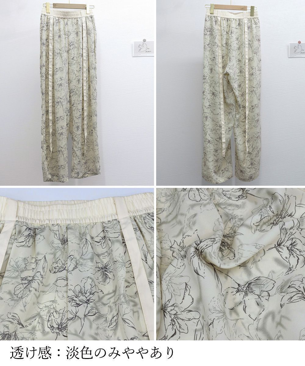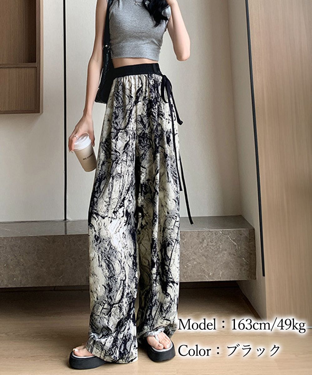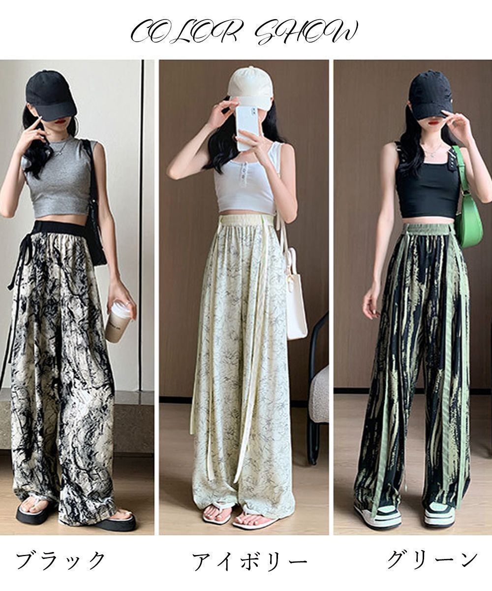 総柄 ワイドパンツ レディース ウエストリボン ストレートパンツ ウエストゴム イージーパンツ 体型カバー 冷感タッチ ボトムス ハイウエス