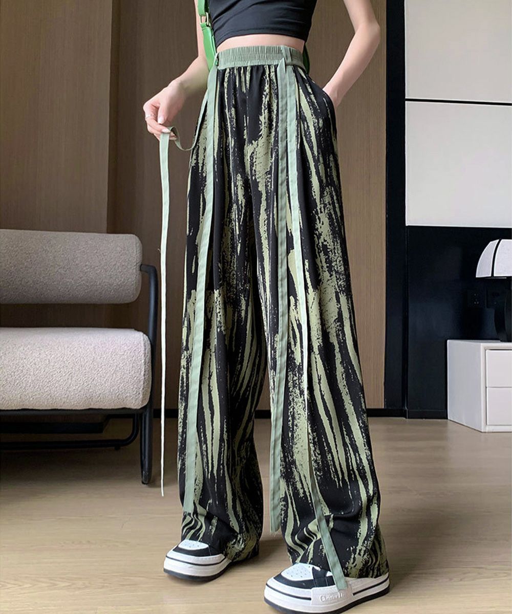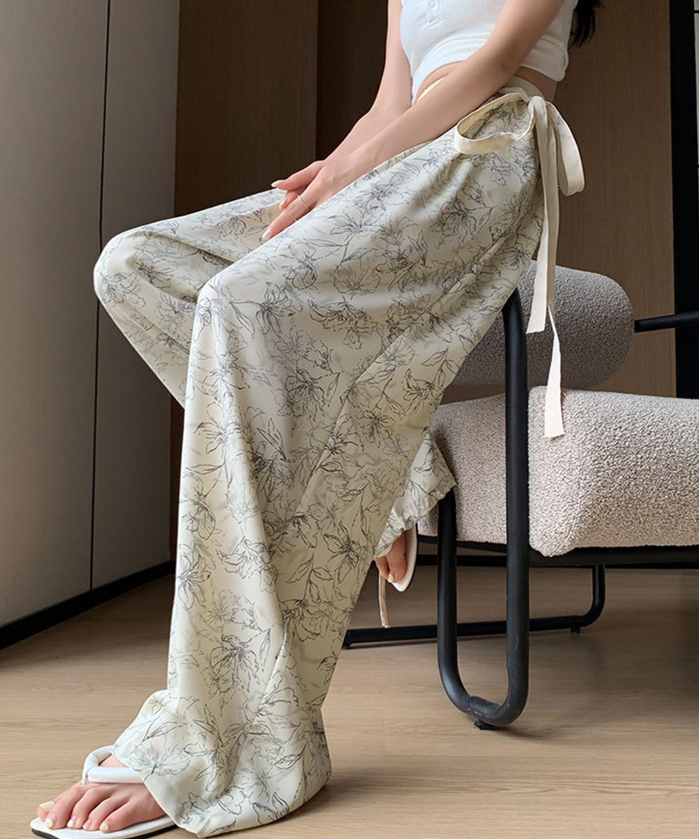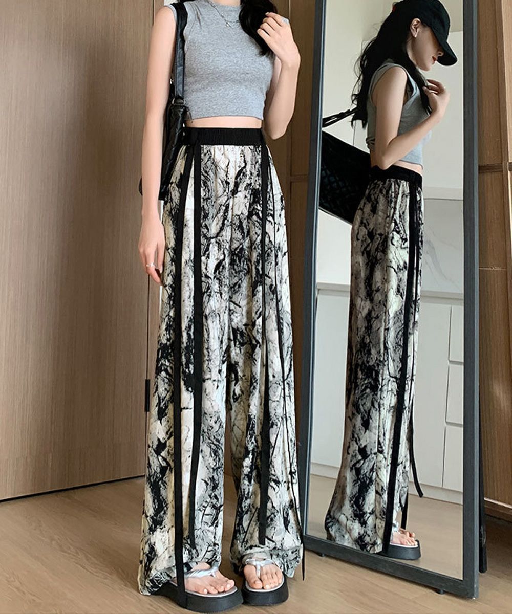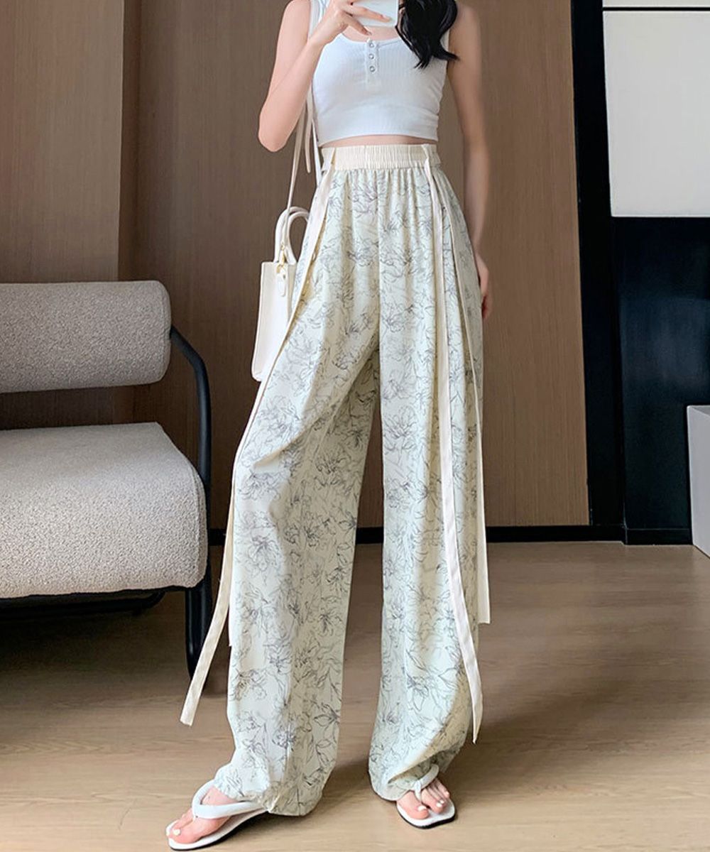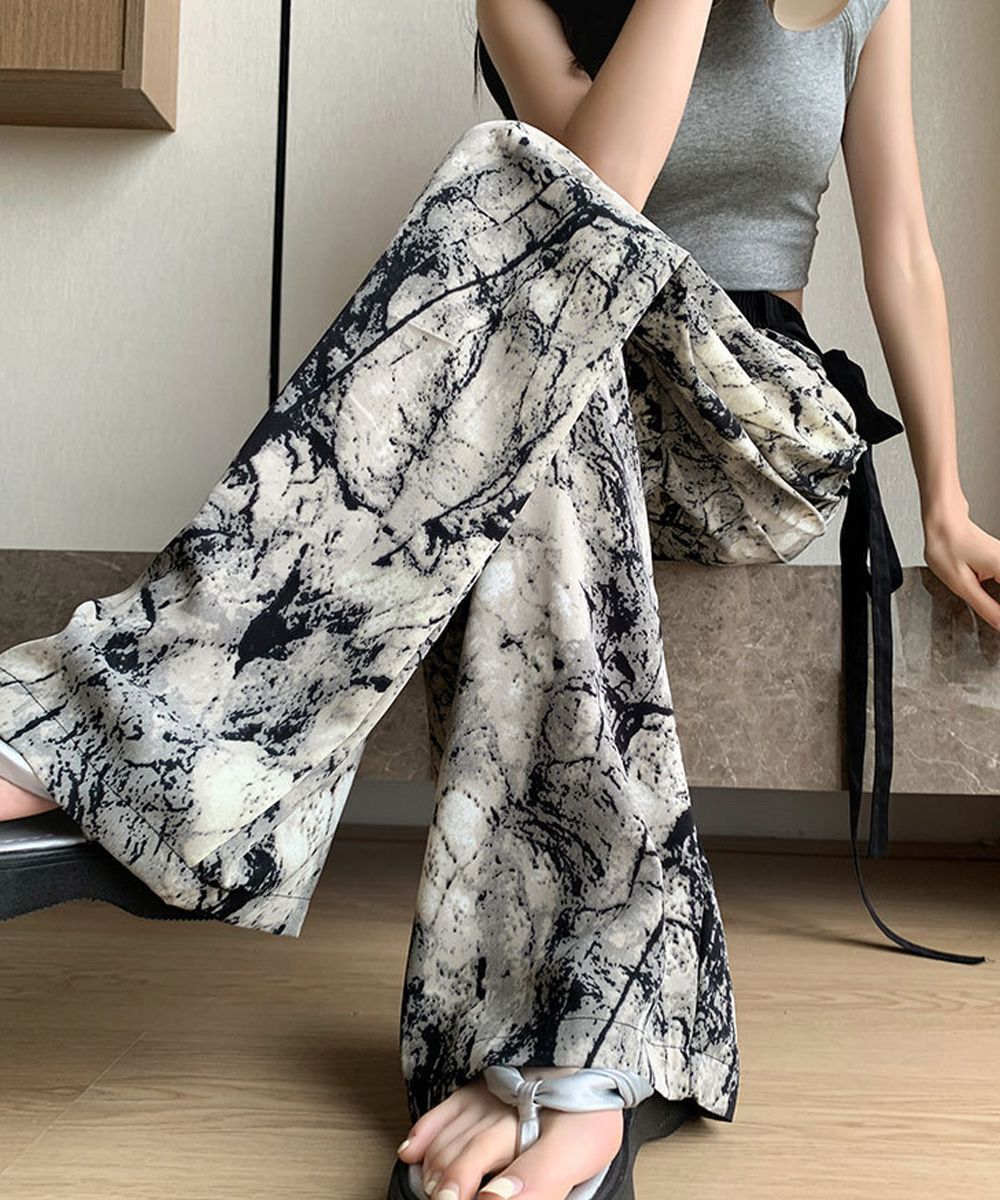 総柄 ワイドパンツ レディース ウエストリボン ストレートパンツ ウエストゴム イージーパンツ 体型カバー 冷感タッチ ボトムス ハイウエス