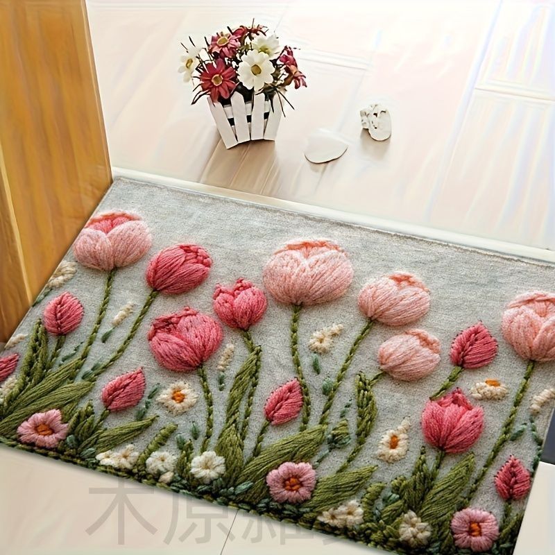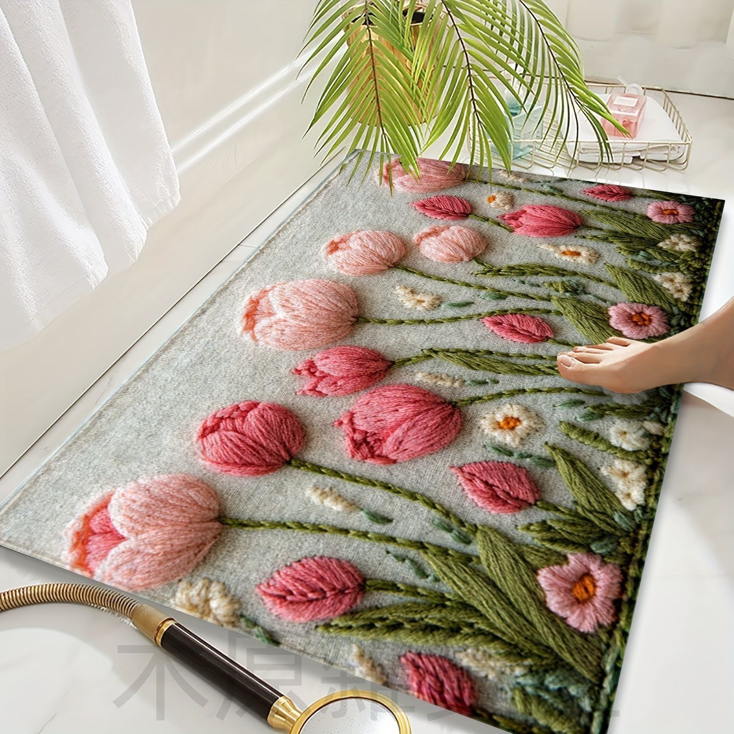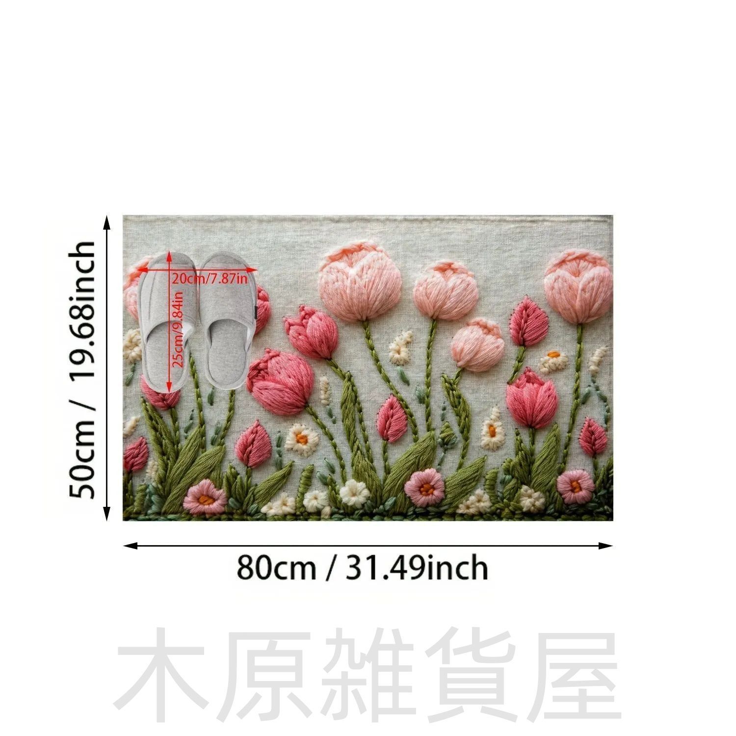 マット 刺繍デザイン 花 チューリップ ポリエステル 滑り止め 速乾 吸収 洗濯機可能 キッチン トイレ バスルーム 50×80cm
