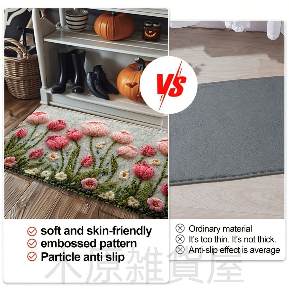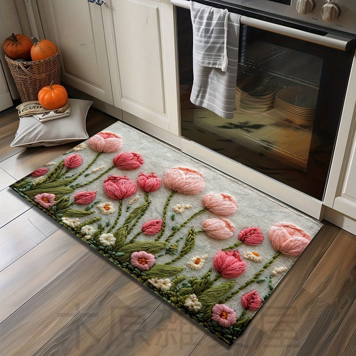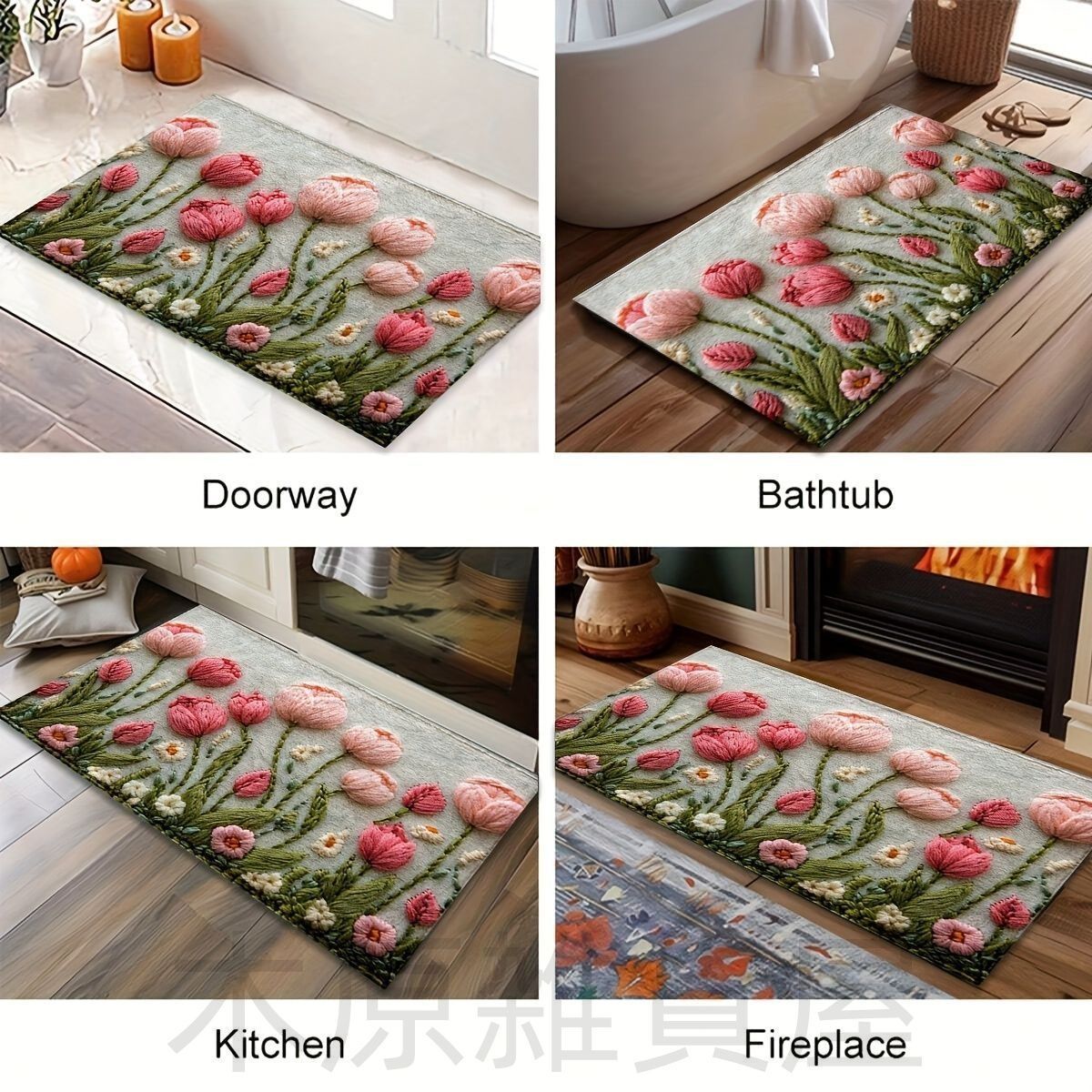 マット 刺繍デザイン 花 チューリップ ポリエステル 滑り止め 速乾 吸収 洗濯機可能 キッチン トイレ バスルーム 50×80cm