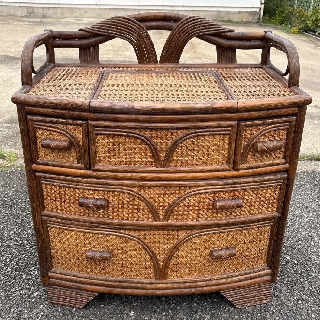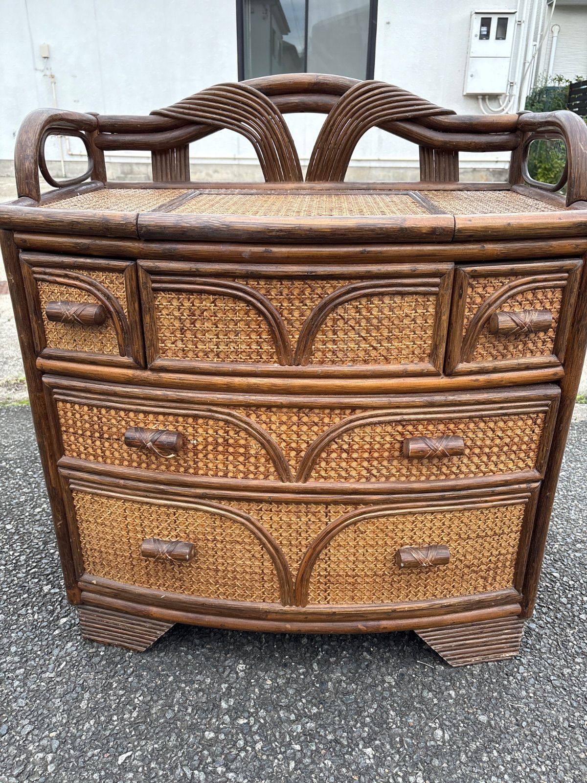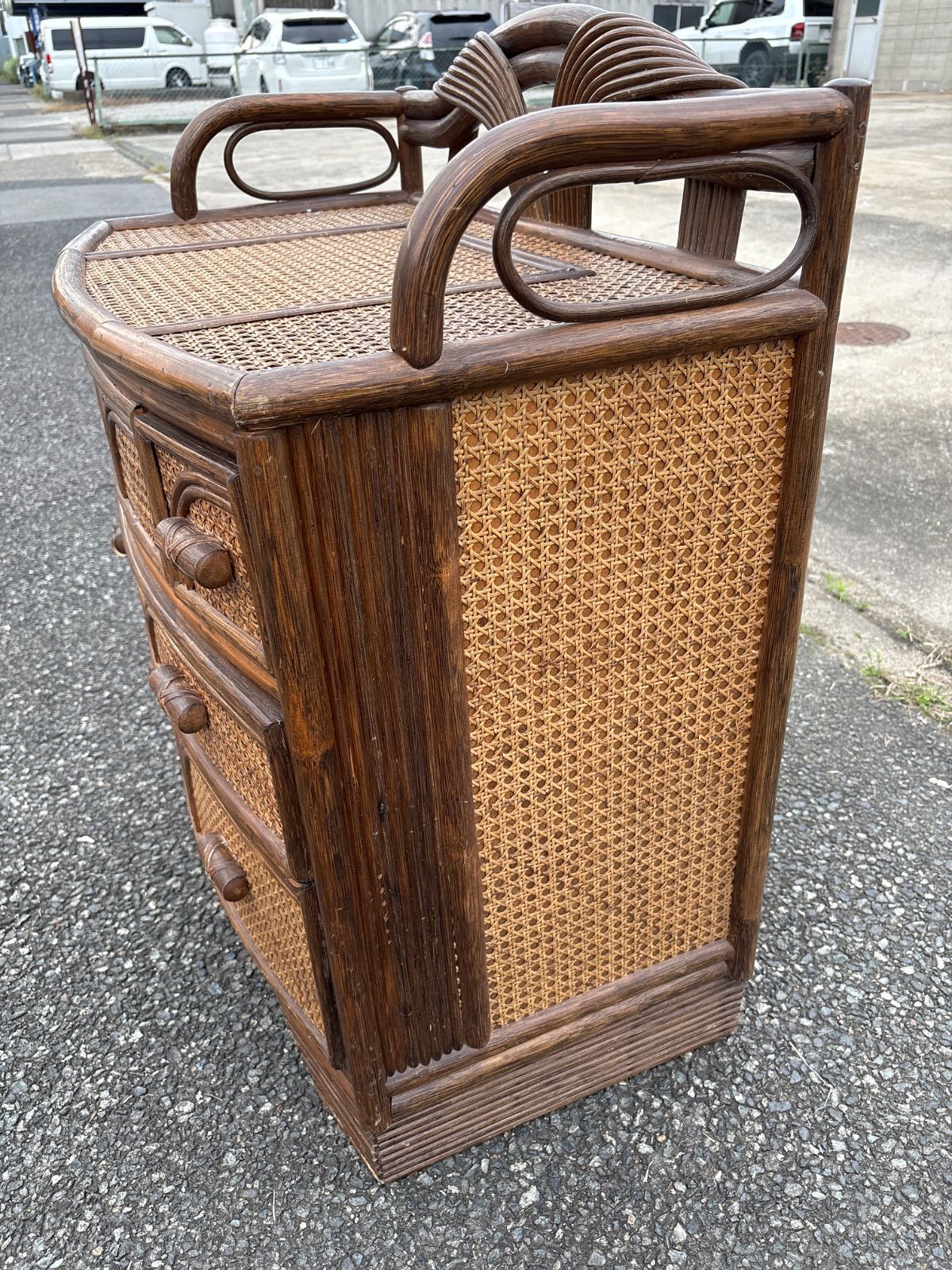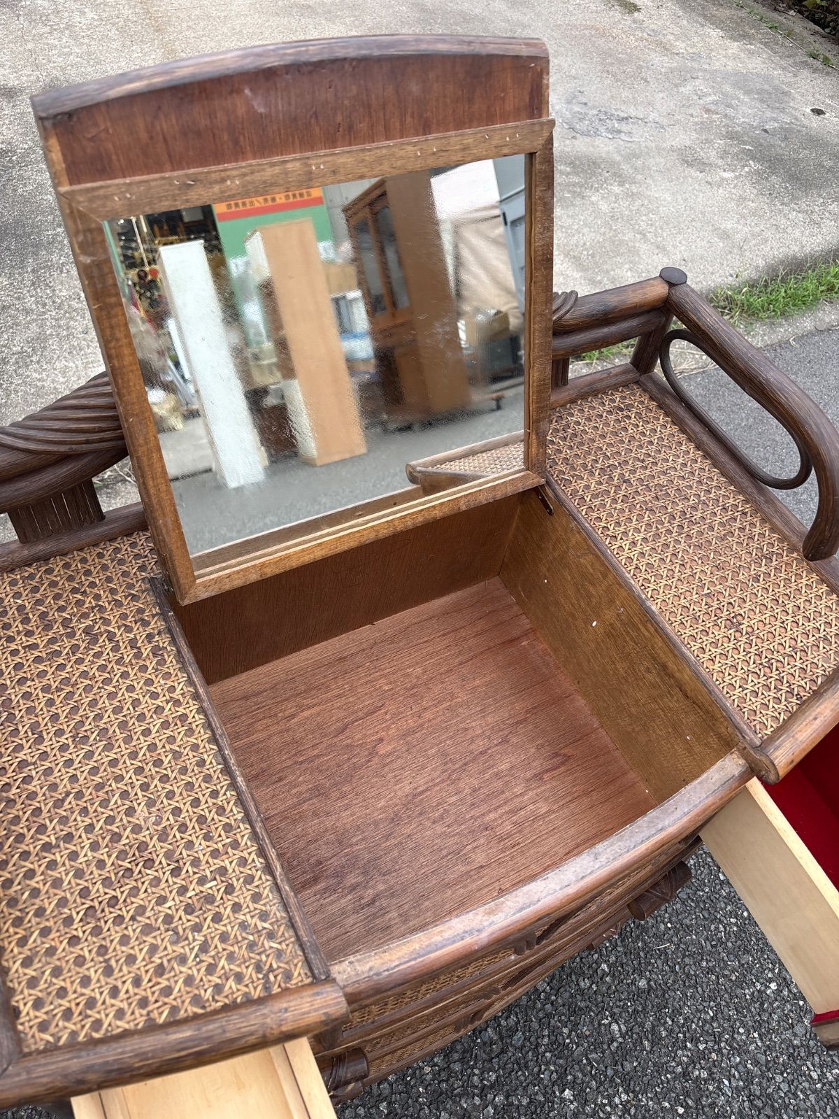 レトロ 鏡付き3段ラタンチェスト ドレッサー 収納棚 衣装 衣服 籐 天然素材 オールド レア 年代物 木製 茶色 焦茶 ブラウン