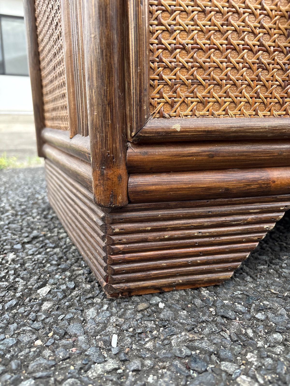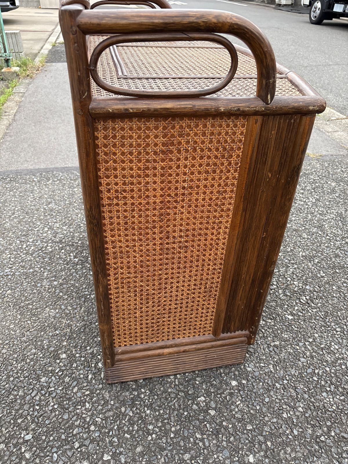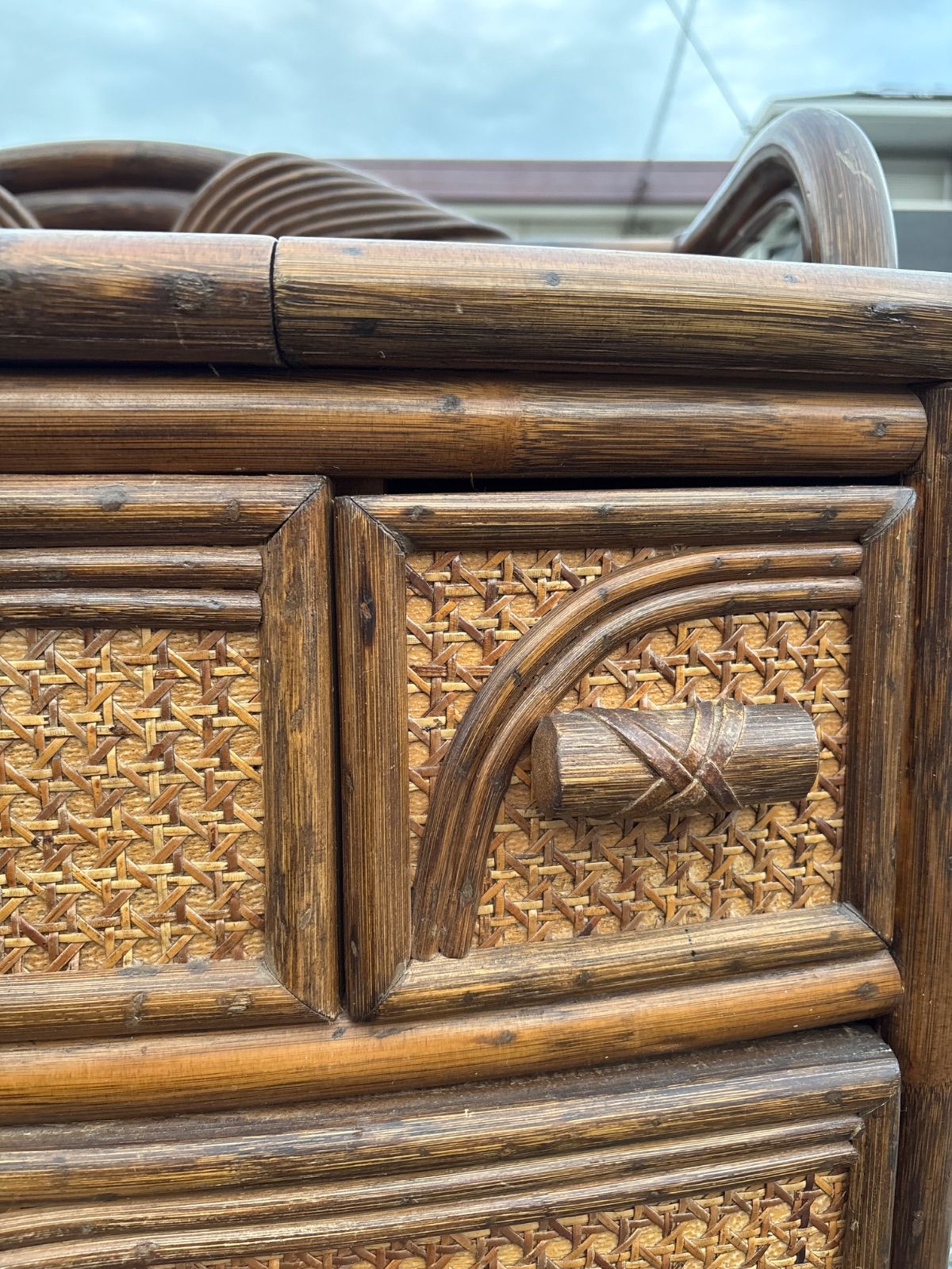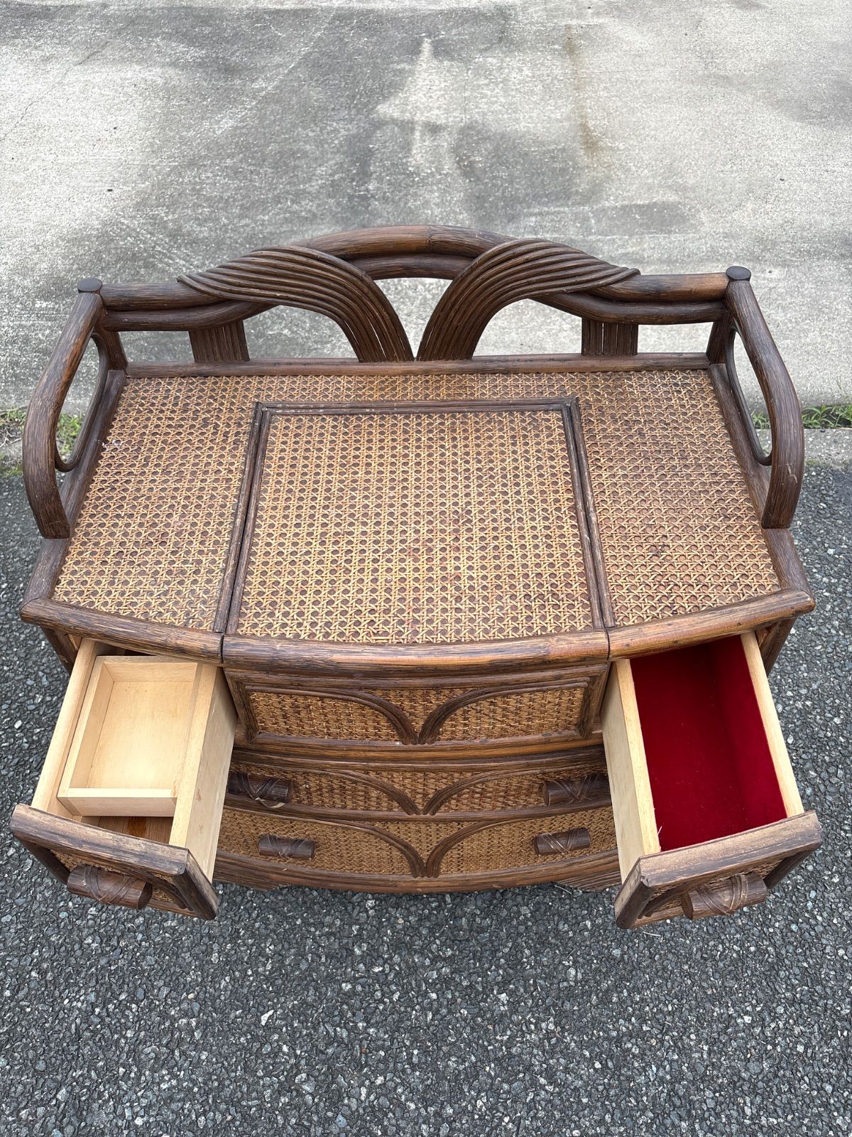 レトロ 鏡付き3段ラタンチェスト ドレッサー 収納棚 衣装 衣服 籐 天然素材 オールド レア 年代物 木製 茶色 焦茶 ブラウン
