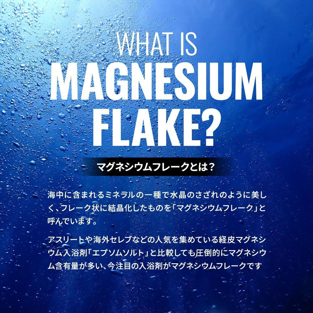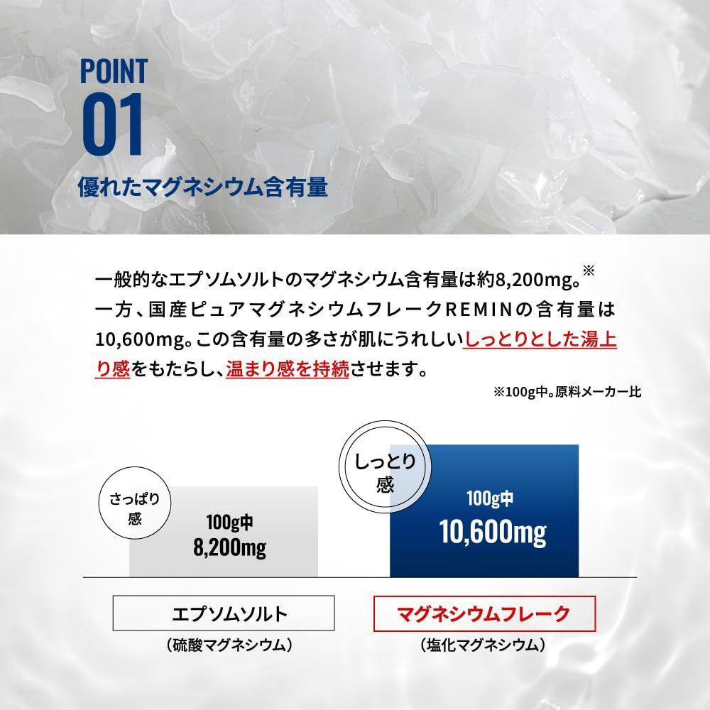 【マグネシウムフレークとは】マグネシウムフレークの正式な名称は塩化マグネシウム。海中に含まれるミネラルの一種で水晶のさざれのような美しいフレーク状の結晶をしたものを「マグネシウムフレーク」と呼んでいます。「にがり」の主成分でもあり、海水の塩分のうち9.6%がこの塩化マグネシウムにあたります。アスリートや海外セレブなどの人気を集めているマグネシウム系入浴剤「エプソムソルト」と比較しても圧倒的にマグネシウム含有量が多い、今注目の入浴剤がマグネシウムフレークです。【圧倒的なマグネシウム含有量】一般的な国産エプソムソルトのマグネシウム含有量は約8200mg(100g中)。一方、国産ピュアマグネシウムフレークREMINの含有量は10600mg(100g中)。この含有量の多さが肌にうれしいしっとりとした湯上り感をもたらし、温まり感が持続します。※原料メーカー比