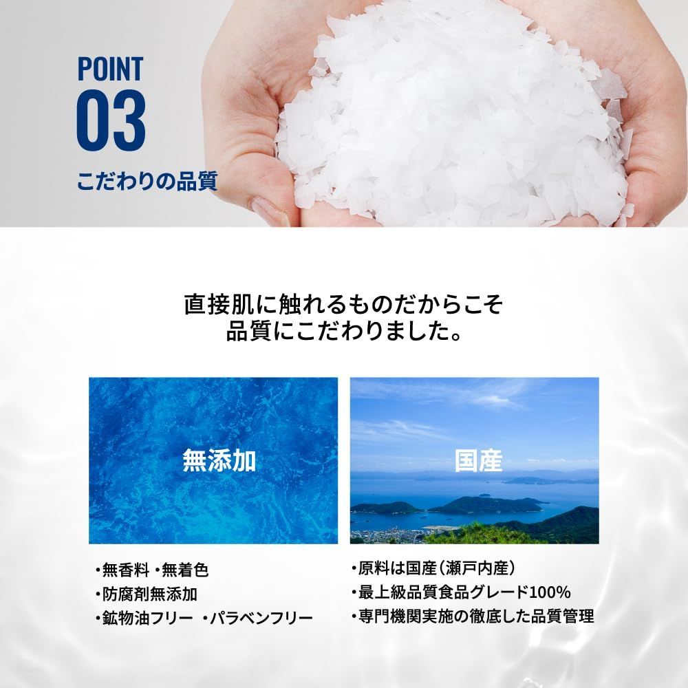 【こだわりの無添加】直接肌に触れるものだからこそ無添加にこだわりました。REMINは無香料、無着色、防腐剤無添加、パラベンフリー、鉱物油フリーです。【専門機関実施による品質検査】厚生労働省指定検査機関による成分分析をはじめ、重金属検査や放射性物質検査も実施。東京都知事の認可を受けた提携化粧品製造工場にて製造。徹底した品質管理のもと製品化されています。原料は国産(瀬戸内産)のみを使用。最上級品質である食品グレード100%のピュアマグネシウムフレークです。