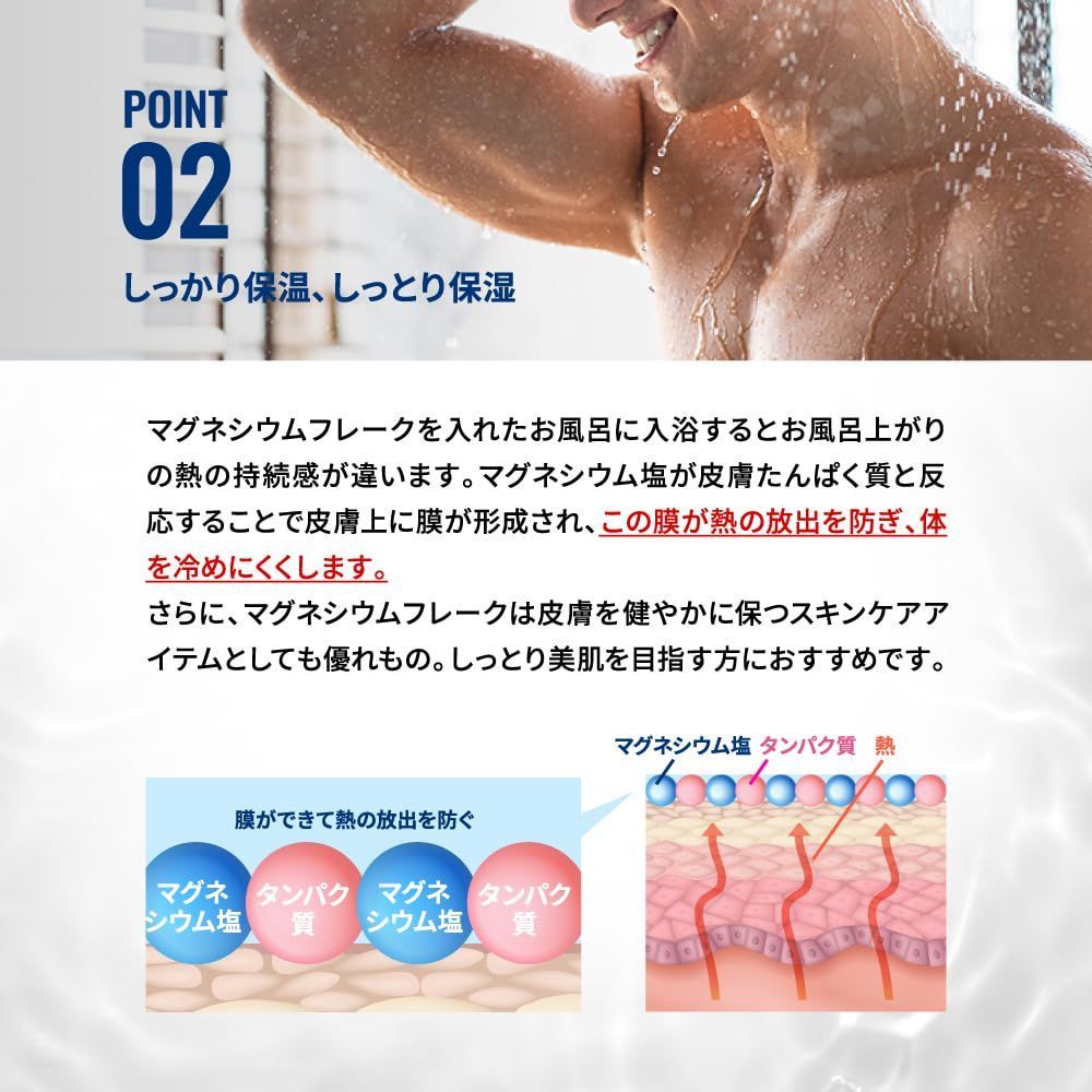 【お風呂上りが楽しみになるバスタイムを】マグネシウムフレークを入れたお風呂に入浴するとお風呂上がりの熱の持続感が違います。マグネシウムフレークを溶かしたお湯に含まれるマグネシウム塩が皮膚たんぱく質と反応することで皮膚の上に膜ができます。この膜が体の熱を冷めにくくするのです。さらに、マグネシウムフレークは皮膚を健やかに保つスキンケアアイテムとしても優れもの。お風呂上がりの肌に触るのが楽しみになることでしょう。