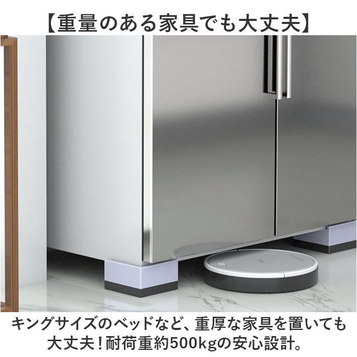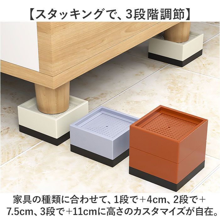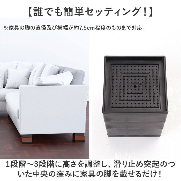 【ブランド名】 ノーブランド NO BRAND 【商品名】 継ぎ脚 3段調整 4個セット 【商品説明】 【テーブルやベッドの高さ調節が自在】 家具の高さを“ちょい上げ”して、より暮らしやすく!取り付け簡単「継ぎ脚 3段調整 4個セット」 【スタッキングで、3段階調節】 家具の種類に合わせて、1段で+4cm、2段で+7.5cm、3段で+11cmに高さのカスタマイズが自在。 【勉強やテレワークの効率がUP!】 デスクの高さを調整して姿勢改善や目の疲れ防止に。お子様の成長に合わせて勉強机の高さUPにも。 【ロボット掃除機で家事が時短に】 ベッドやソファ下に収納スペースが確保でき、ロボット掃除機がスムーズに通れる高さに楽々調節。 【高さを変えて、より身体に優しく!】 こたつで座椅子を使いたい時、テーブルセッティングの際に腰を屈めるのがつらい時にも大活躍。 【誰でも簡単セッティング!】 ・1段階~3段階に高さを調整し、滑り止め突起のついた中央の窪みに家具の脚を載せるだけ! ※家具の脚の直径及び横幅が約7.5cm程度のものまで対応。 【重量のある家具でも大丈夫】 キングサイズのベッドなど、重厚な家具を置いても大丈夫!耐荷重約500kgの安心設計。 【床を傷めず、滑りにくい】 底面にTPUゴム製の滑り止めカバー付き。家具がしっかり安定し、床面も傷つけないから安心。 【家具に合わせてすっきりコーデ】 テーブルやベッド等、一般的な家具の脚を載せて同じカラーでコーディネートできる4点セット。 【お部屋に馴染むモノトーンカラー】 落ち着きのあるインテリアにすんなり馴染む、シンプルなカラーバリエーションも魅力のひとつ。 【素材】 樹脂ファイバープラスチック、TPU 【生産国】 中国 【サイズ】 【1段の内寸】 [縦]約4cm/[横]約7.8cm/[奥行]約7.8cm 【1段の大きさ】 [縦]約4.8cm/[横]約8.4cm/[奥行]約8.4cm 【2段の大きさ】 [縦]約8.2cm/[横]約8.4cm/[奥行]約8.4cm 【3段の大きさ】 [縦]約11.5cm/[横]約8.4cm/[奥行]約8.4cm ※サイズは当店計測の実寸サイズです。実際の商品ならびにメーカー表記サイズとは多少の誤差が生じる場合がございます。あらかじめご了承ください。 【重量】 約1160g(※商品一式の重量です。) 【注意点】 海外輸入品のため、商品によってはパッケージや説明書が、英語や中国語表記となっている場合があります。商品を安価でご提供させていただくため、輸入時のパッケージのままでのお届けとなります。予めご了承くださいませ。 海外輸入品のため、パッケージに破れ、傷やへこみがある場合がございます。本体には問題ございませんので、予めご了承くださいませ。 商品の写真はできる限り実物のお色に近づけるように加工しておりますが、お使いのモニター設定、お部屋の照明などにより、実際の商品と異なる場合がございます。 商品や個体差などにより、表記と若干異なる場合がございますが、予めご了承くださいませ。 採寸方法の違いにより、多少の誤差がある場合がございます。 こちらの商品本体、及び商品についている印字やタグに関しては、海外メーカー独自のサイズ情報や表記になります。実際には、当社にて日本向けに正しい情報をページに掲載させて頂いております。