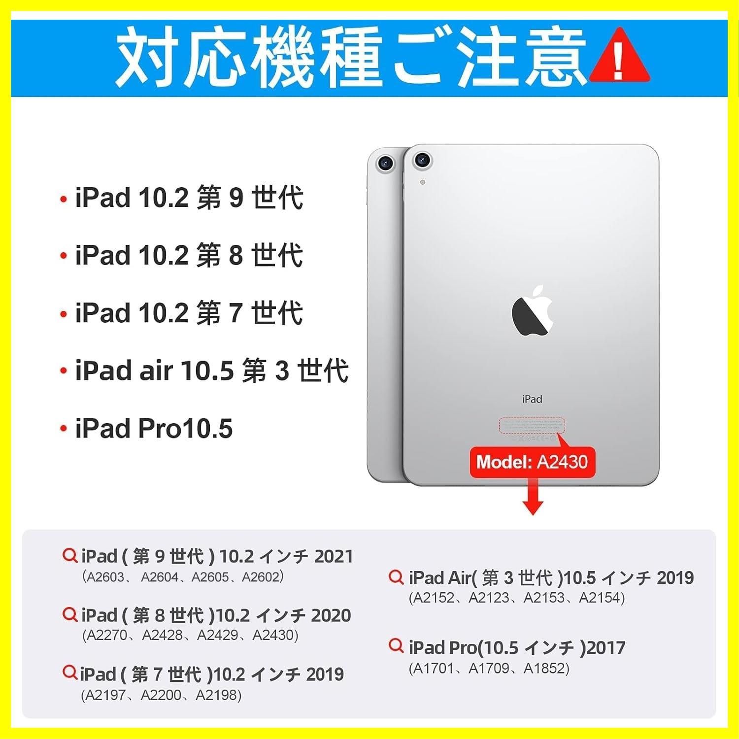 【対応機種】iPad 第9世代 10.2(2021年モデル:A2602、A2603、A2604、A2605)*iPad 第8世代 10.2(2020年モデル:A2270、A2428、A2429、A2430)*iPad 第7世代 10.2(2019年モデル:A2197、A2200、A2198) *iPad Air3 10.5(2019年モデル:A2152、A2123、A2153、A2154) *iPad Pro 10.5(2017年モデル:A1701、A1709、A1852)に対応しています。ご注文前にアイパッド裏面のモデルを確認ください。ご注意:本製品はiPadとApple pencilを含めません。