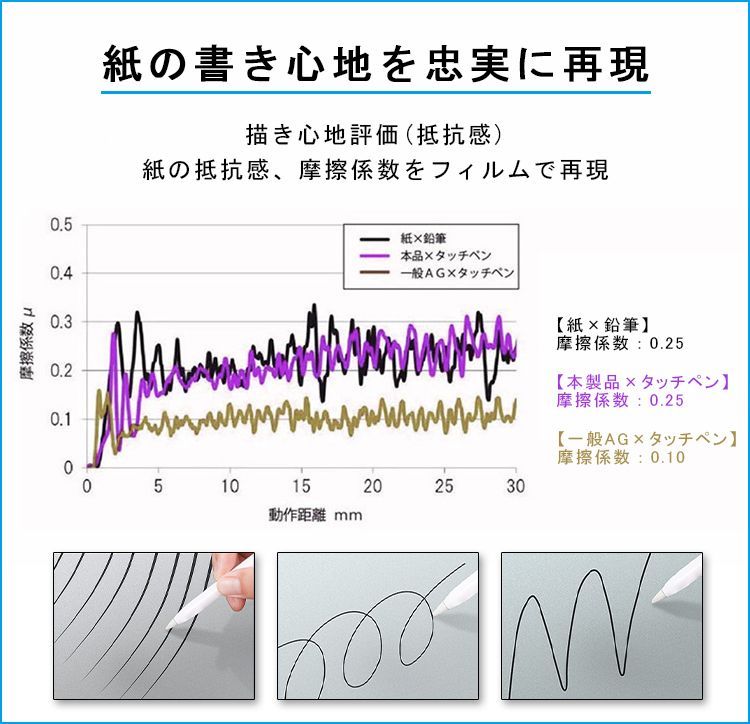 表面に紙のような適度な摩擦を与えた紙にペンで書くような感触。タッチペンを利用する方におすすめです。