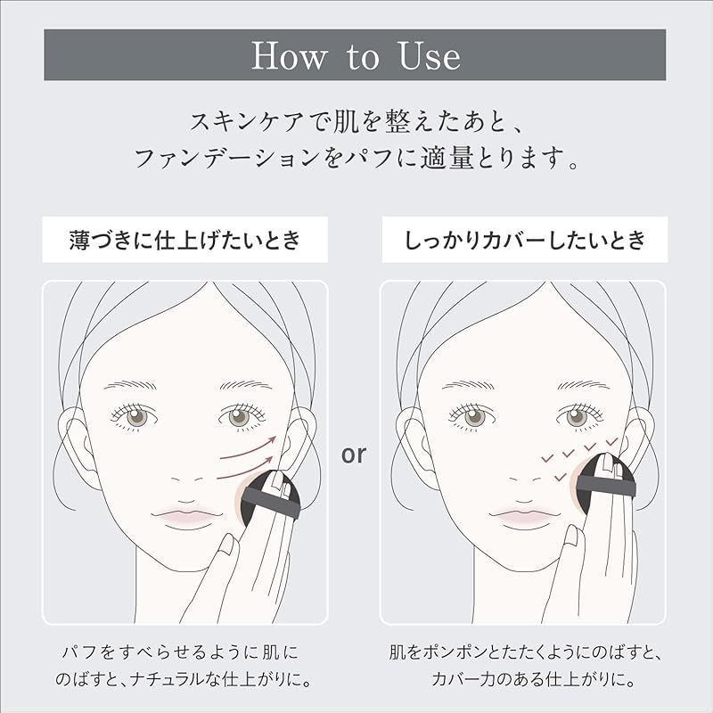 【使用方法】スキンケアなどで肌をととのえたあと、パフに適量をとり、肌にのばします。パフをすべらせるようにのばすとナチュラルな仕上がりに、肌をポンポンとたたくようにのばすとカバー力のある仕上がりになります。