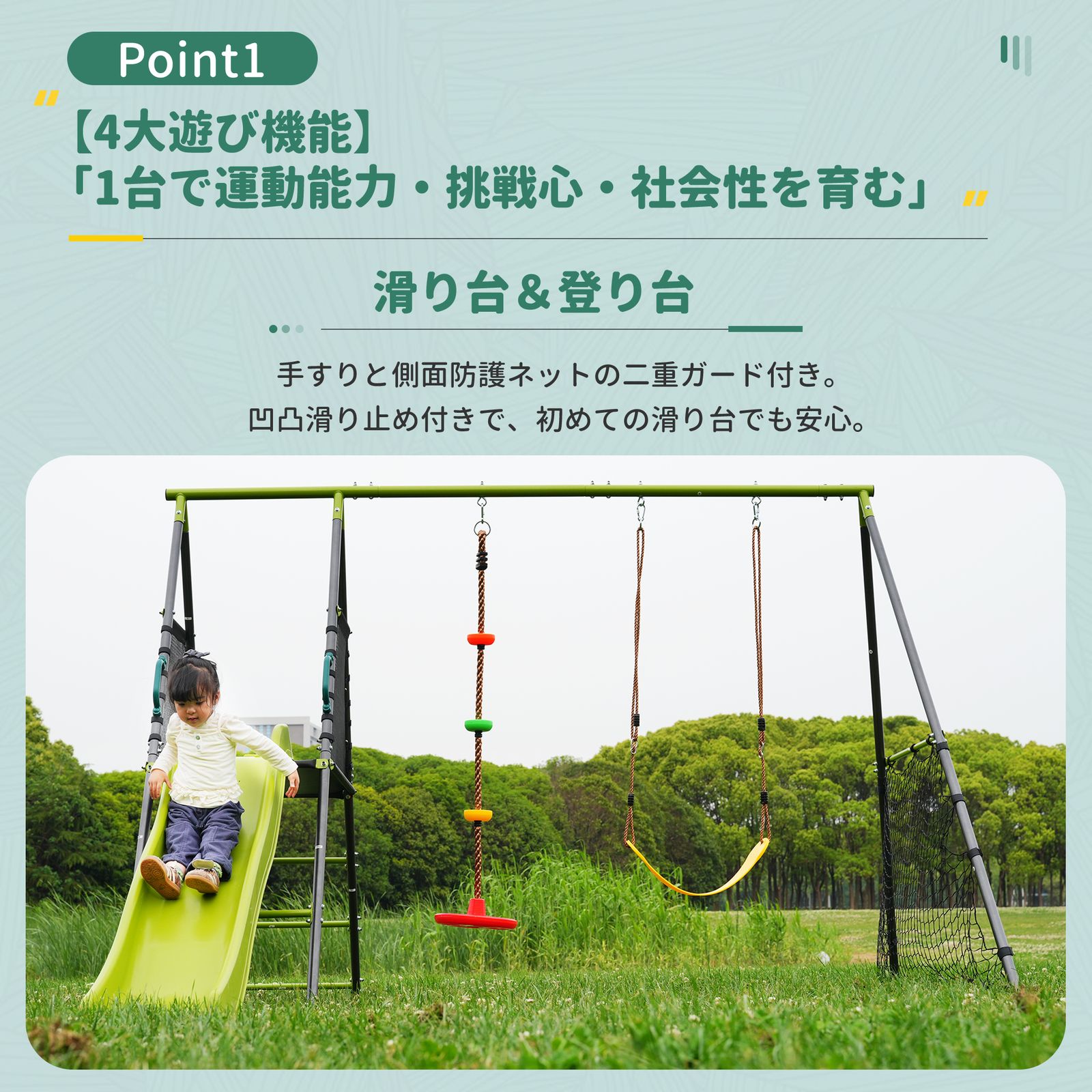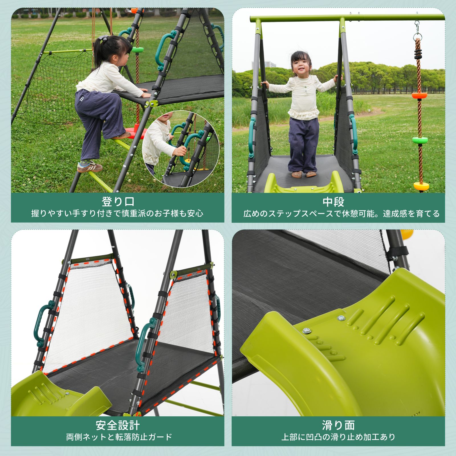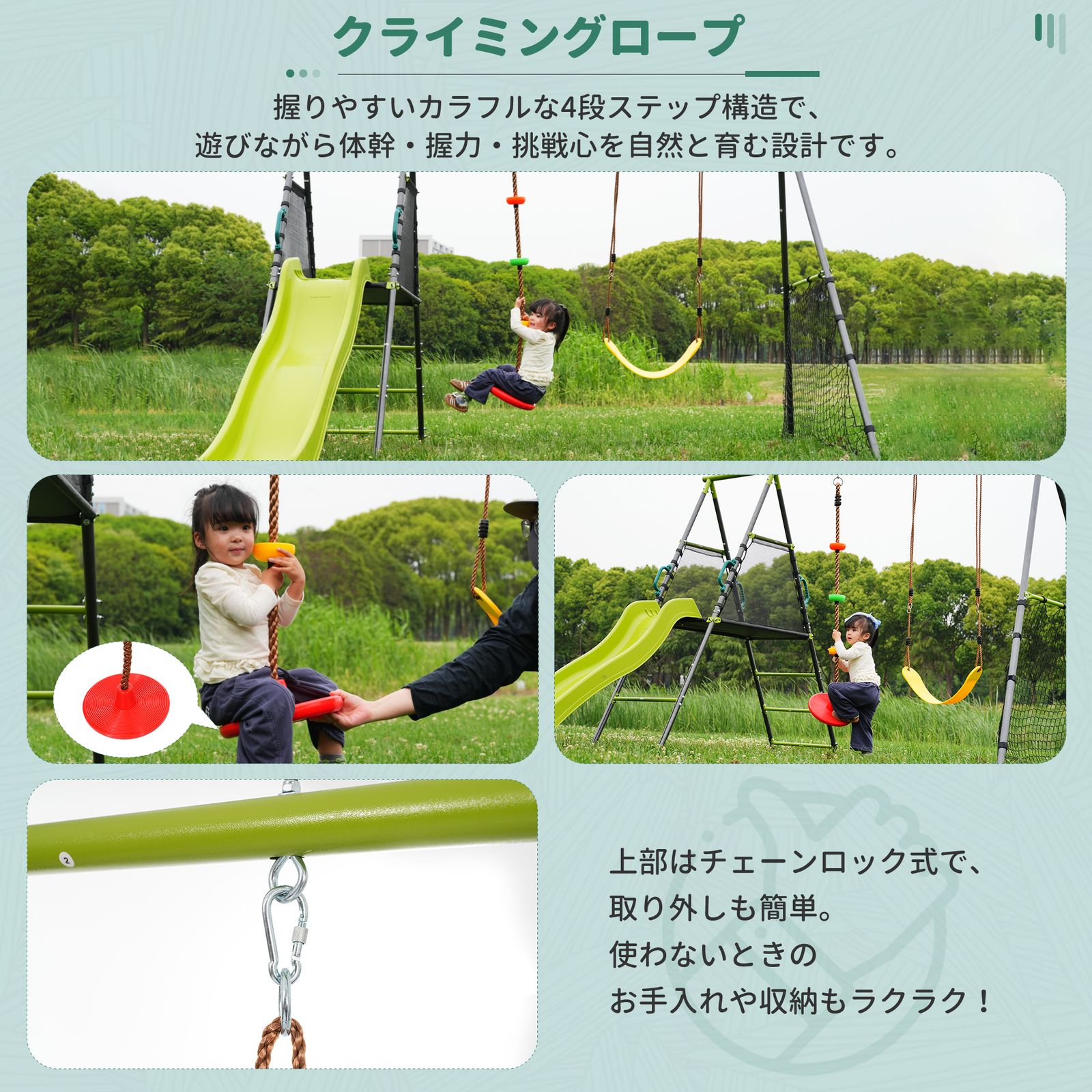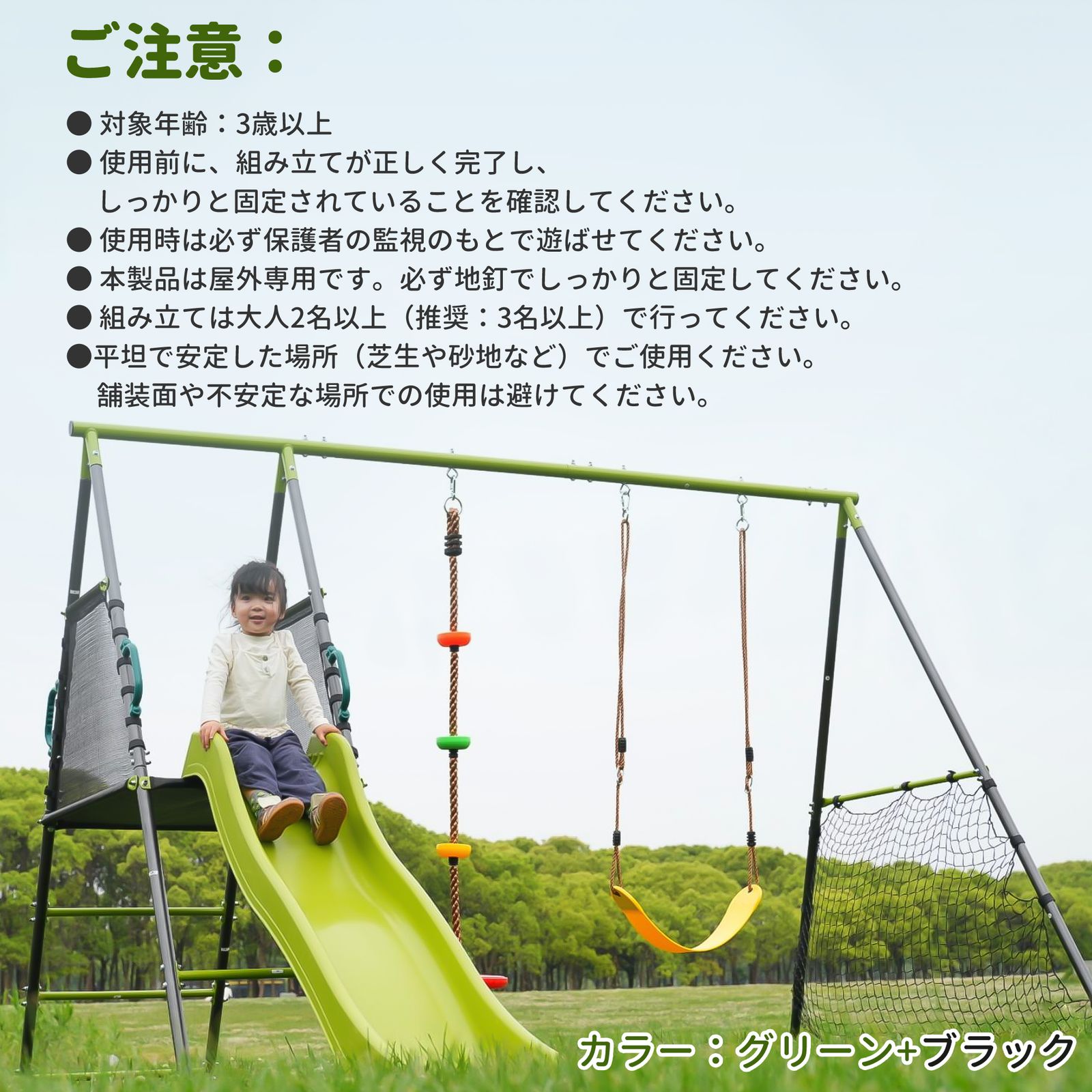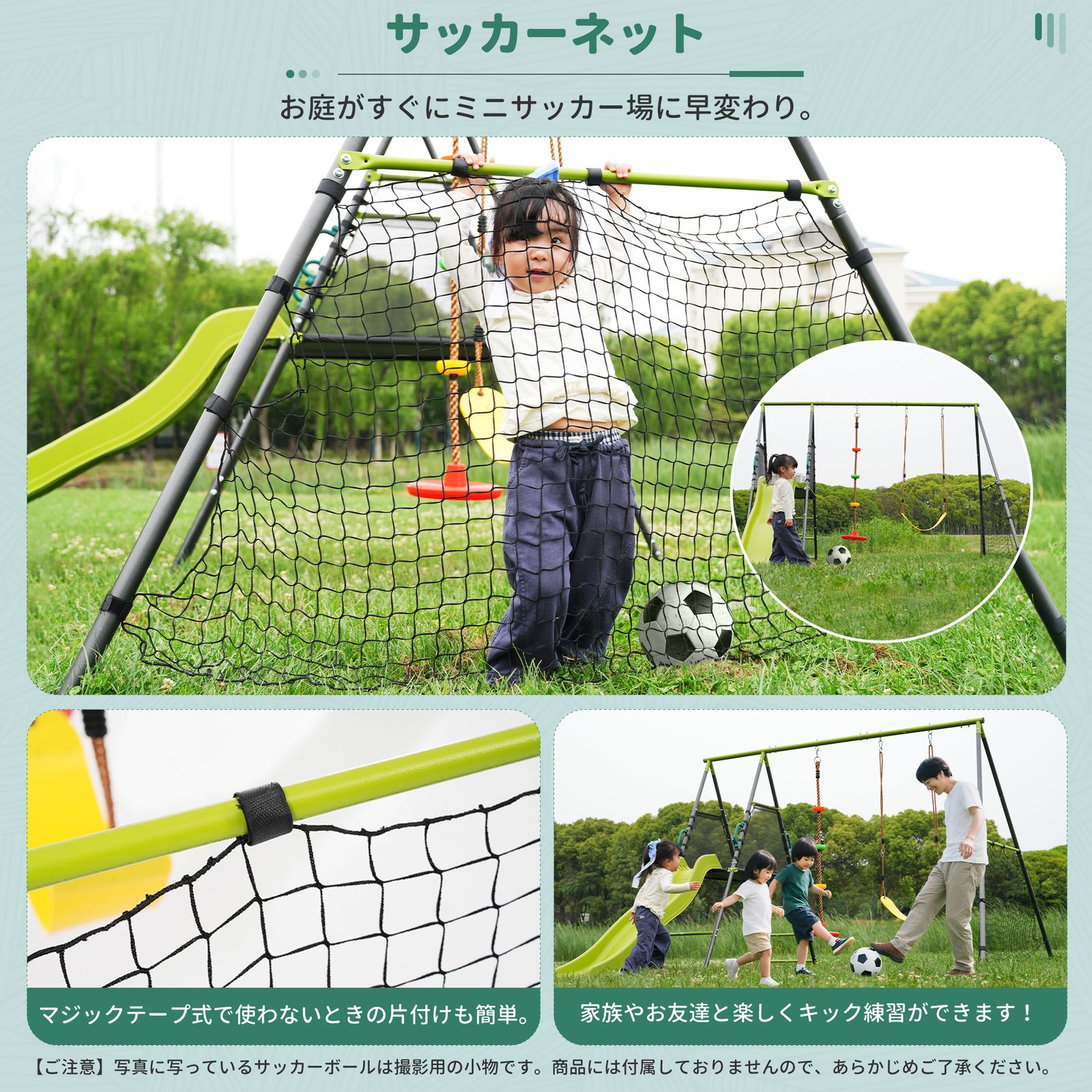 ◎02【4大遊び機能】「1台で運動能力・挑戦心・社会性を育む」滑り台&登り台:手すり+側面防護ネットの二重ガード付き。凹凸滑り止め付きで、初めての滑り台でも安心。登り口:握りやすい手すり付きで慎重派のお子様も安心中段:広めのステップスペースで休憩可能。達成感を育てる安全設計:両側ネット+転落防止ガード滑り面:上部に凹凸の滑り止め加工あり クライミングロープ握りやすいカラフルな4段ステップ構造で、遊びながら体幹・握力・挑戦心を自然と育む設計です。上部はチェーンロック式で、取り外しも簡単。使わないときのお手入れや収納もラクラク!ブランコ"高さ調節可能なロープで、3歳頃から小学生まで成長に合わせて使えます。 チェーンロック式金具で取り外しも簡単。使わないときはコンパクトに収納可能。サッカーネット マジックテープ式で使わないときの片付けも簡単。 お庭がすぐにミニサッカー場に早変わり。家族やお友達と楽しくキック練習ができます!