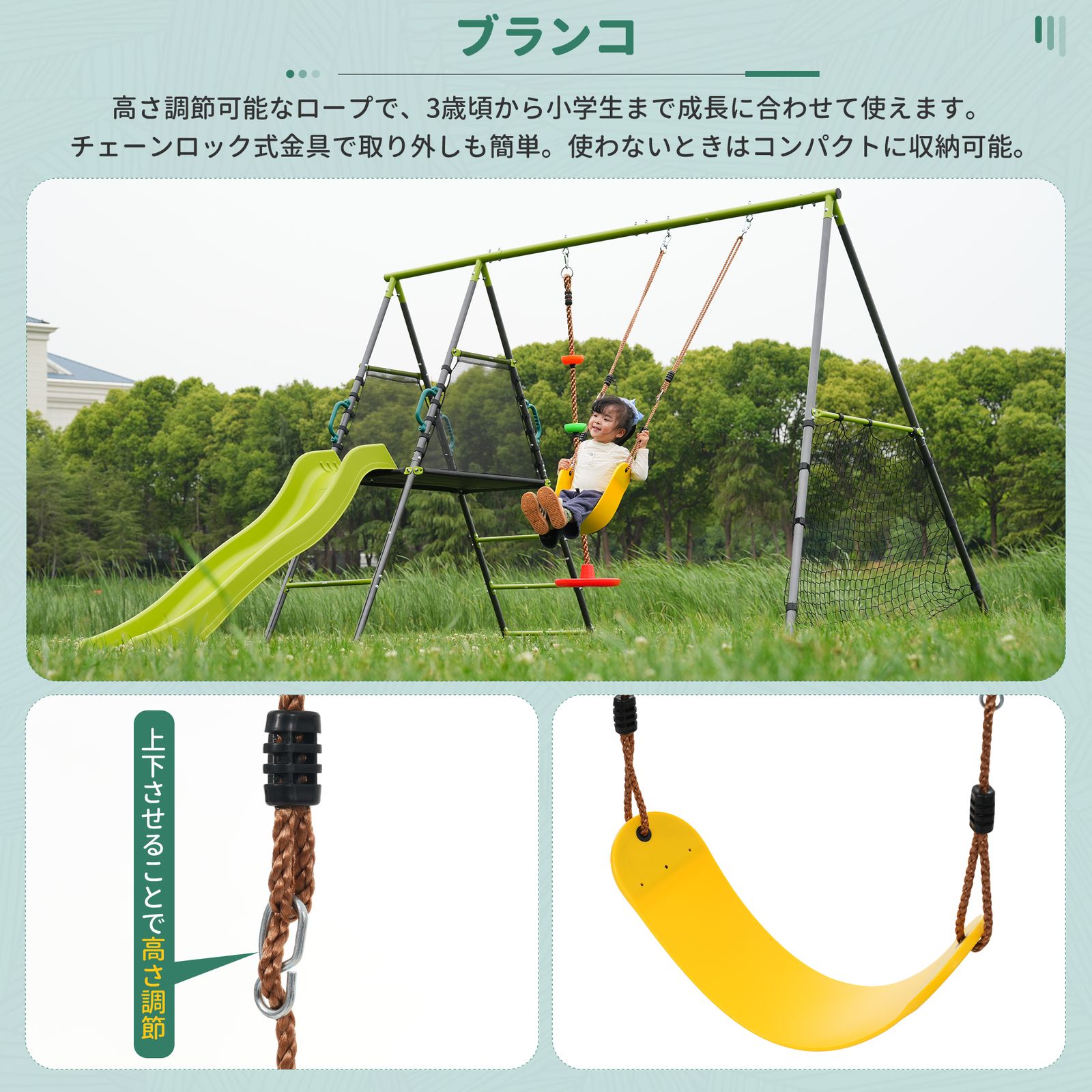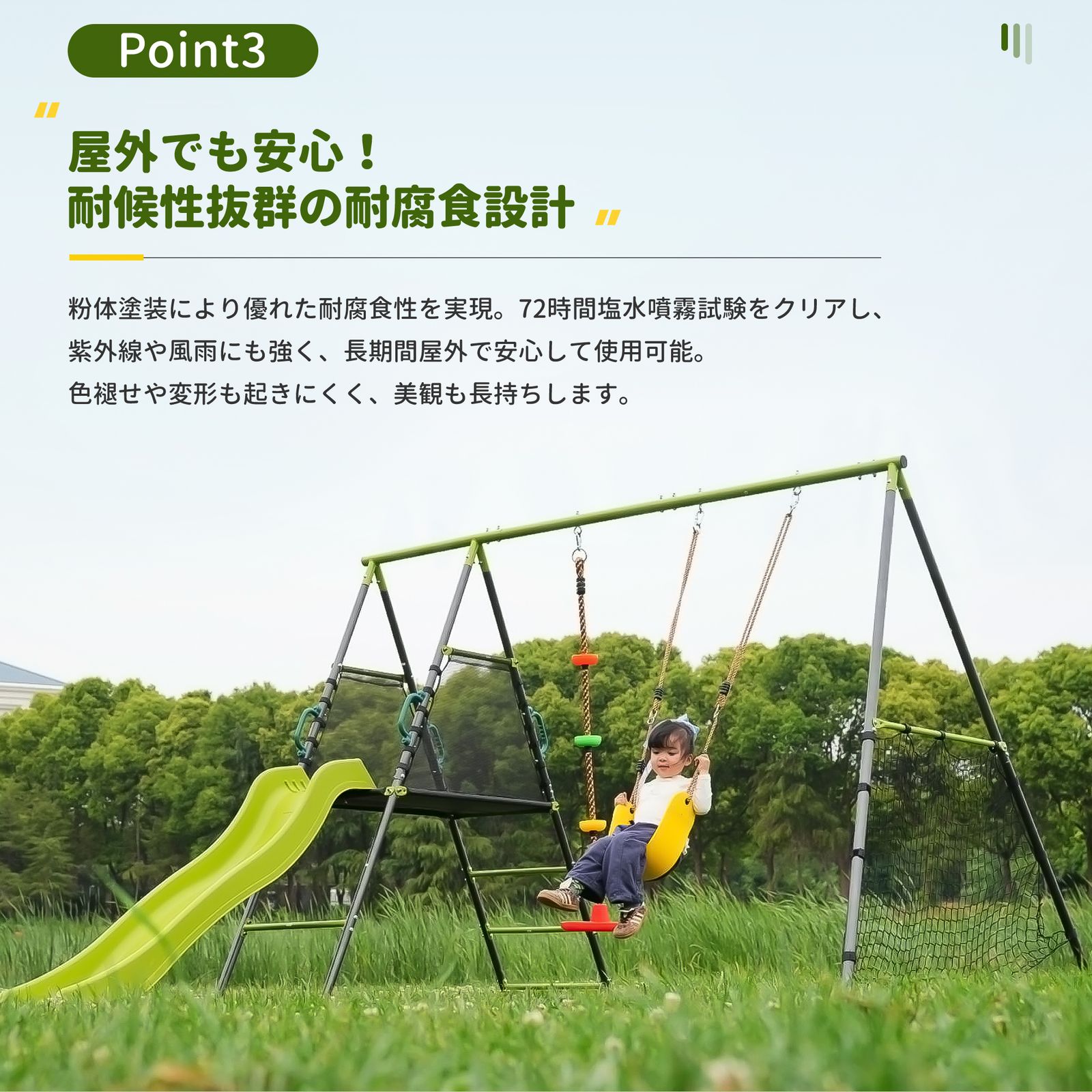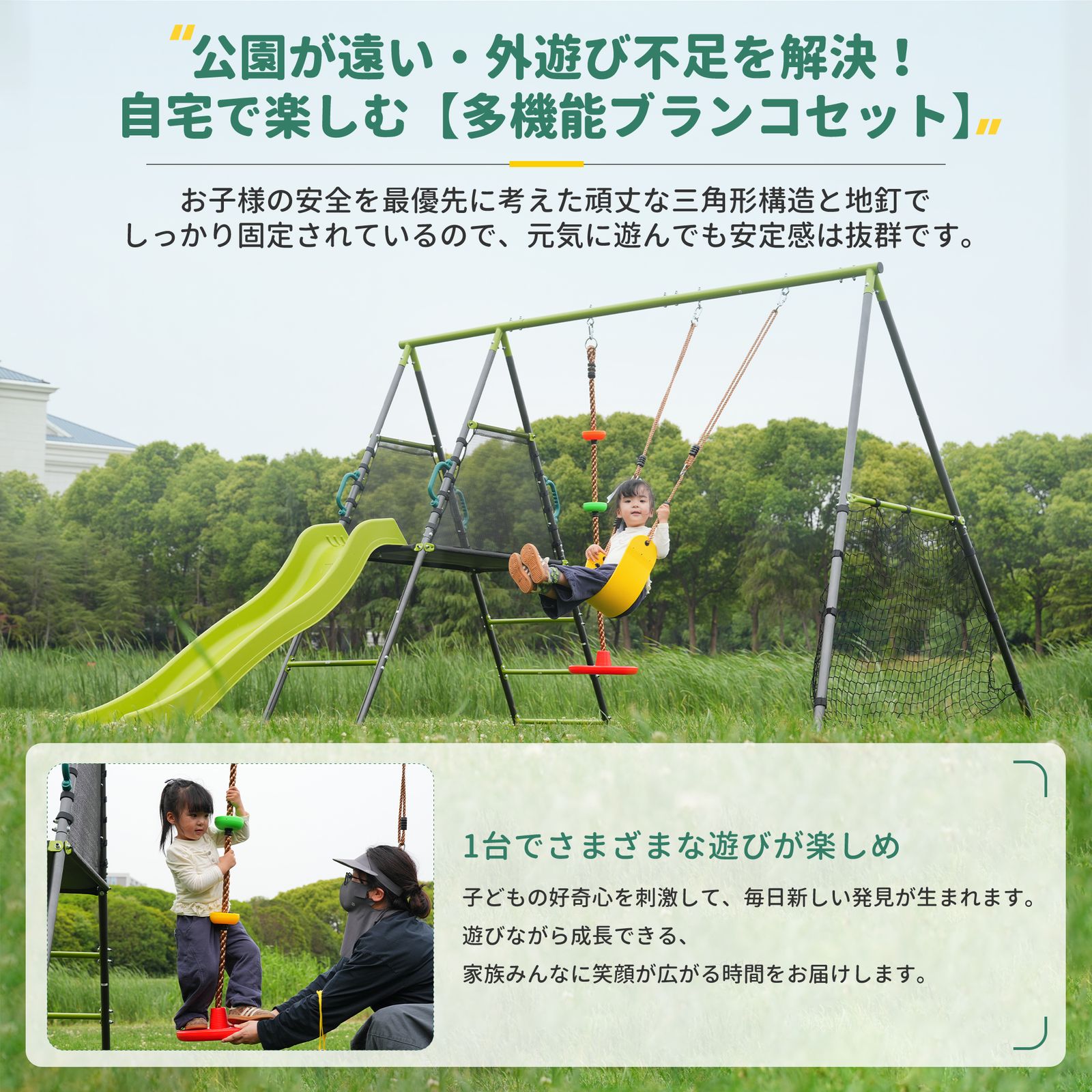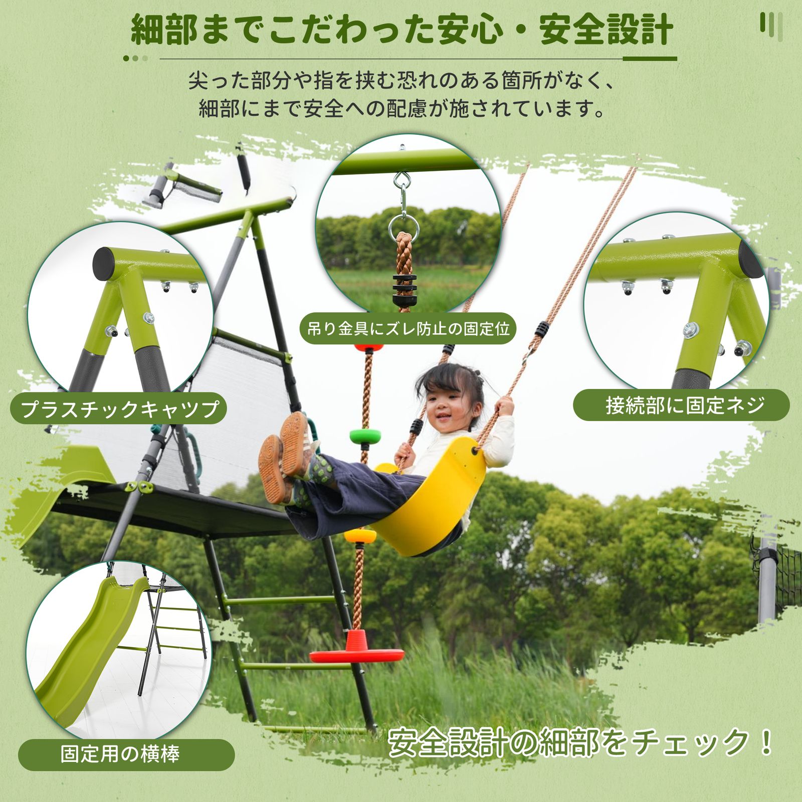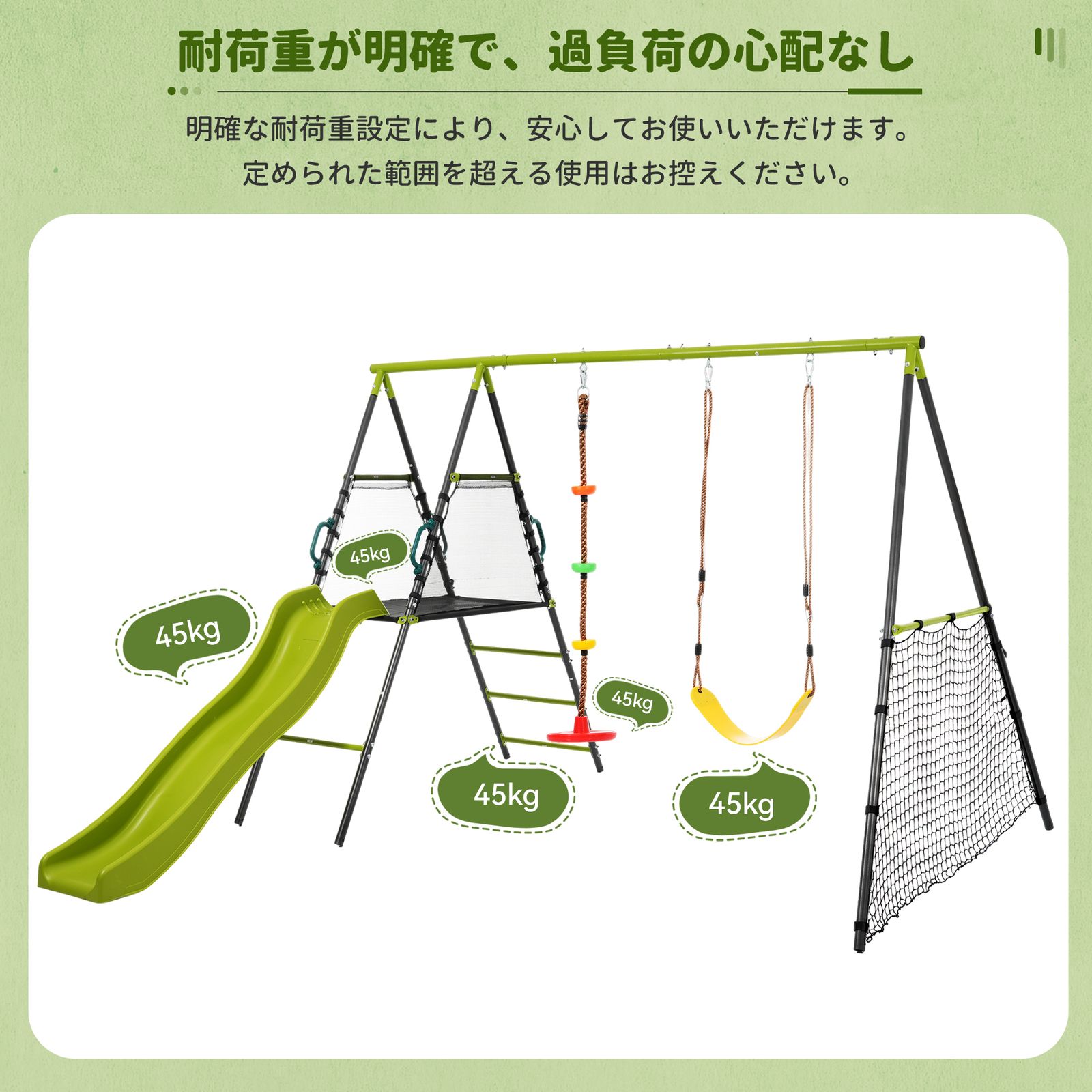 ◎02【4大遊び機能】「1台で運動能力・挑戦心・社会性を育む」滑り台&登り台:手すり+側面防護ネットの二重ガード付き。凹凸滑り止め付きで、初めての滑り台でも安心。登り口:握りやすい手すり付きで慎重派のお子様も安心中段:広めのステップスペースで休憩可能。達成感を育てる安全設計:両側ネット+転落防止ガード滑り面:上部に凹凸の滑り止め加工あり クライミングロープ握りやすいカラフルな4段ステップ構造で、遊びながら体幹・握力・挑戦心を自然と育む設計です。上部はチェーンロック式で、取り外しも簡単。使わないときのお手入れや収納もラクラク!ブランコ"高さ調節可能なロープで、3歳頃から小学生まで成長に合わせて使えます。 チェーンロック式金具で取り外しも簡単。使わないときはコンパクトに収納可能。サッカーネット マジックテープ式で使わないときの片付けも簡単。 お庭がすぐにミニサッカー場に早変わり。家族やお友達と楽しくキック練習ができます!